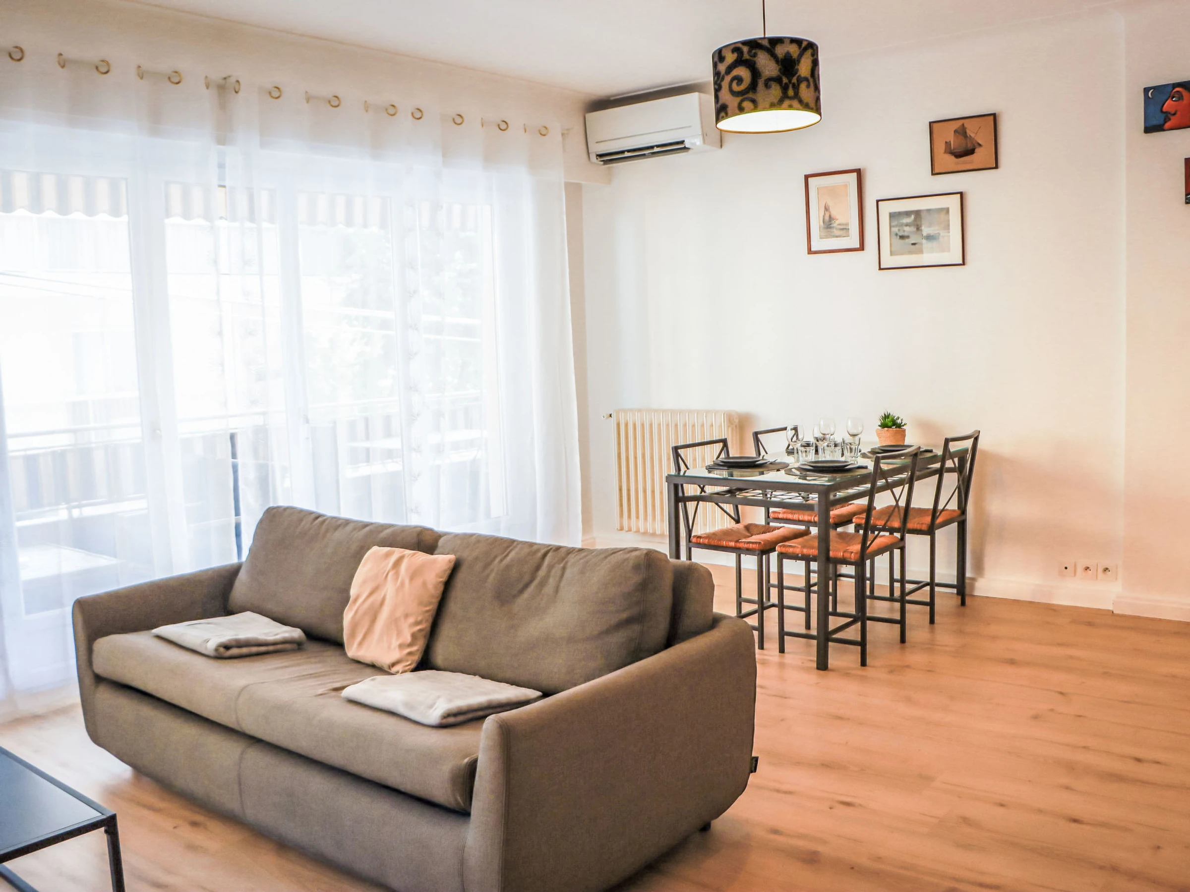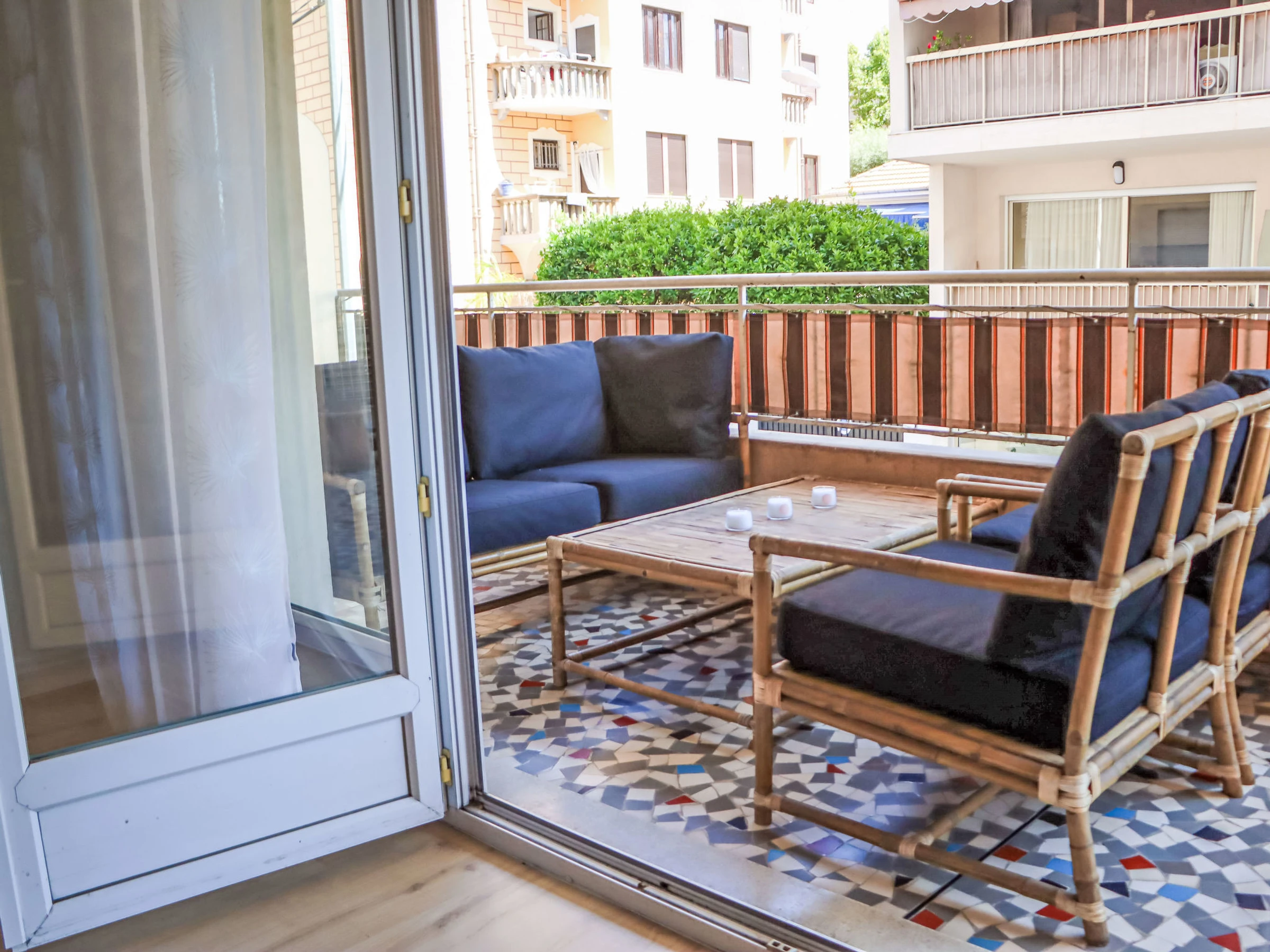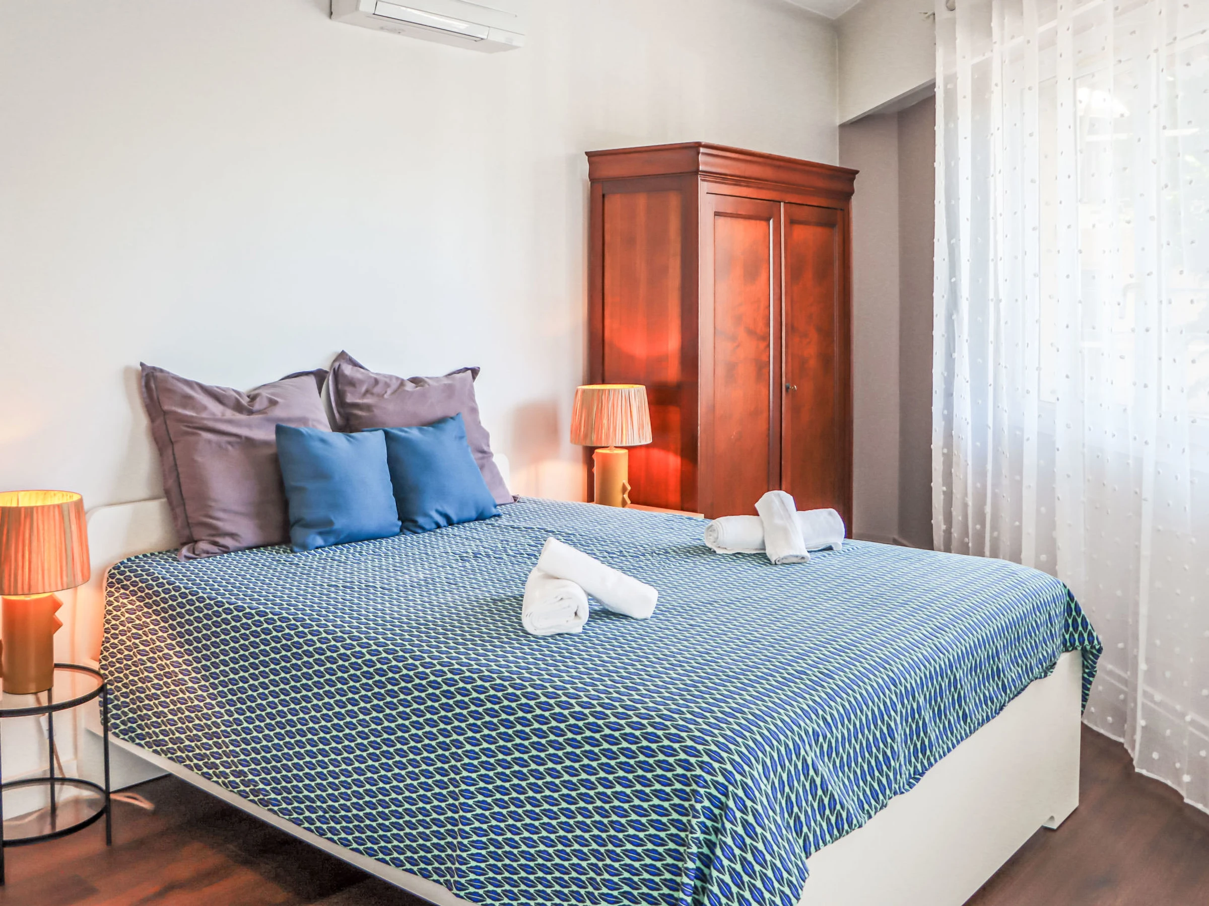 "Au soleil bleu", 3-Zimmer-Wohnung [hidden] m2 im 1. Stock. Geräumig und hell, sehr schön eingerichtet: grosses Wohn-/Esszimmer mit 1 Doppeldiwanbett ([hidden] cm, Länge [hidden] cm), TV (Flachbildschirm), Klimaanlage. Ausgang zum Balkon. 2 grosse Zimmer, jedes Zimmer mit 1 franz. Bett ([hidden] cm, Länge [hidden] cm), Klimaanlage. Küche (Backofen, Geschirrspüler, 3 Induktionskochplatten, Toaster, Wasserkocher, Mikrowelle, Tiefkühler, elektrische Kaffeemaschine). Ausgang zum Balkon. Bad, Bad/WC, sep. WC. G-Heizung. Balkon 17 m2, Ostlage. Zur Verfügung: Waschmaschine, Bügeleisen, Haartrockner. Internet (WLAN, gratis). Garage. Bitte beachten: Rauchmelder. Inserat einer Privatperson nach Artikel [hidden], IV, CGI. [hidden]