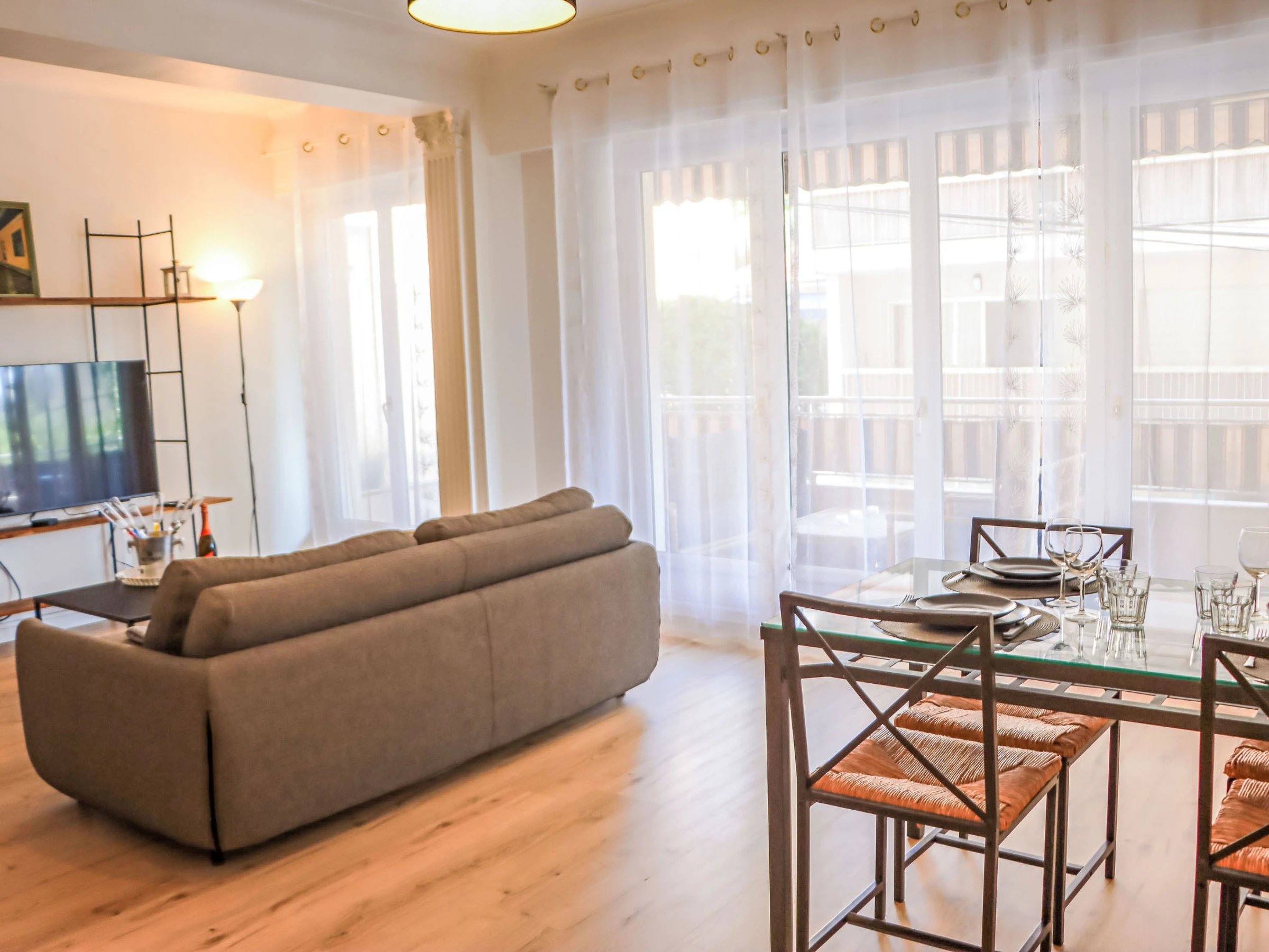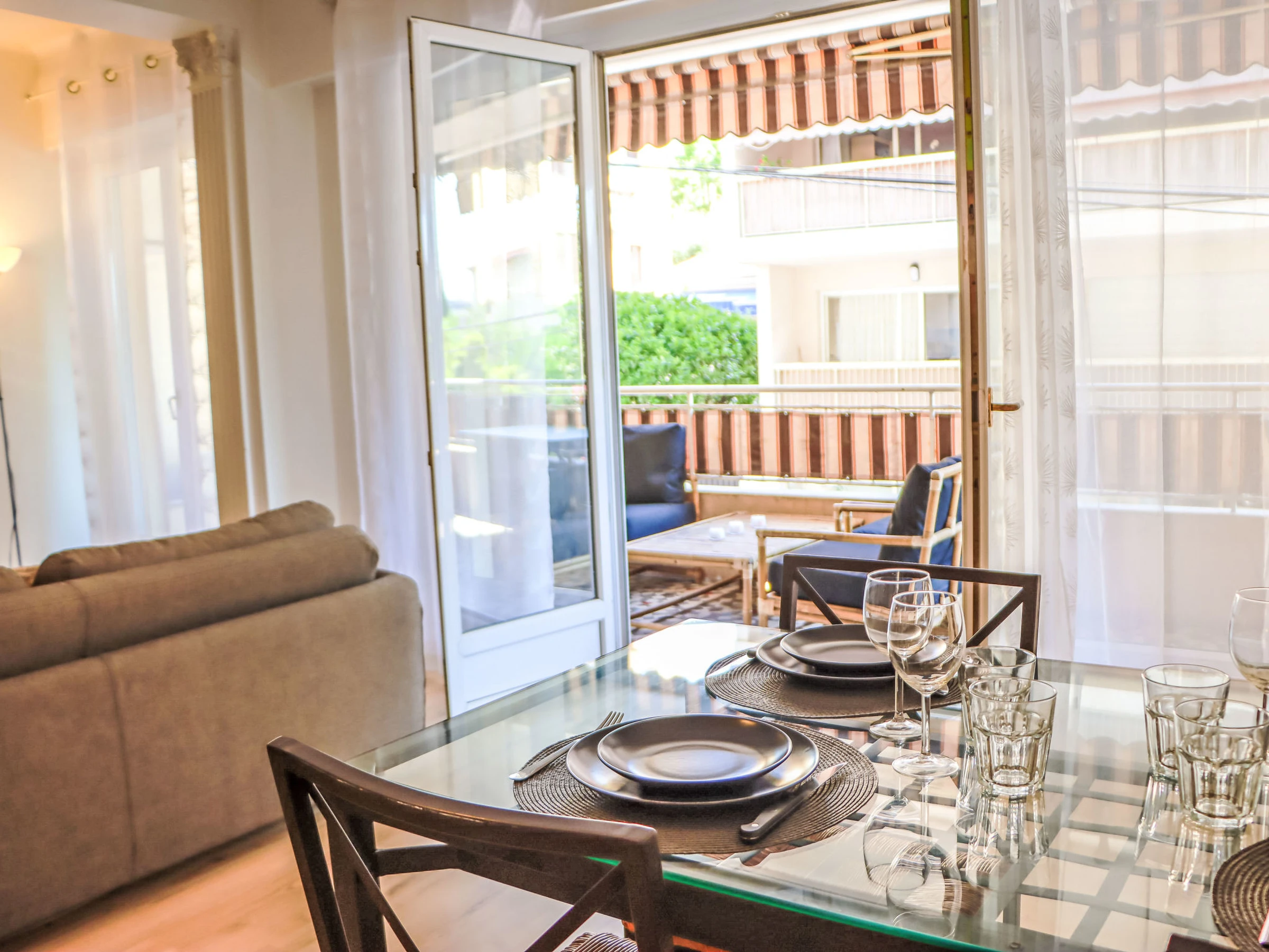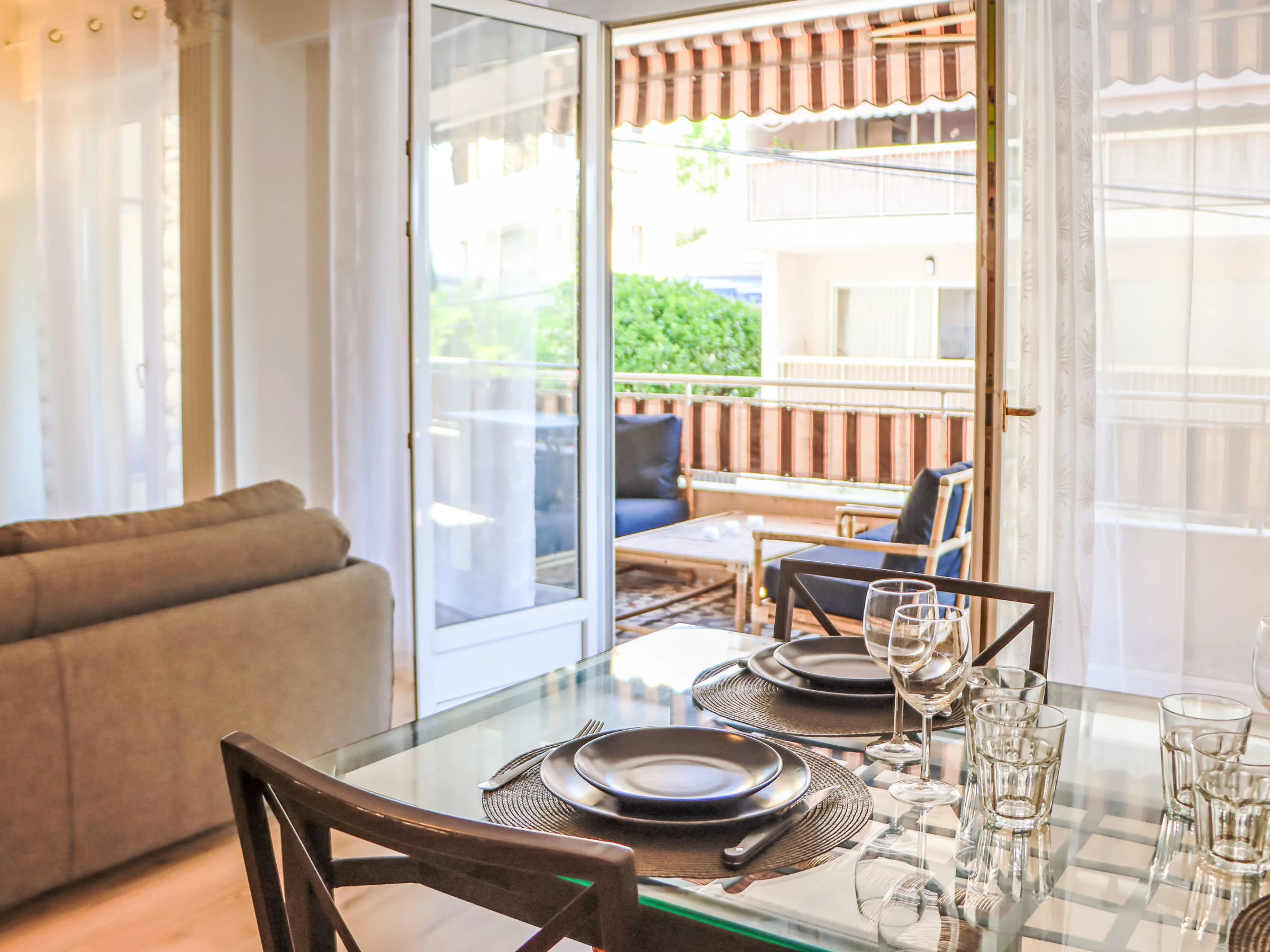 "Au soleil bleu", 3-Zimmer-Wohnung [hidden] m2 im 1. Stock. Geräumig und hell, sehr schön eingerichtet: grosses Wohn-/Esszimmer mit 1 Doppeldiwanbett ([hidden] cm, Länge [hidden] cm), TV (Flachbildschirm), Klimaanlage. Ausgang zum Balkon. 2 grosse Zimmer, jedes Zimmer mit 1 franz. Bett ([hidden] cm, Länge [hidden] cm), Klimaanlage. Küche (Backofen, Geschirrspüler, 3 Induktionskochplatten, Toaster, Wasserkocher, Mikrowelle, Tiefkühler, elektrische Kaffeemaschine). Ausgang zum Balkon. Bad, Bad/WC, sep. WC. G-Heizung. Balkon 17 m2, Ostlage. Zur Verfügung: Waschmaschine, Bügeleisen, Haartrockner. Internet (WLAN, gratis). Garage. Bitte beachten: Rauchmelder. Inserat einer Privatperson nach Artikel [hidden], IV, CGI. [hidden]