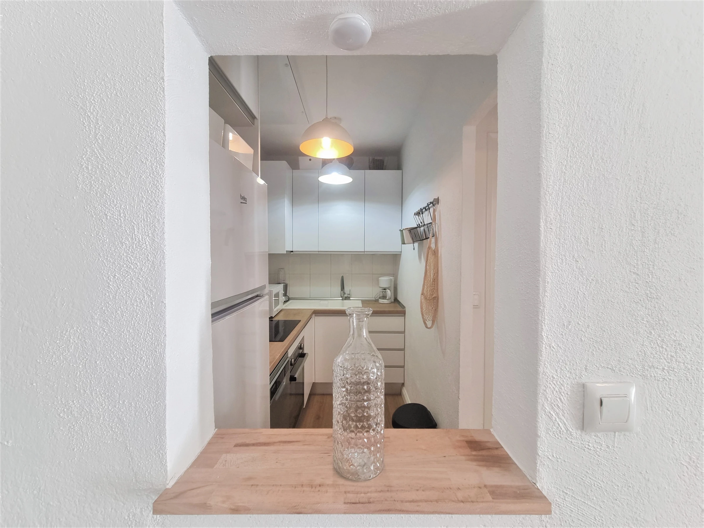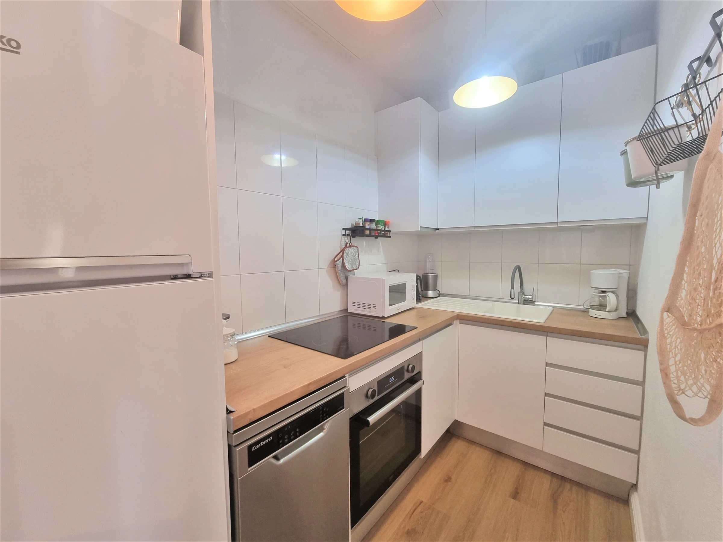 Dieses offene küche, mit ceranfeld, ist ausgestattet in kühlschrank, mikrowelle, backofen, gefrierschrank, spülmaschine, geschirr/besteck, kochutensilien, kaffeemaschine, toaster, wasserkocher und saftpresse.