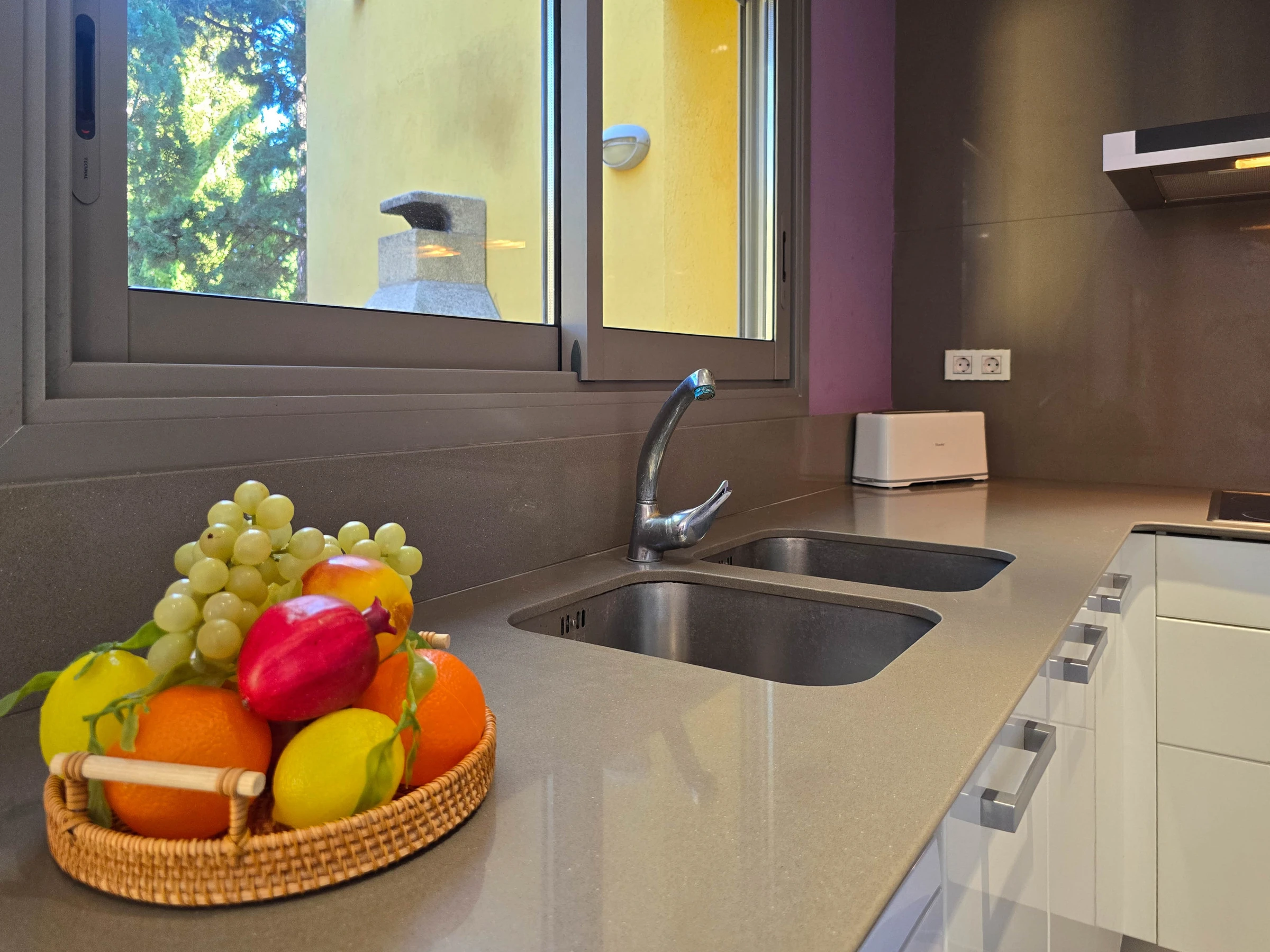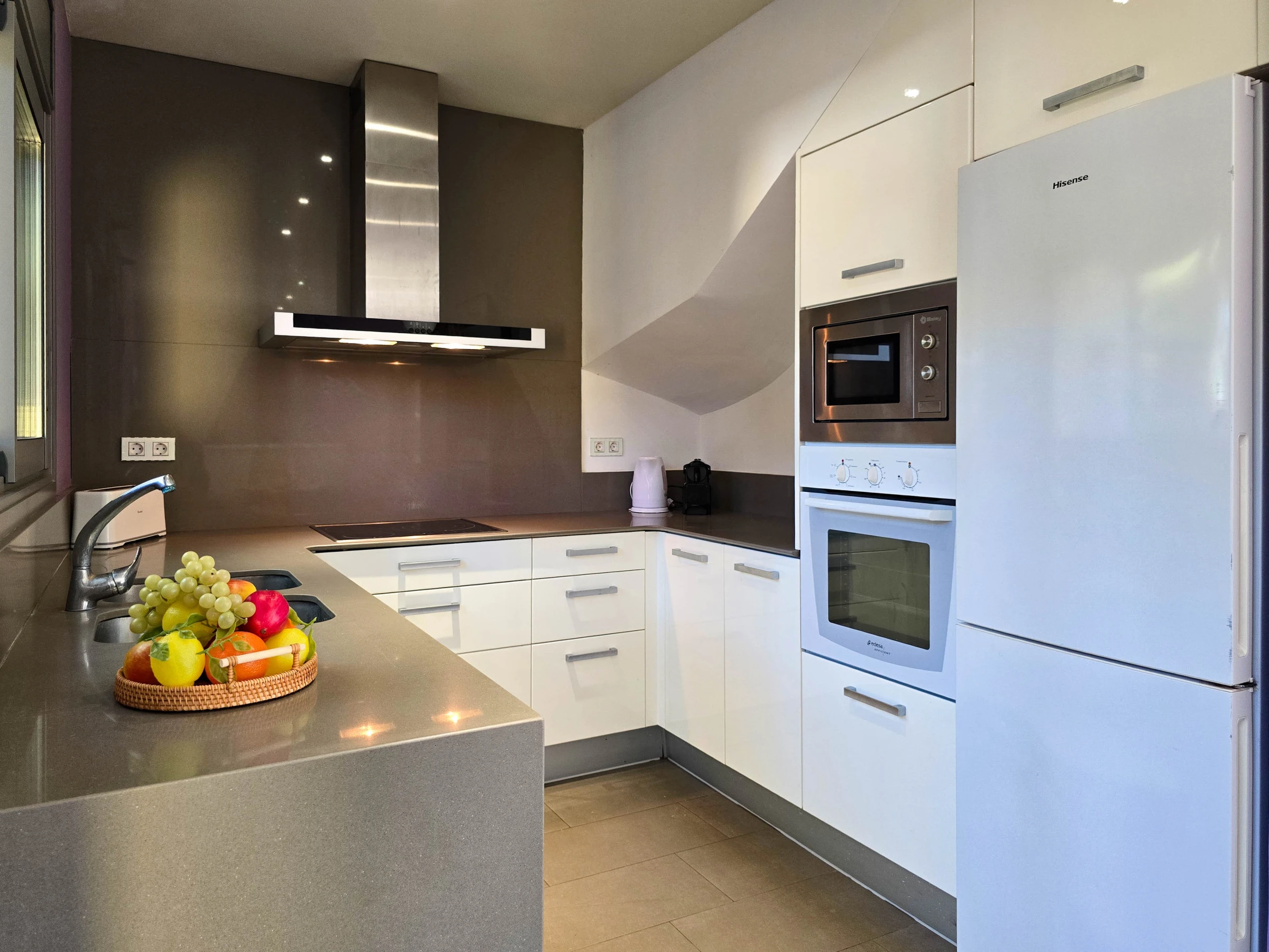 Dieses offene küche, mit ceranfeld, ist ausgestattet in kühlschrank, mikrowelle, backofen, gefrierschrank, spülmaschine, geschirr/besteck, kaffeemaschine, toaster, wasserkocher und saftpresse.