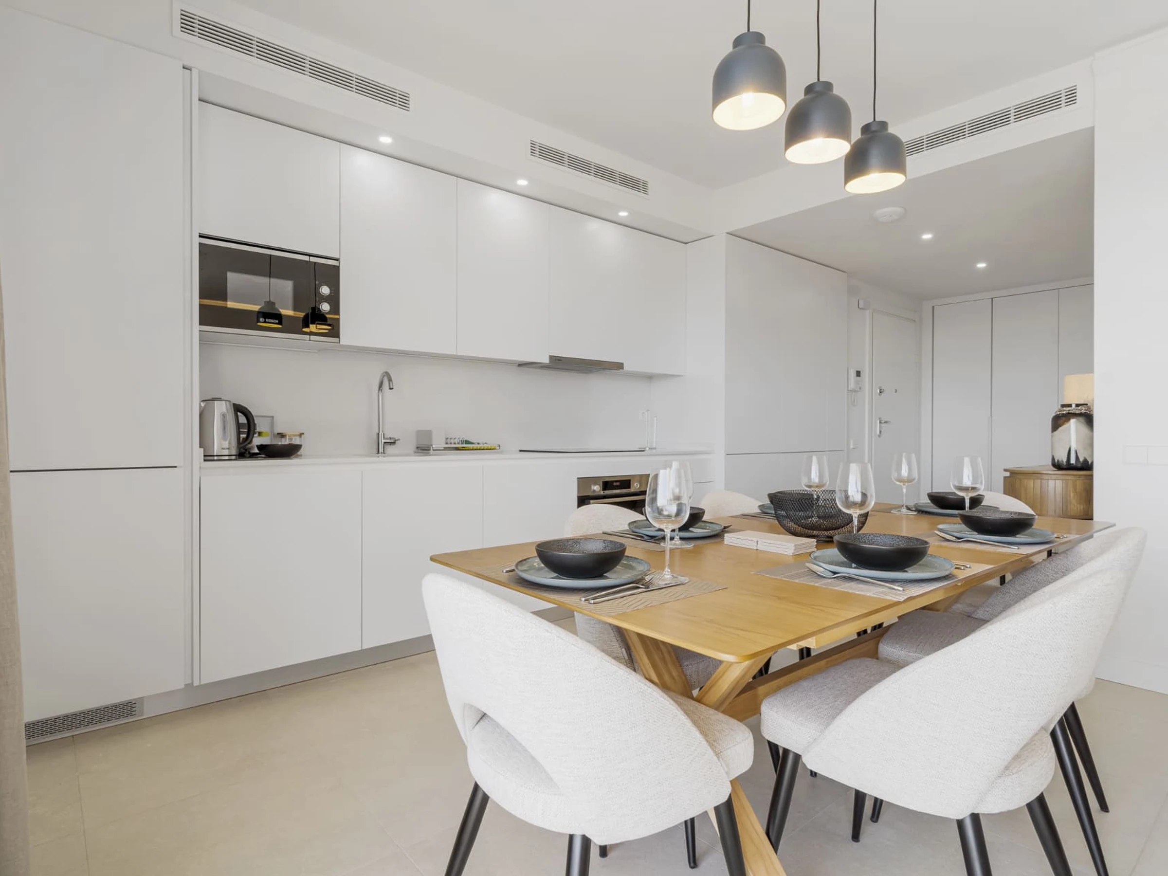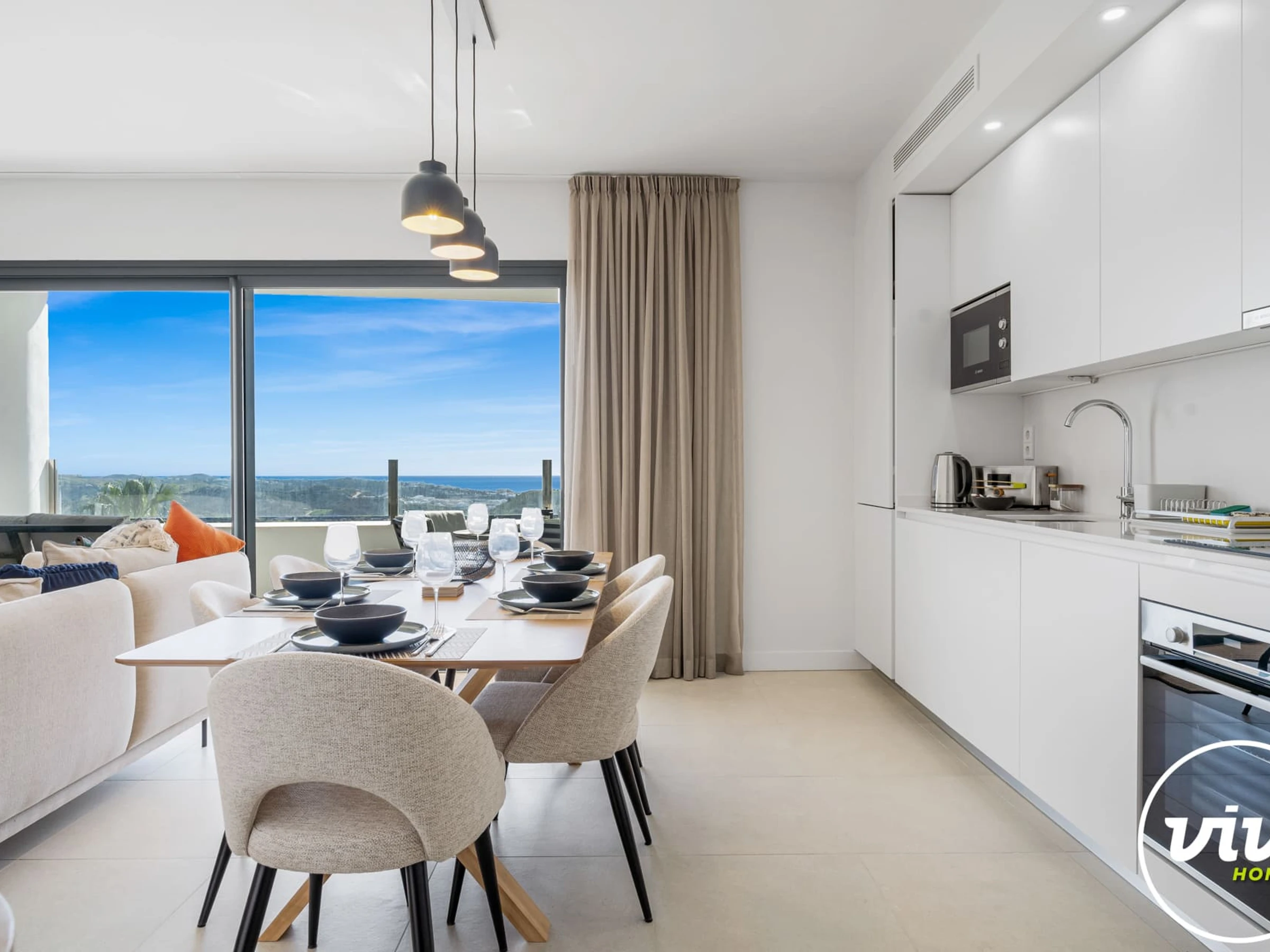 Dieses offene küche, mit induktions-kochfeld, ist ausgestattet in kühlschrank, mikrowelle, backofen, gefrierschrank, spülmaschine, geschirr/besteck, kochutensilien, kaffeemaschine, toaster und wasserkocher.