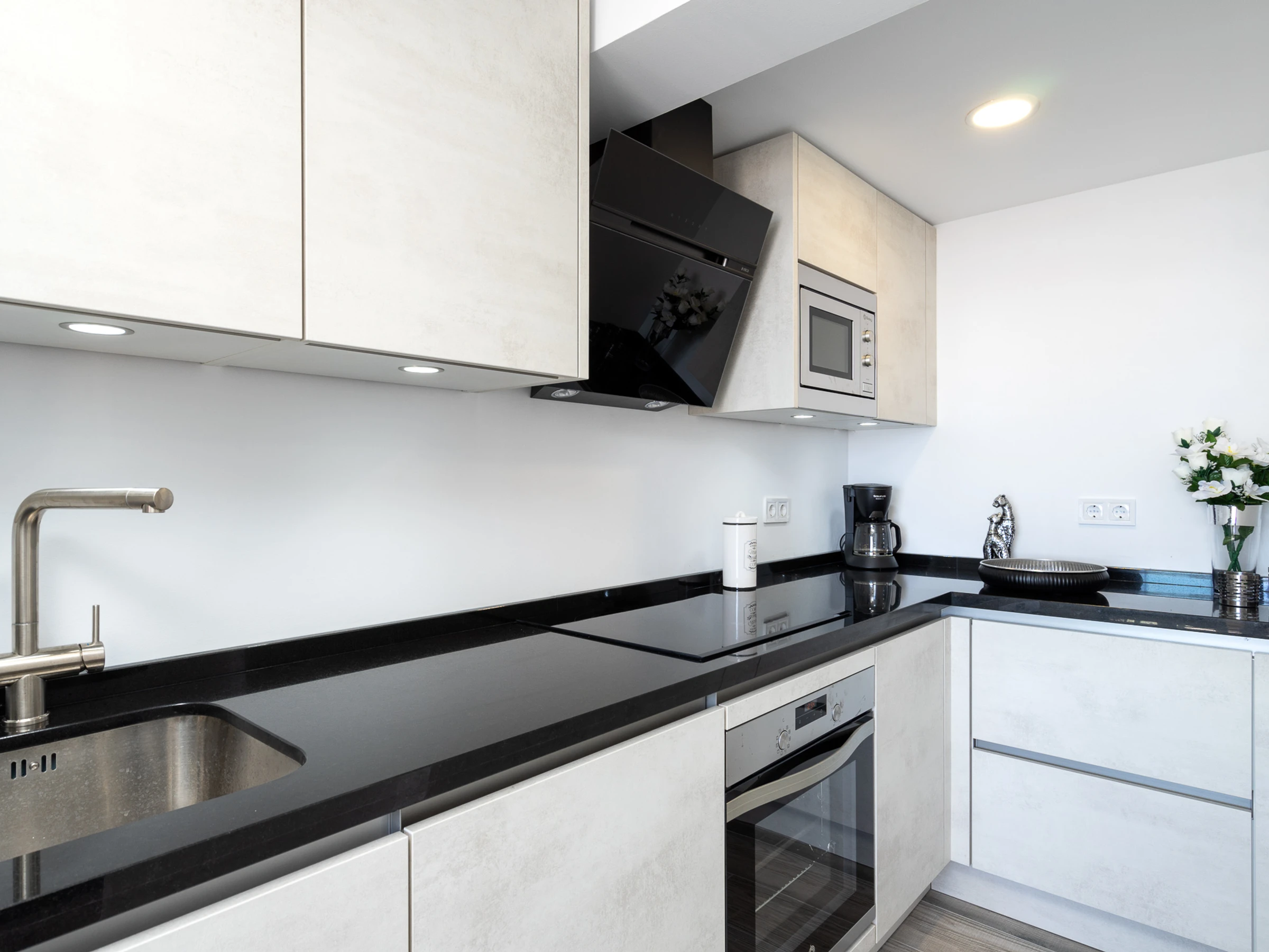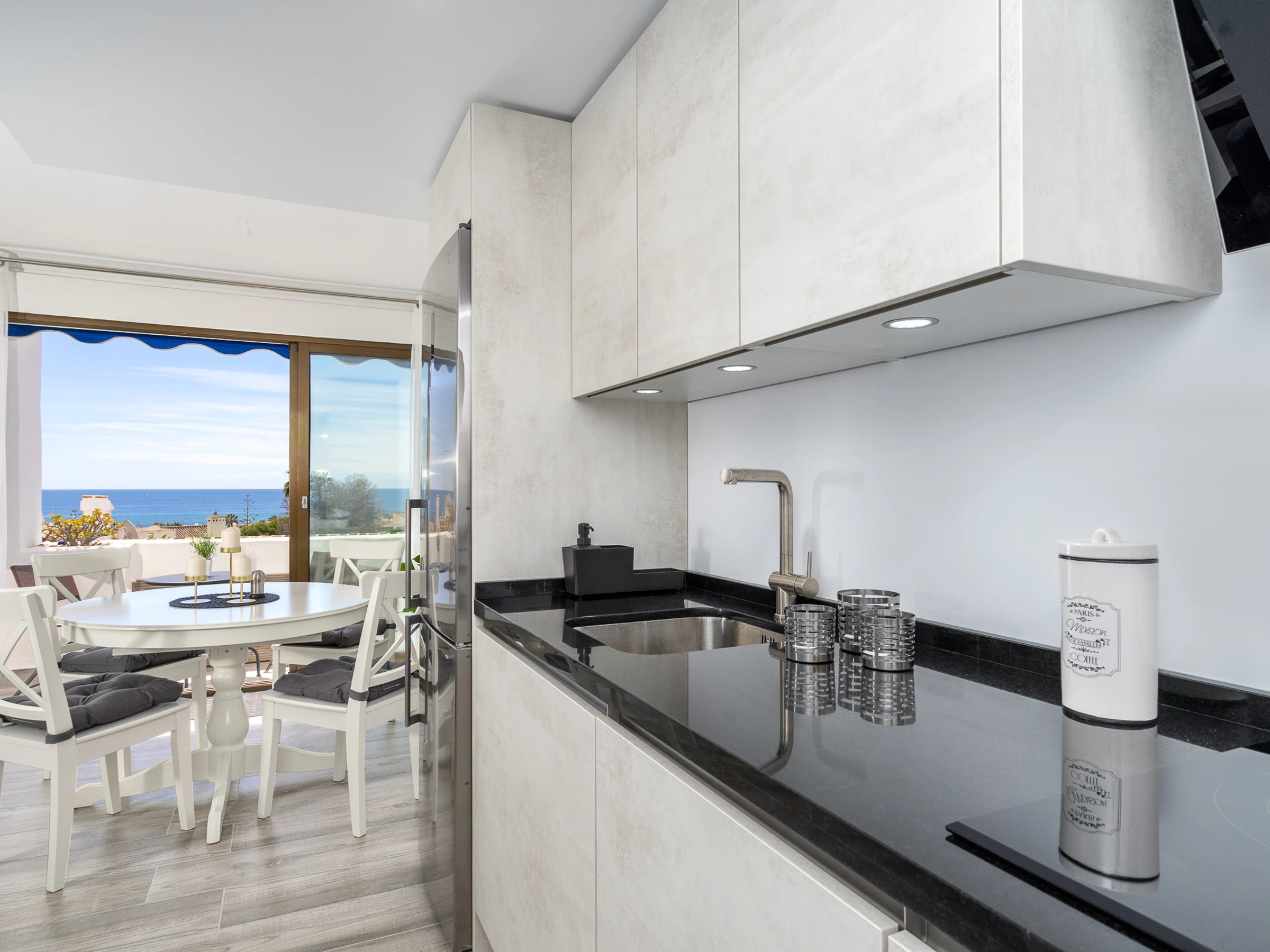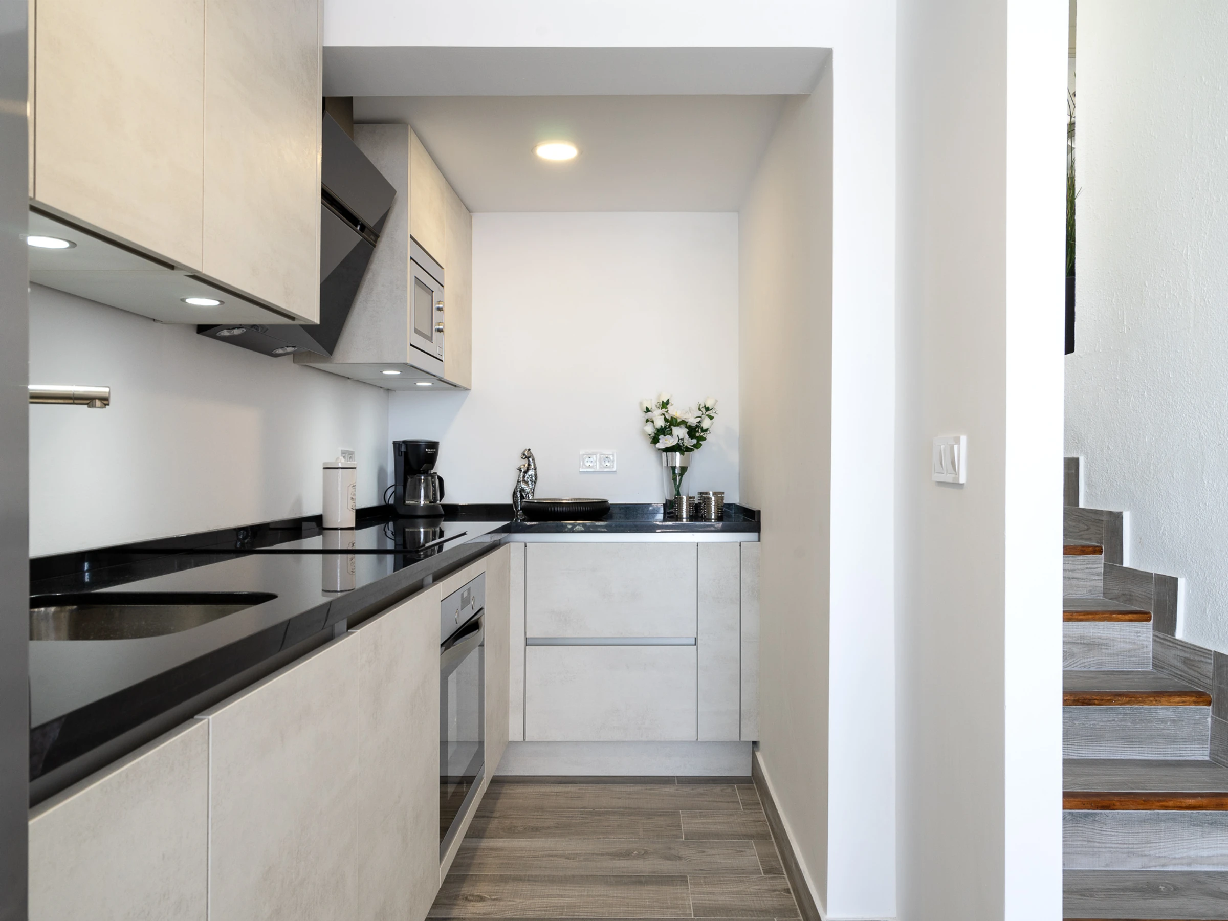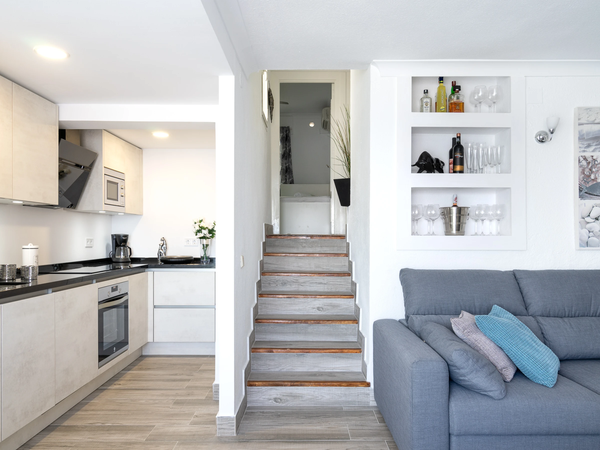 Dieses küche, ist ausgestattet in kühlschrank, mikrowelle, backofen, gefrierschrank, spülmaschine, kochutensilien, kaffeemaschine, toaster und wasserkocher.