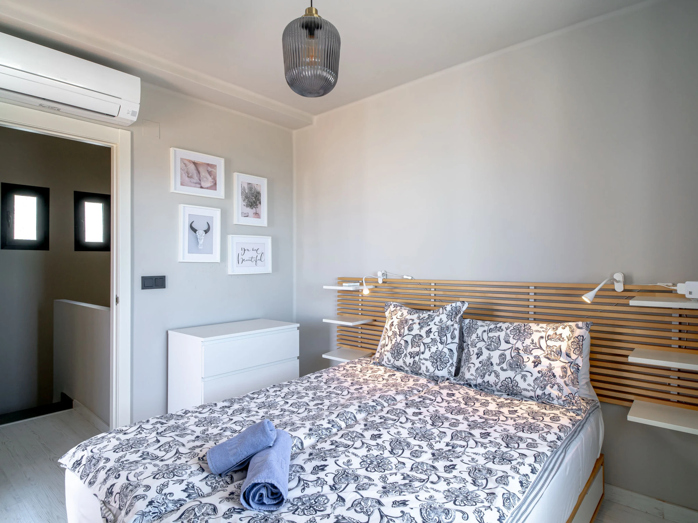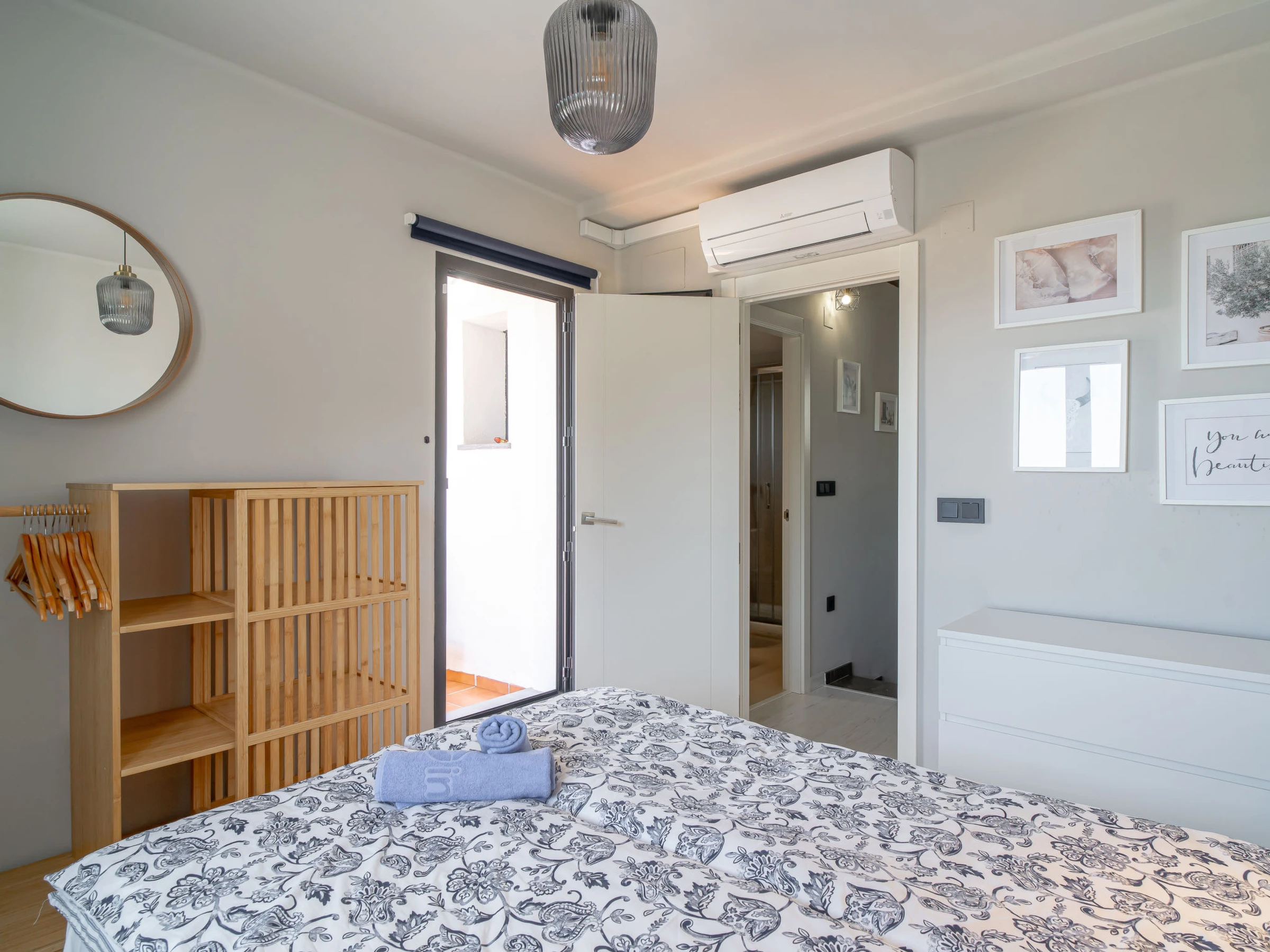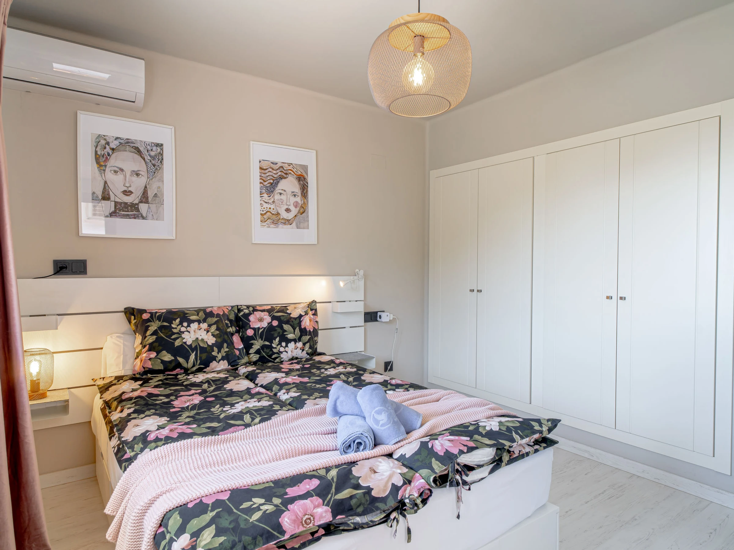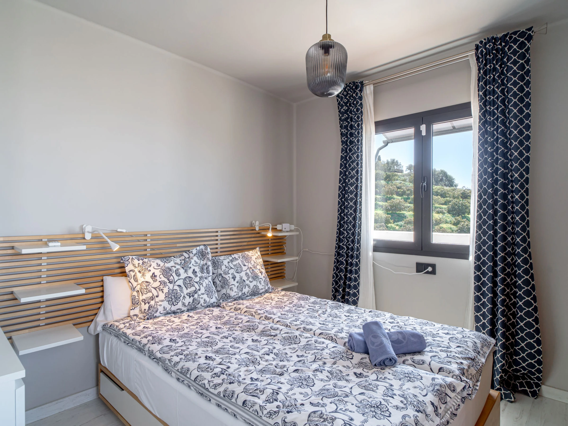 "Melon", 4-Zimmer-Reihenhaus [hidden] m2. Geräumig und hell, komfortabel und geschmackvoll eingerichtet: Wohn-/Esszimmer mit Digital-TV und Klimaanlage. Ausgang zur Terrasse. Küche (Backofen, Geschirrspüler, 4 Glaskeramikplatten, Toaster, Wasserkocher, Mikrowelle, elektrische Kaffeemaschine). Dusche/WC. Keine Heizmöglichkeit. Obergeschoss: 1 Zimmer mit 1 franz. Bett ([hidden] cm, Länge [hidden] cm), Klimaanlage. Ausgang zur Terrasse. 1 Zimmer mit 1 franz. Bett ([hidden] cm, Länge [hidden] cm), Klimaanlage. Ausgang zur Terrasse. Bad/WC. 2. Obergeschoss: 1 Zimmer mit 1 franz. Bett ([hidden] cm, Länge [hidden] cm), Klimaanlage. Ausgang zur Terrasse. Dusche/WC. 2 grosse Terrassen. Terrassenmöbel. Panoramasicht auf das Meer. Zur Verfügung: Waschmaschine, Bügeleisen, Babybett bis 3 Jahre, Haartrockner. Internet (WLAN, gratis). [hidden] // Reg. Nr.: ESFCTU[hidden][hidden][hidden]3