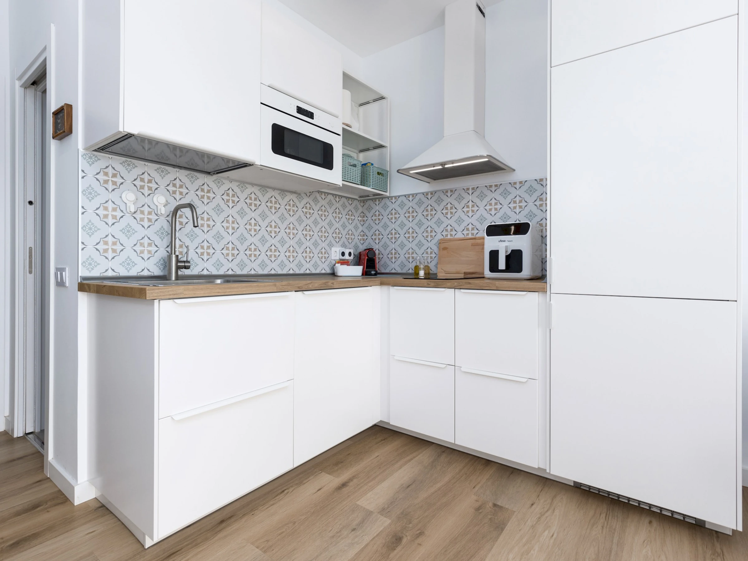 Dieses küche, ist ausgestattet in mikrowelle, kochutensilien und kaffeemaschine.