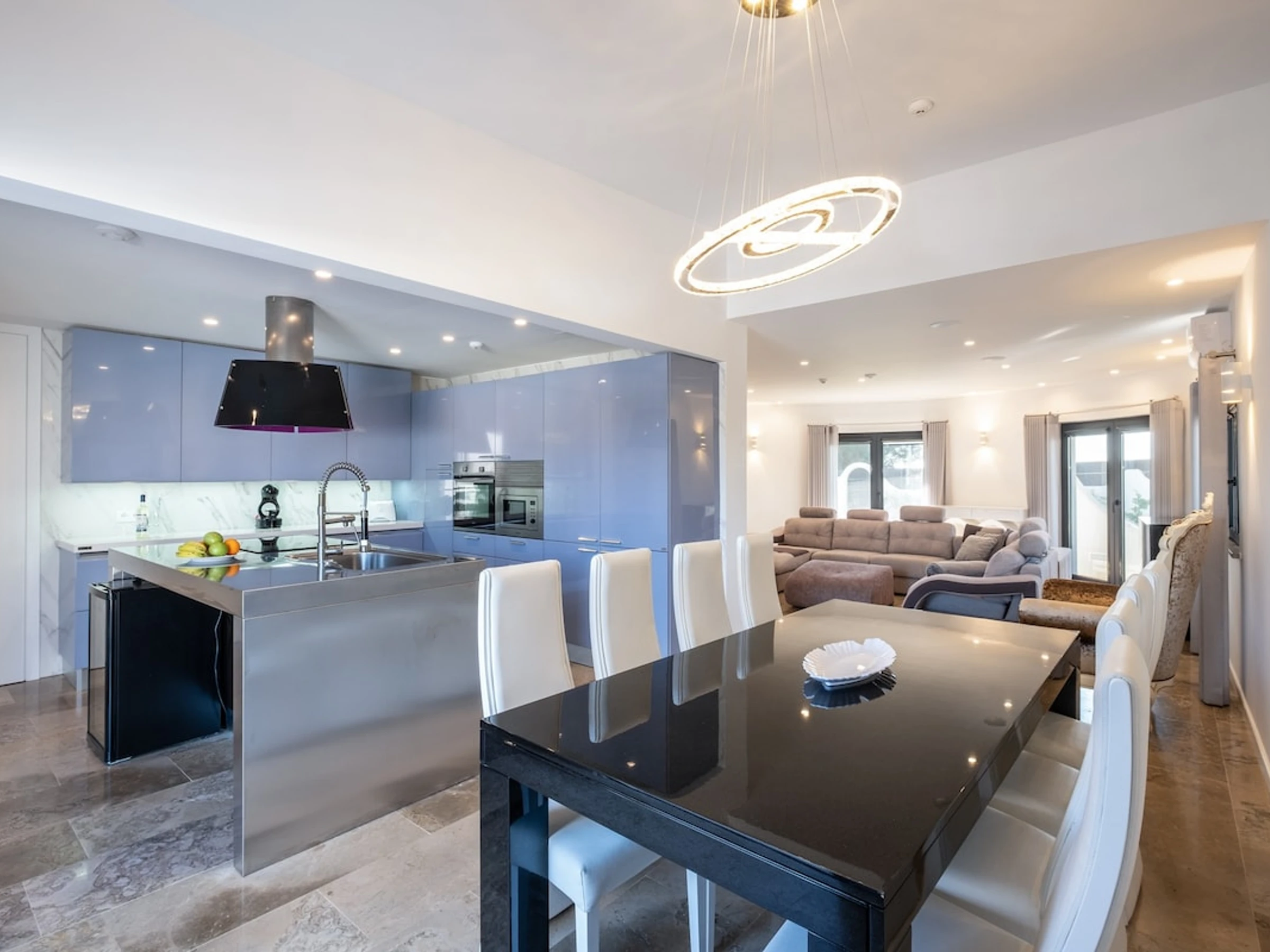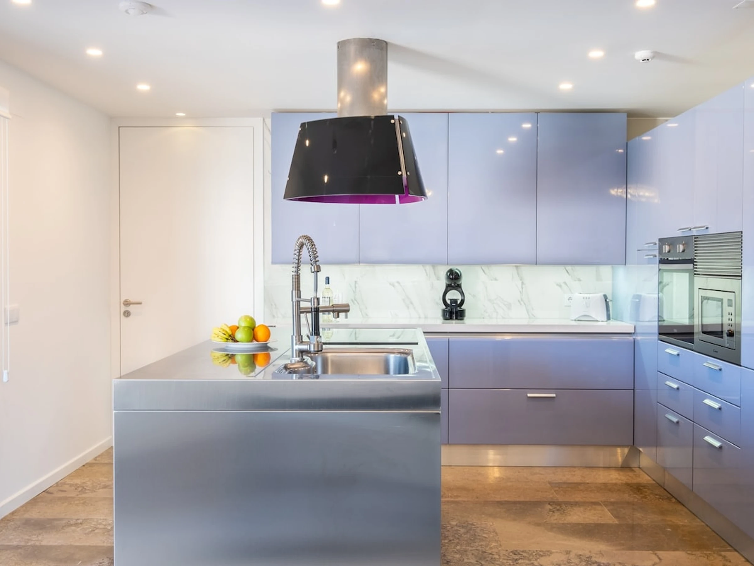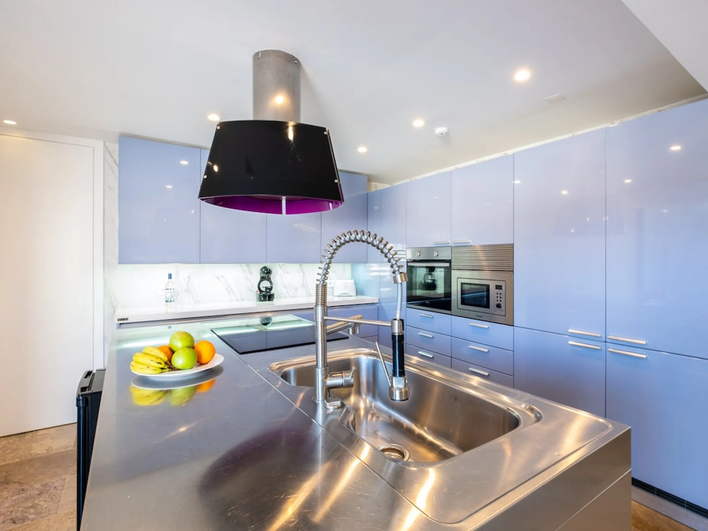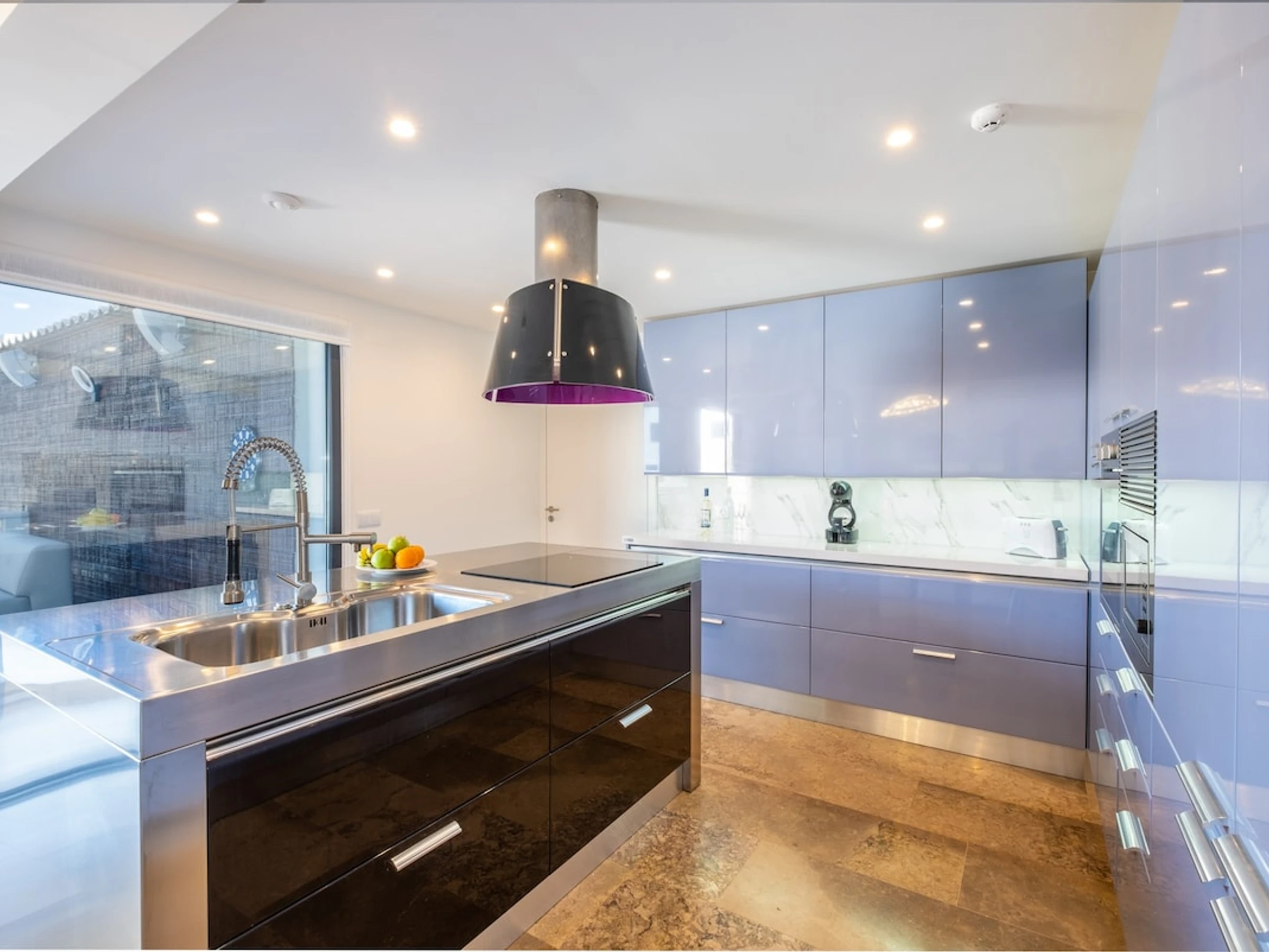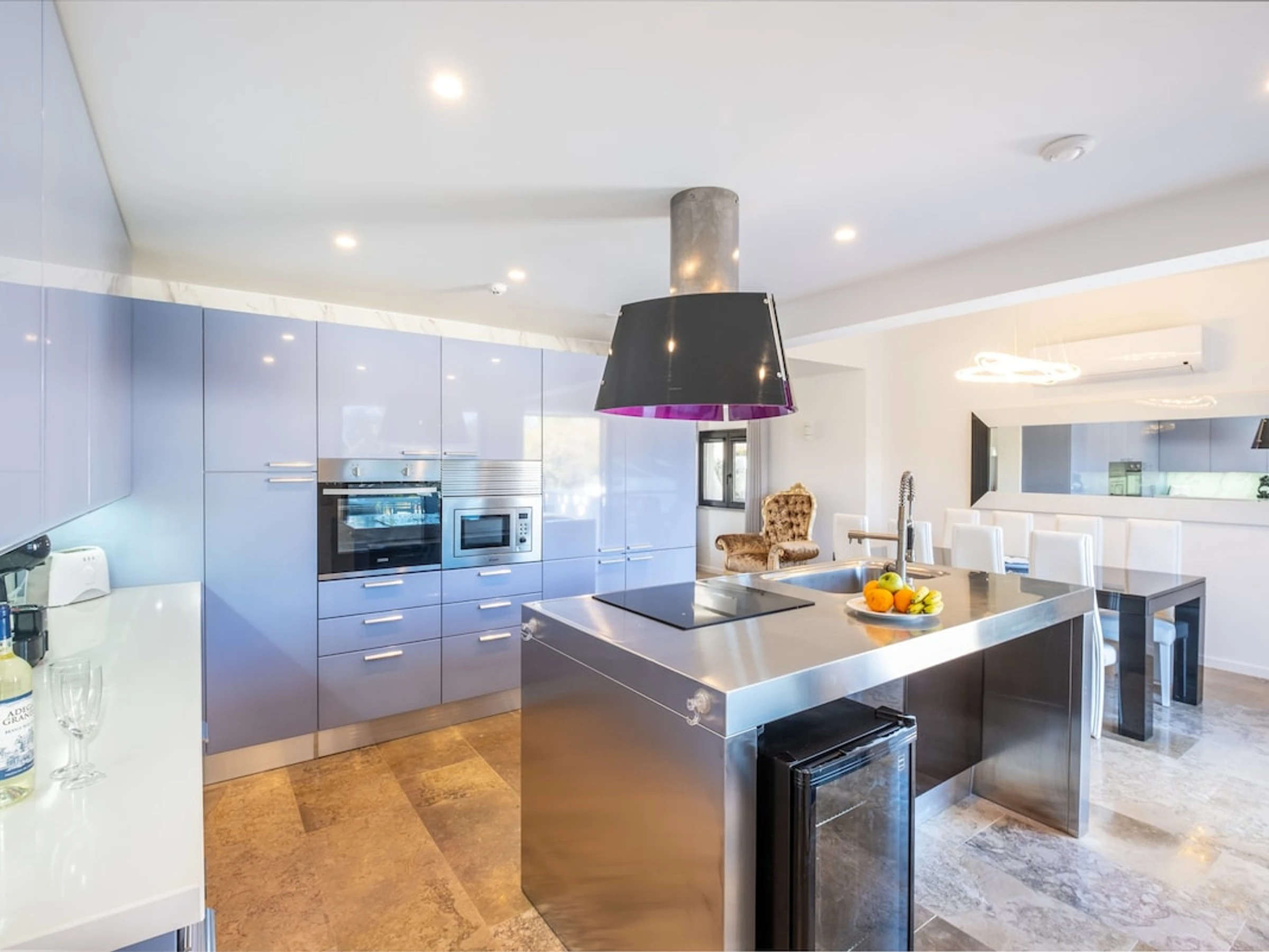 Dieses offene küche, mit induktions-kochfeld, ist ausgestattet in kühlschrank, mikrowelle, backofen, gefrierschrank, spülmaschine, geschirr/besteck, kochutensilien, kaffeemaschine, toaster, wasserkocher und saftpresse.