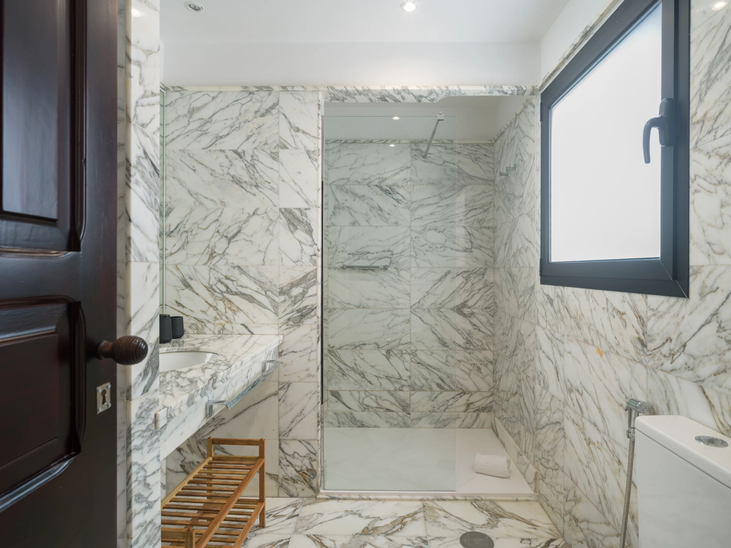 Geräumiges Badezimmer mit moderner Duchwanne, gut belüftet und ausgestattet mit hochwertigen Materialien.