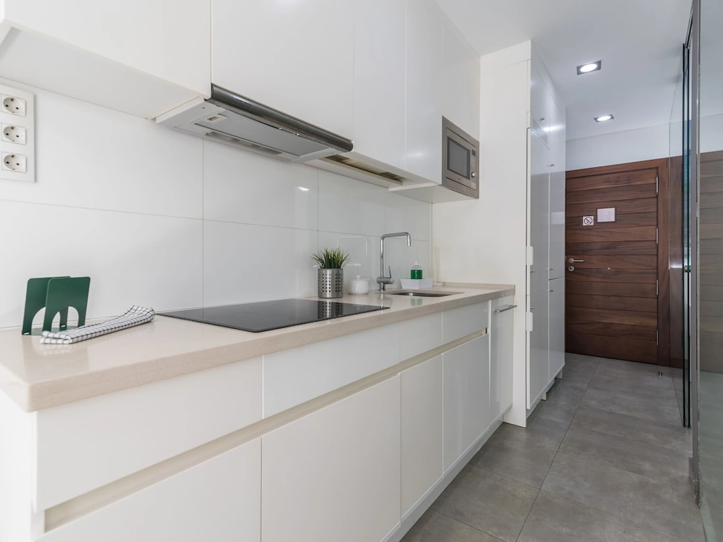 Dieses küche, ist ausgestattet in mikrowelle, spülmaschine, kochutensilien und kaffeemaschine.