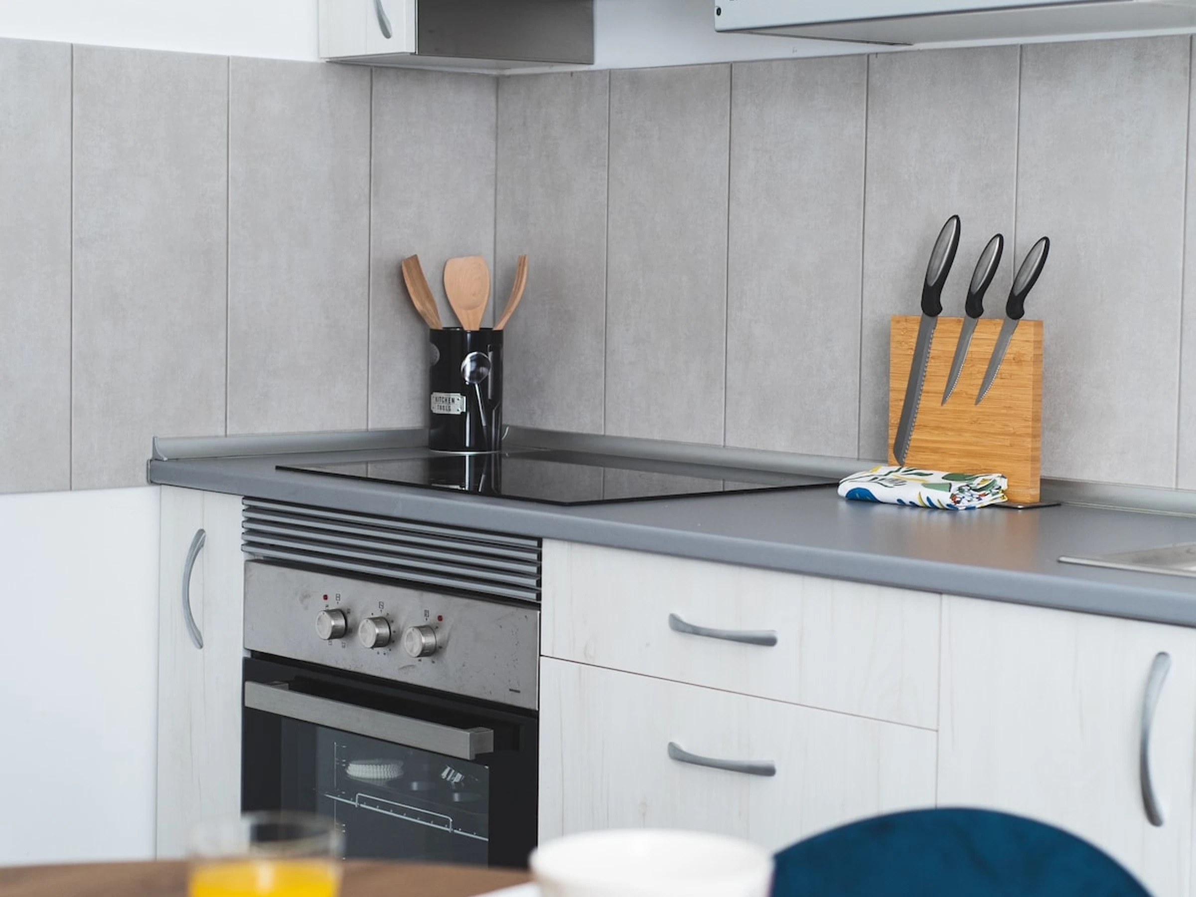 Dieses küche, ist ausgestattet in mikrowelle, backofen, kochutensilien und kaffeemaschine.
