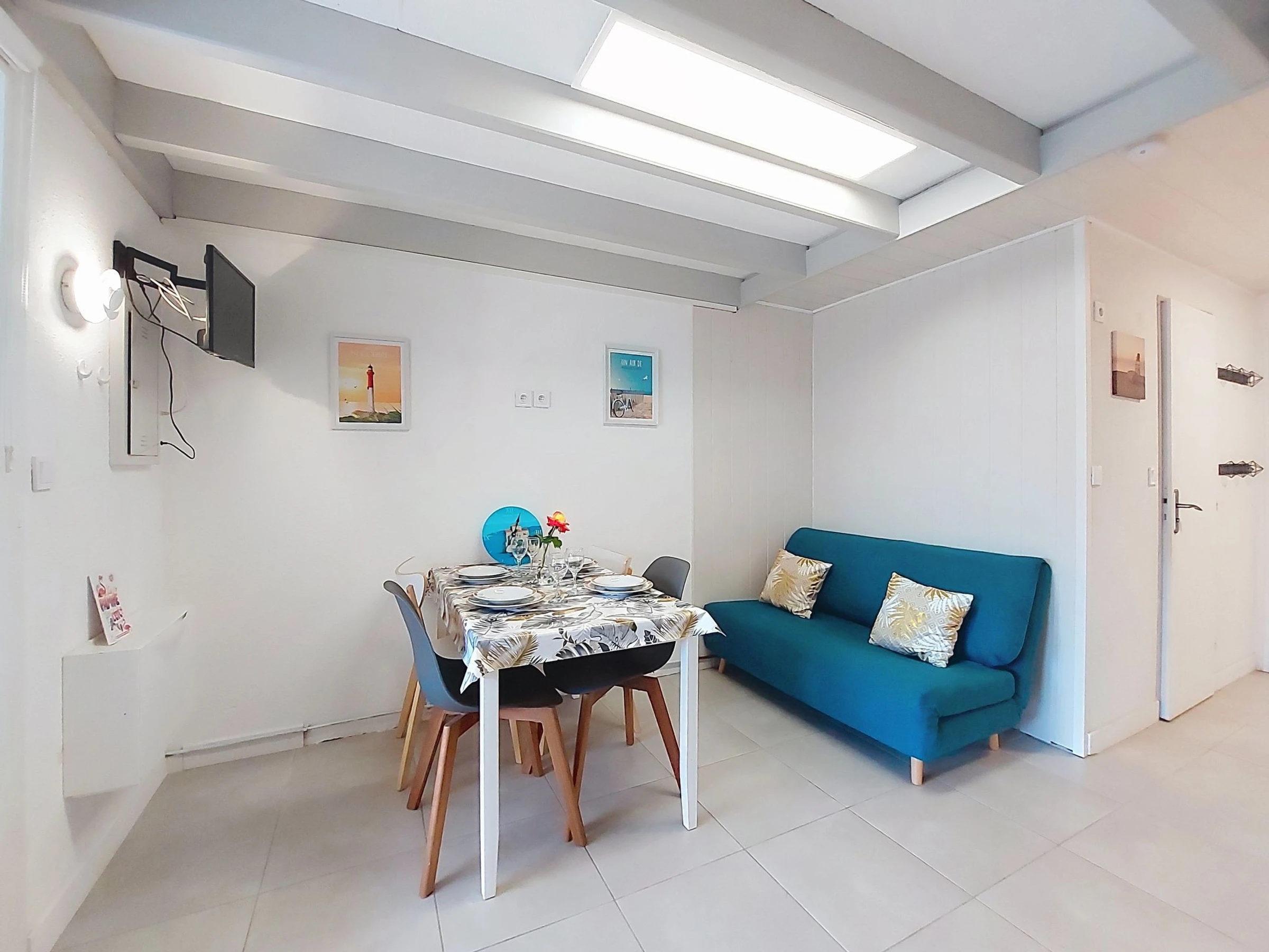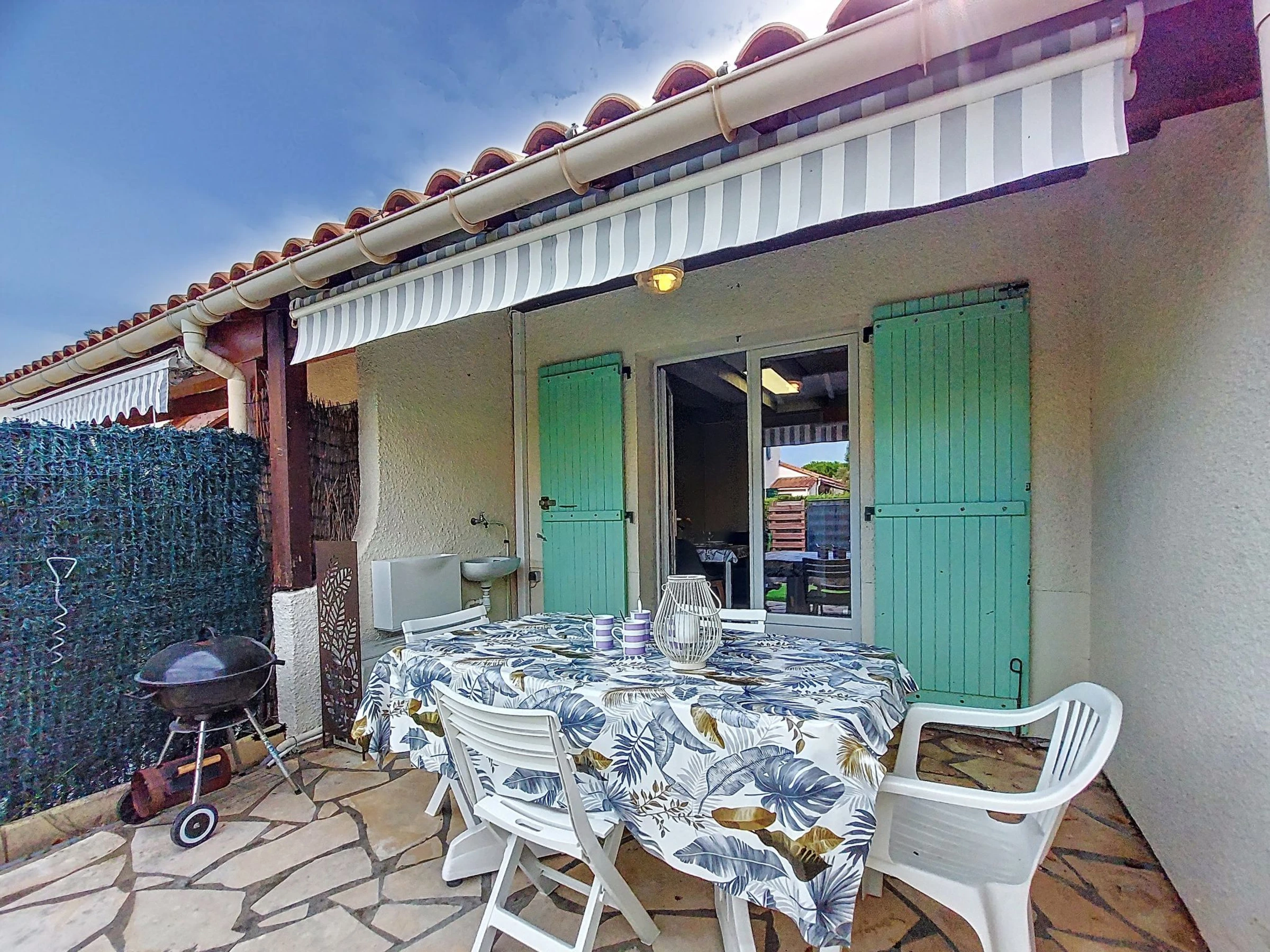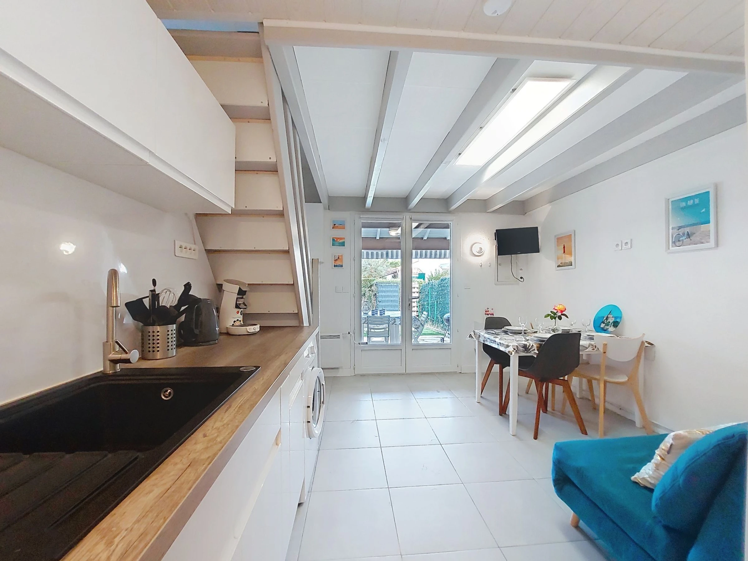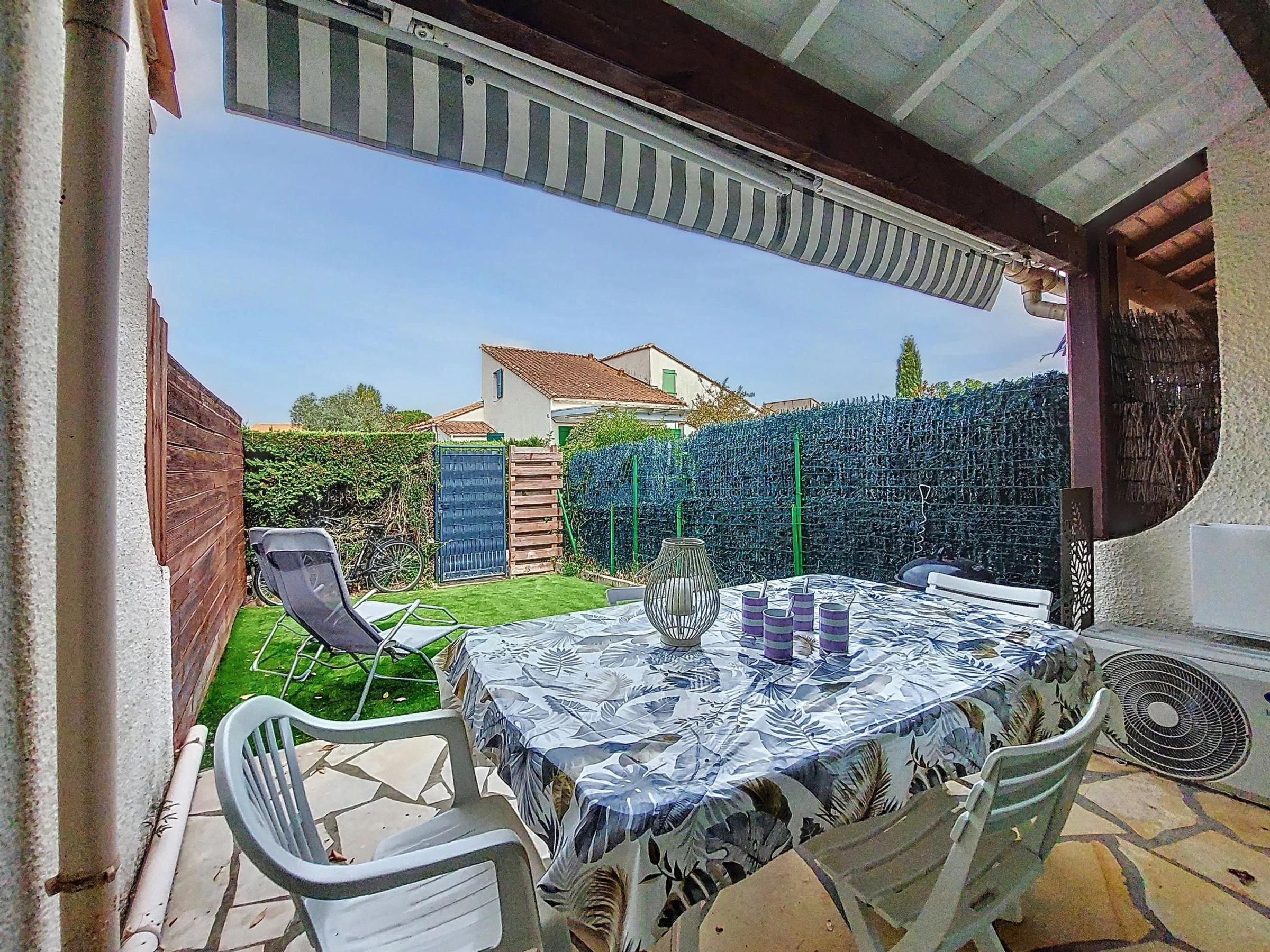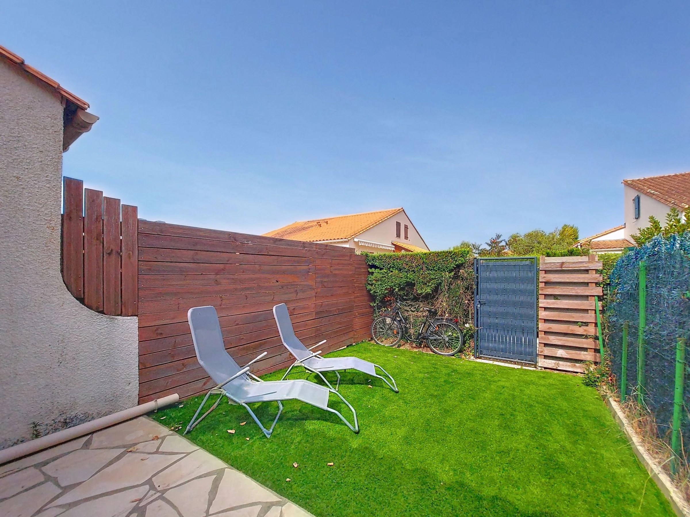 2-Zimmer-Reihenhaus 30 m2 auf 2 Stockwerken. Wohn-/Esszimmer mit TV (Flachbildschirm). Ausgang zur Terrasse. Kochnische (Backofen, Geschirrspüler, 3 Glaskeramikplatten, Toaster, Wasserkocher, Tiefkühler, elektrische Kaffeemaschine). Dusche/WC. E-Heizung, Klimaanlage. Obergeschoss: abgeschrägte Galerie mit 2 Betten (90 cm, Länge 190 cm), 1 franz. Bett (1 x 140 cm, Länge 190 cm), TV (Flachbildschirm). Terrasse 6 m2, Gartensitzplatz 20 m2. Terrassenmöbel, Elektrogrill. Zur Verfügung: Waschmaschine. Internet (WLAN, extra). Parkplatz. Bitte beachten: 1 kleines Haustier/Hund erlaubt. Rauchmelder. Inserat einer Privatperson nach Artikel 155, IV, CGI.