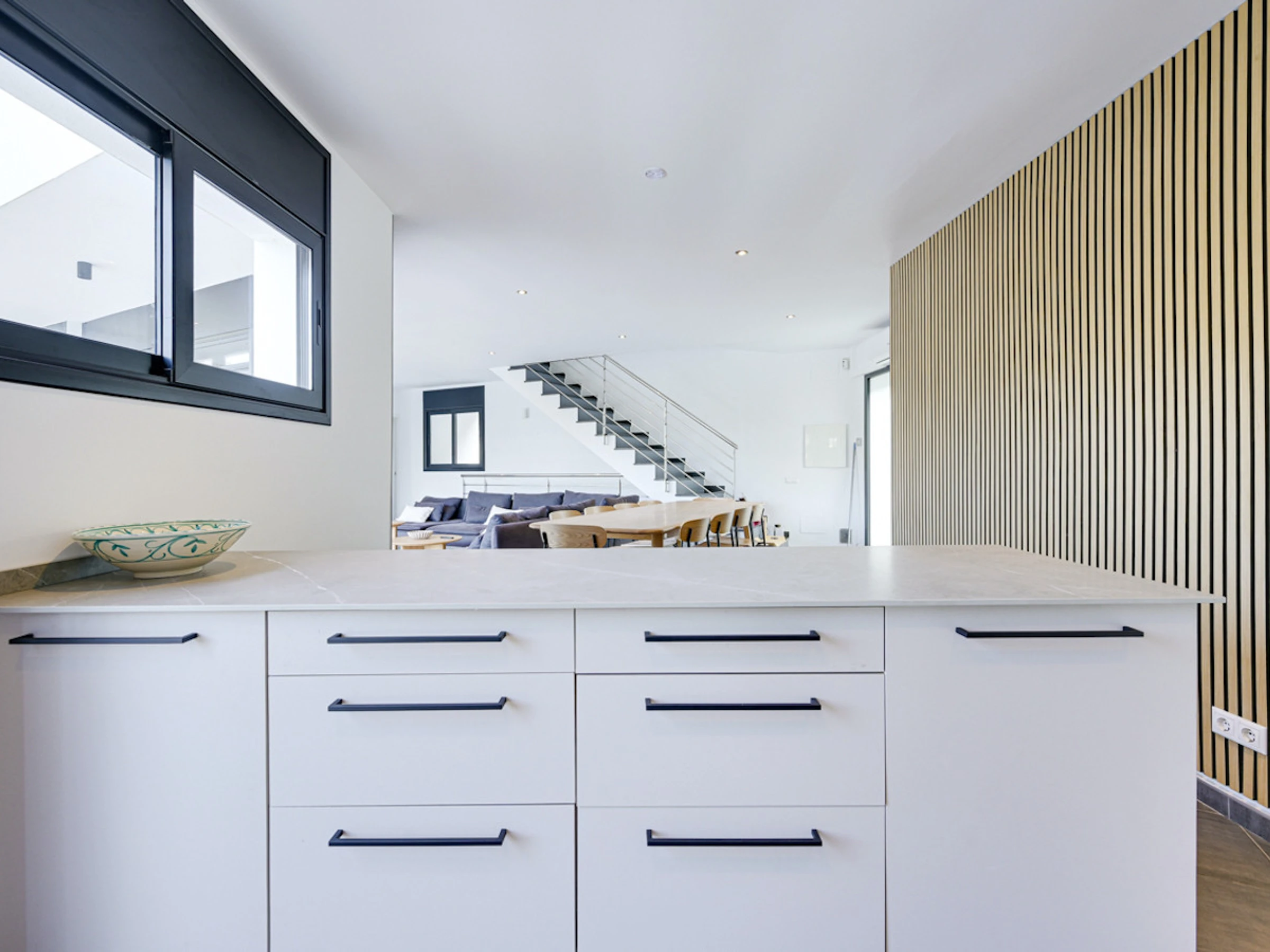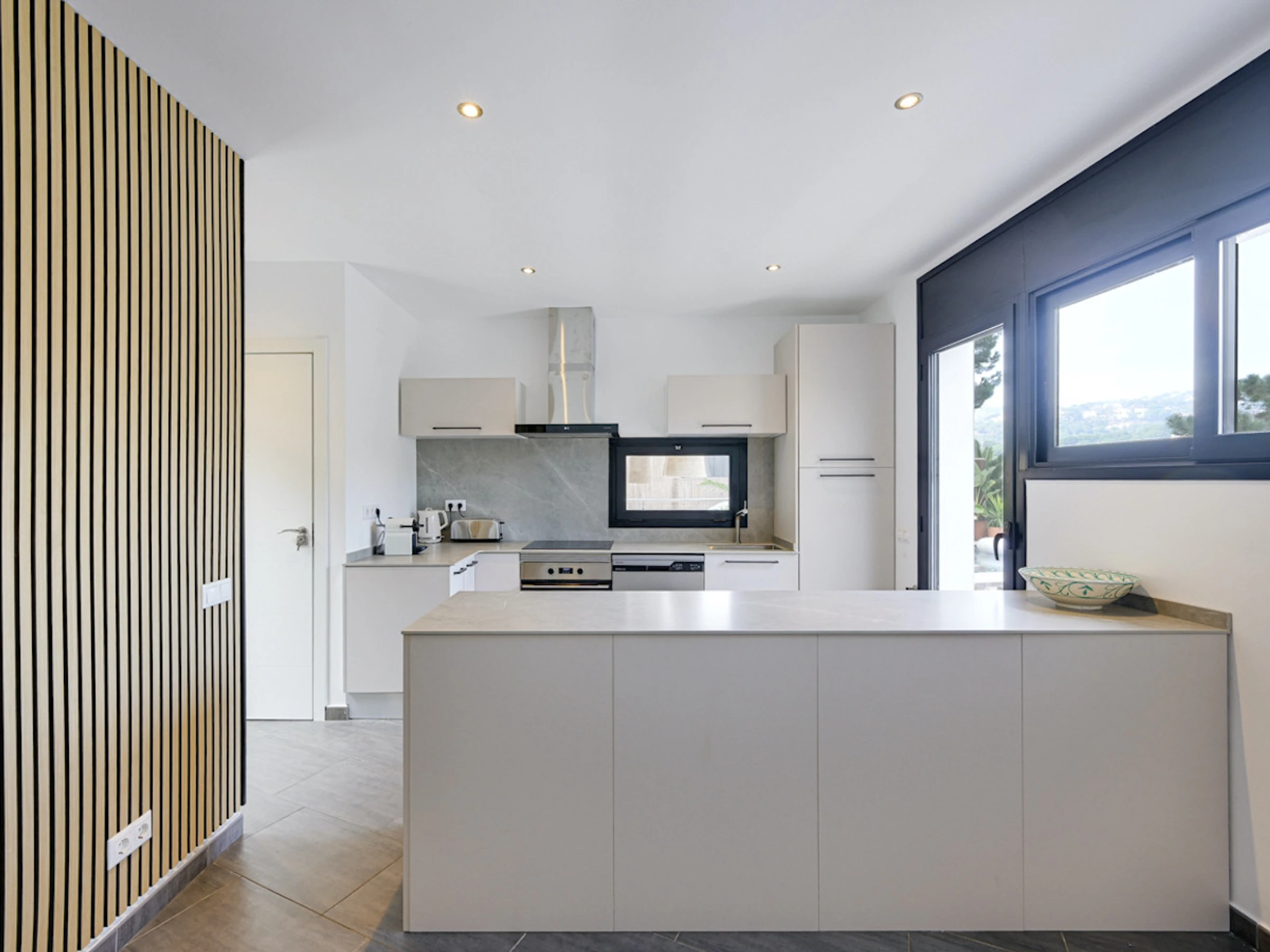 Dieses offene küche, mit induktions-kochfeld, ist ausgestattet in kühlschrank, mikrowelle, backofen, gefrierschrank, spülmaschine, geschirr/besteck, kochutensilien, kaffeemaschine, toaster, wasserkocher und saftpresse.