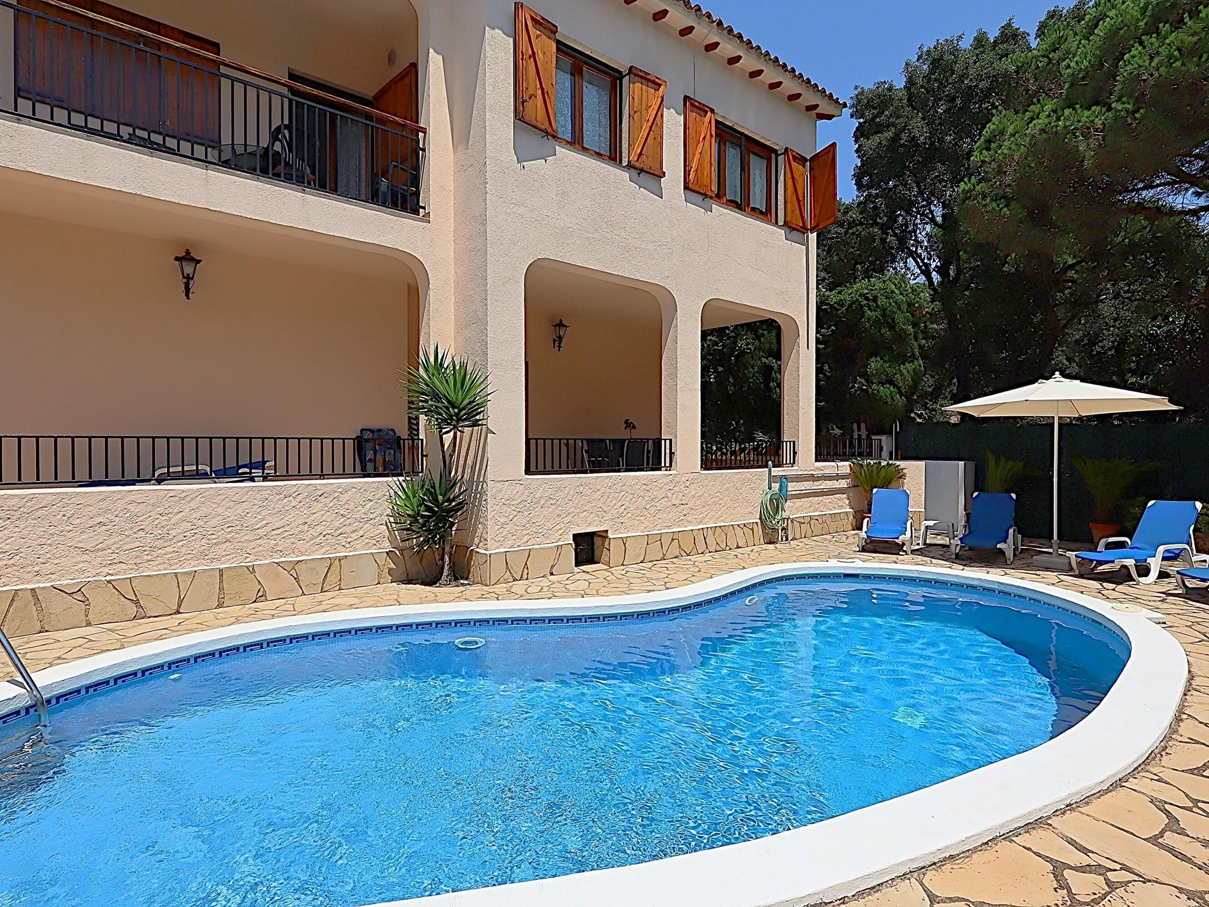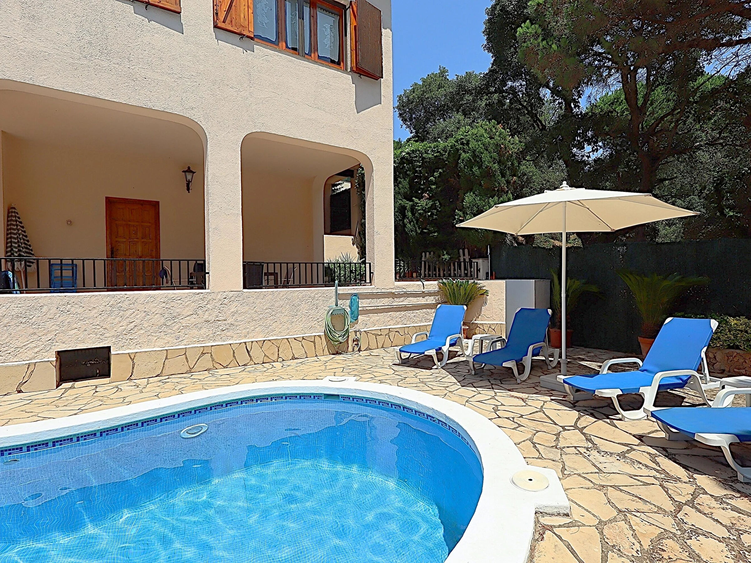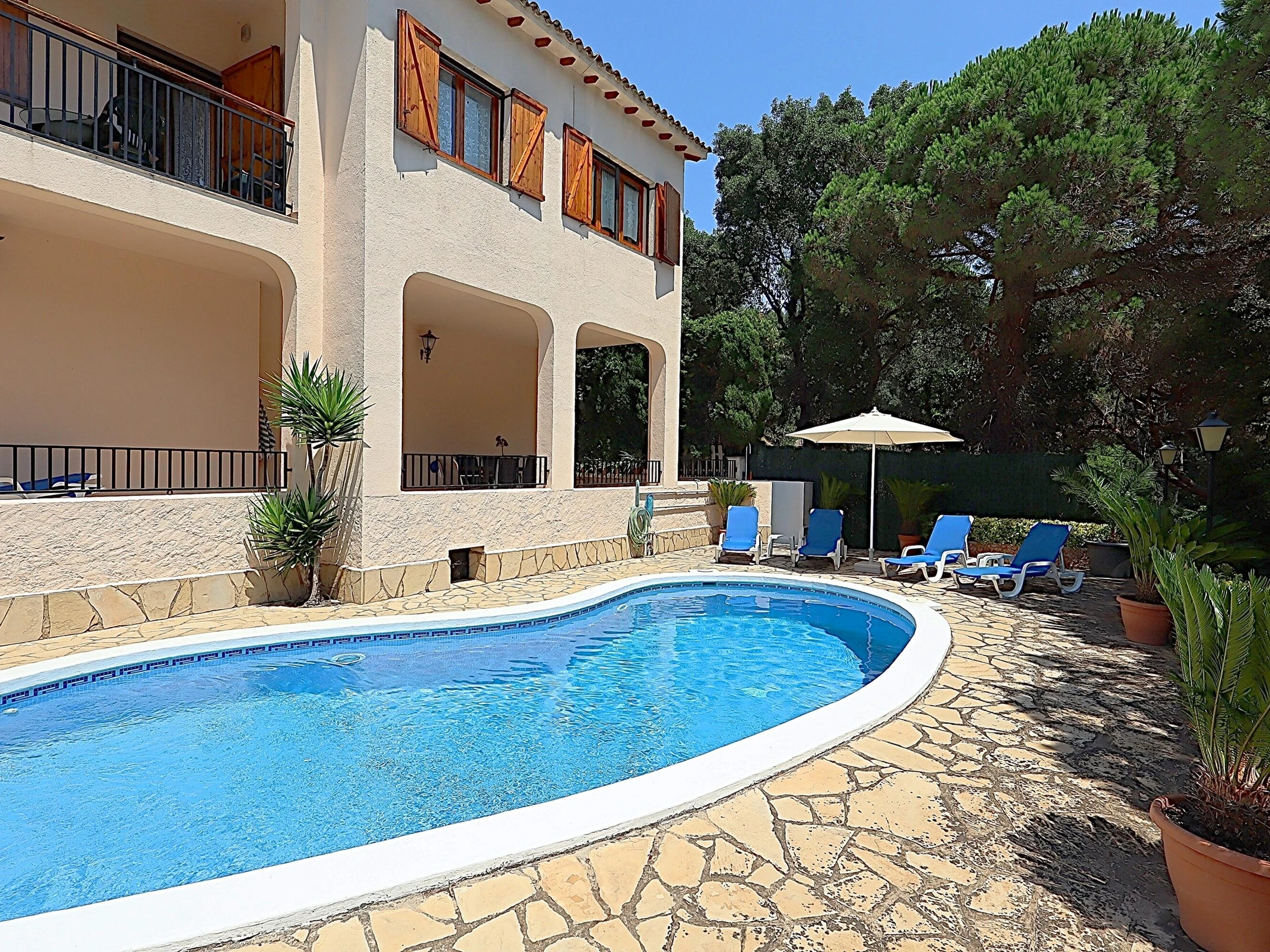 Die Villa Victoria ist ein wunderschönes Chalet mit privatem Pool und viel Privatsphäre im rustikalen Stil in der ruhigen Urbanisation der Riviera mit fantastischem Blick auf das Meer und die Berge. Die Villa Victoria besteht aus 2 Etagen mit einer Außentreppe. Die erste Etage der Villa Victoria besteht aus 3 Schlafzimmern, 1 Badezimmer, Wohnzimmer und Esszimmer und einer voll ausgestatteten unabhängigen Küche. Das Wohnzimmer hat Zugang zu einer Terrasse. Die untere Etage der Villa Victoria besteht aus einem Badezimmer mit Dusche, einem Wohnzimmer mit Ruhebereich mit direktem Zugang zur Terrasse, Garten, Grill und Pool. Das Erdgeschoss verfügt über eine amerikanische Küche, die mit Geräten ausgestattet ist, sodass Sie mit Familie und Freunden direkt vor dem Pool genießen können. Das Haus hat eine sehr gute Privatsphäre und eine unglaubliche Aussicht. Sie sind auch nur wenige Autominuten vom lebhaften Lloret de Mar entfernt, das Jung und Alt alles zu bieten hat, oder Sie fahren ins beschauliche Tossa de Mar mit seiner alten Burg. Entfernung zum Meer: 2,7 km Entfernung zu Restaurants: 4 km Flughafen Girona - 30 km (Ziel Ryan Air) Flughafen Barcelona - 90 km (1 Stunde und 10 Minuten auf der Autobahn) Bahnhof Blanes - 8 km.