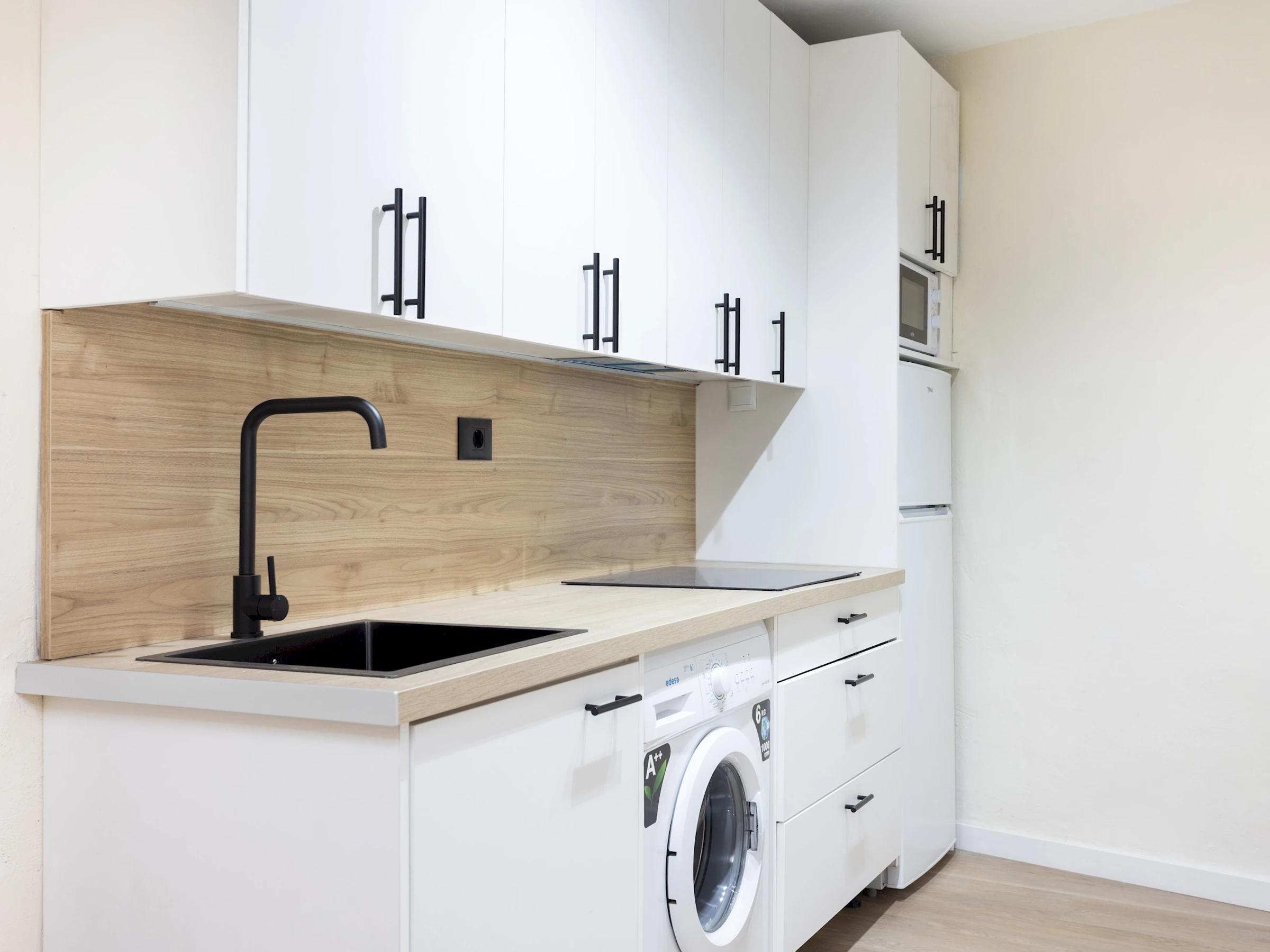 Dieses küche, ist ausgestattet in mikrowelle, kochutensilien, kaffeemaschine und toaster.