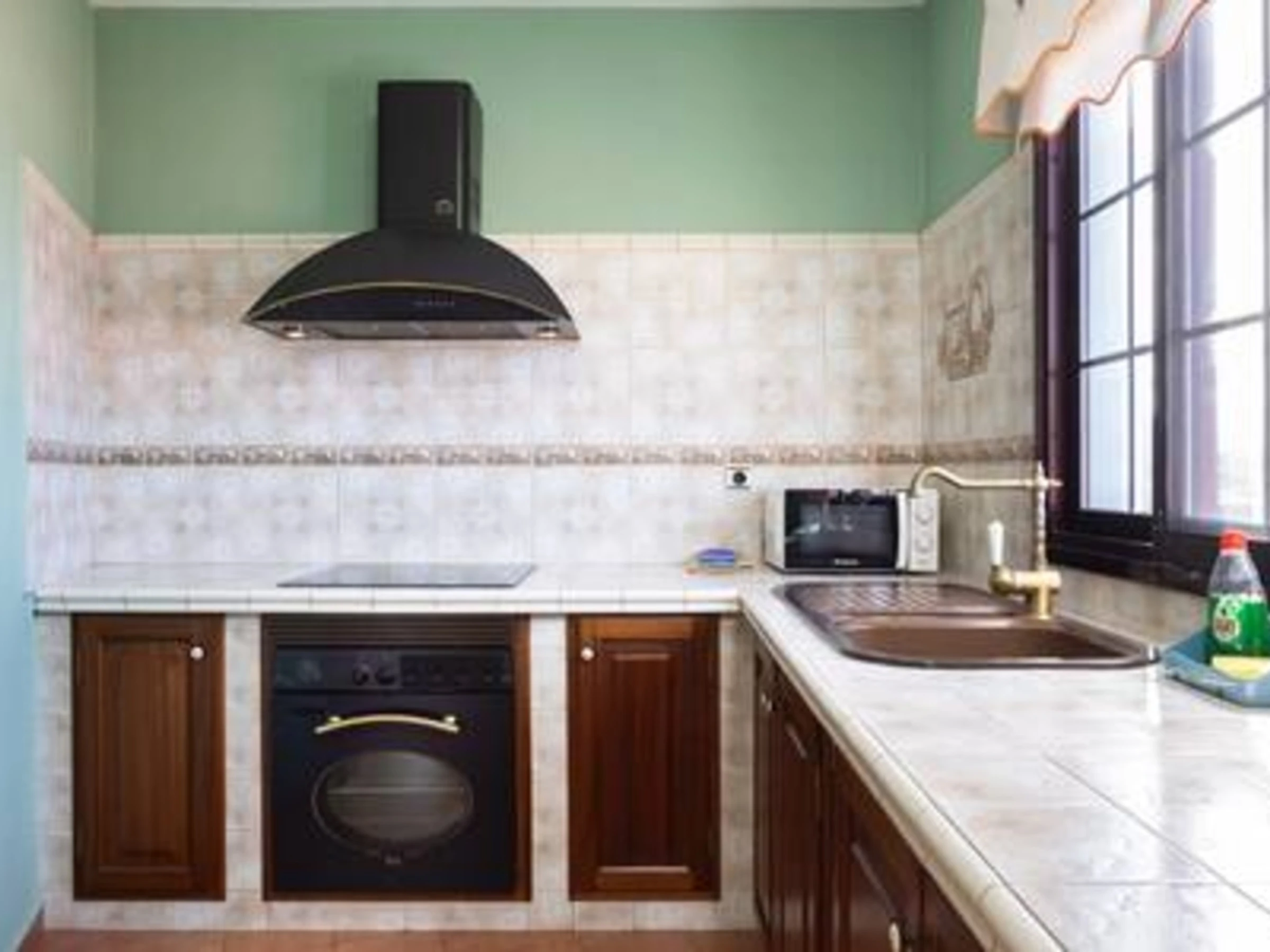 Dieses küche, ist ausgestattet in mikrowelle, backofen, kochutensilien und kaffeemaschine.