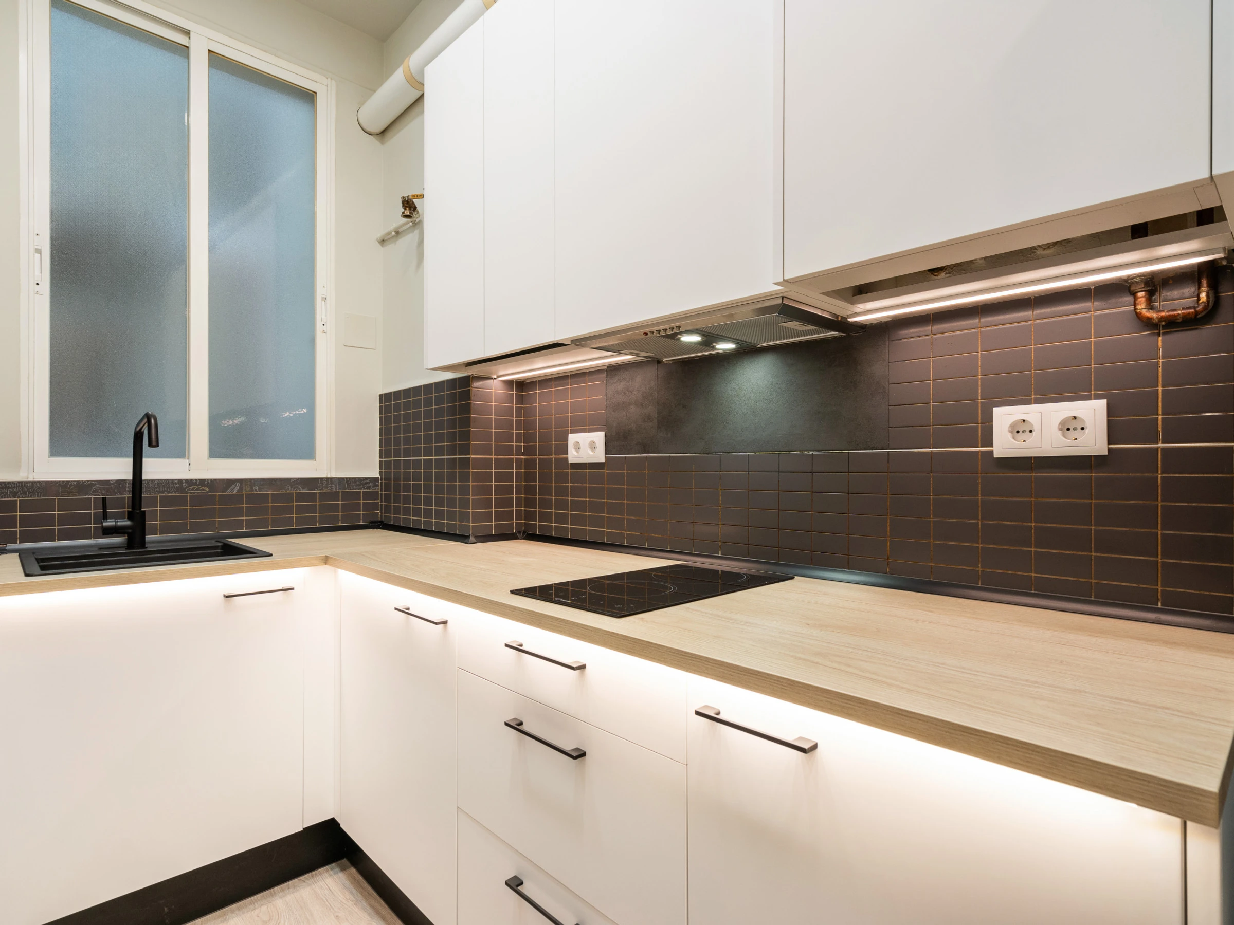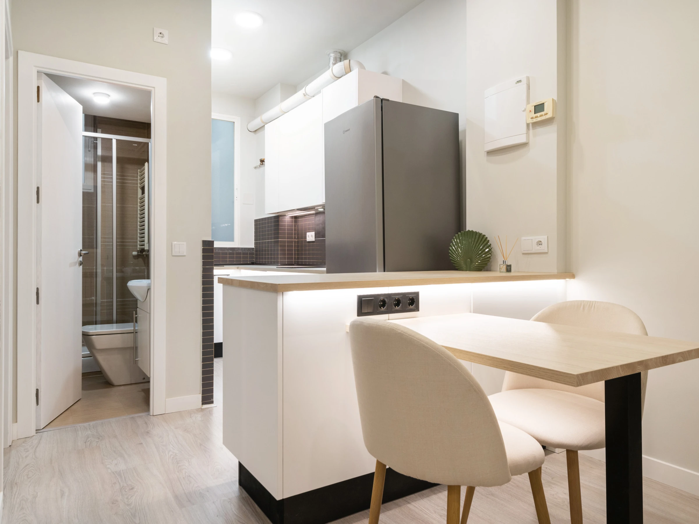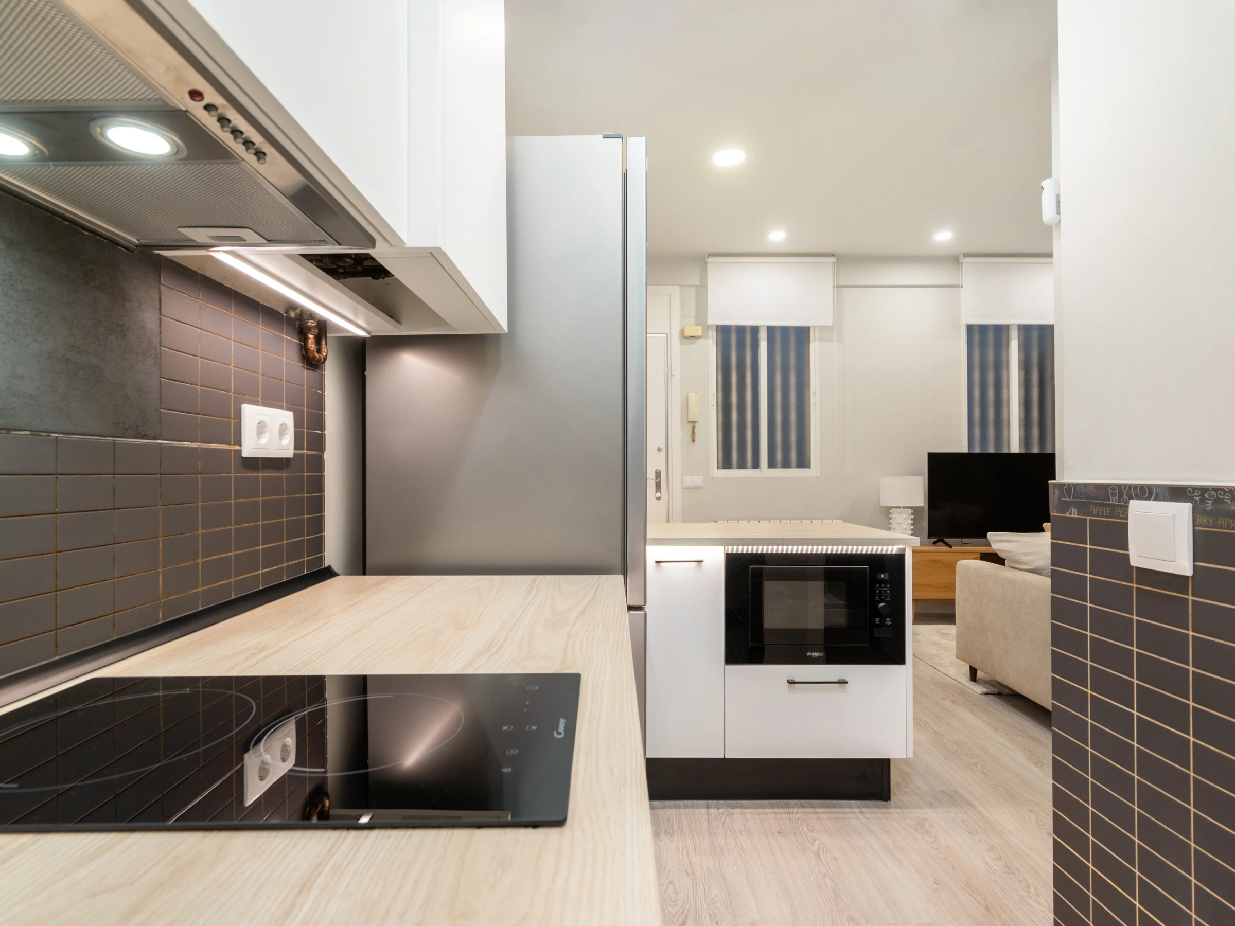 Dieses offene küche, mit induktions-kochfeld, ist ausgestattet in kühlschrank, mikrowelle, backofen, gefrierschrank, spülmaschine, geschirr/besteck, kochutensilien, kaffeemaschine, toaster und wasserkocher.