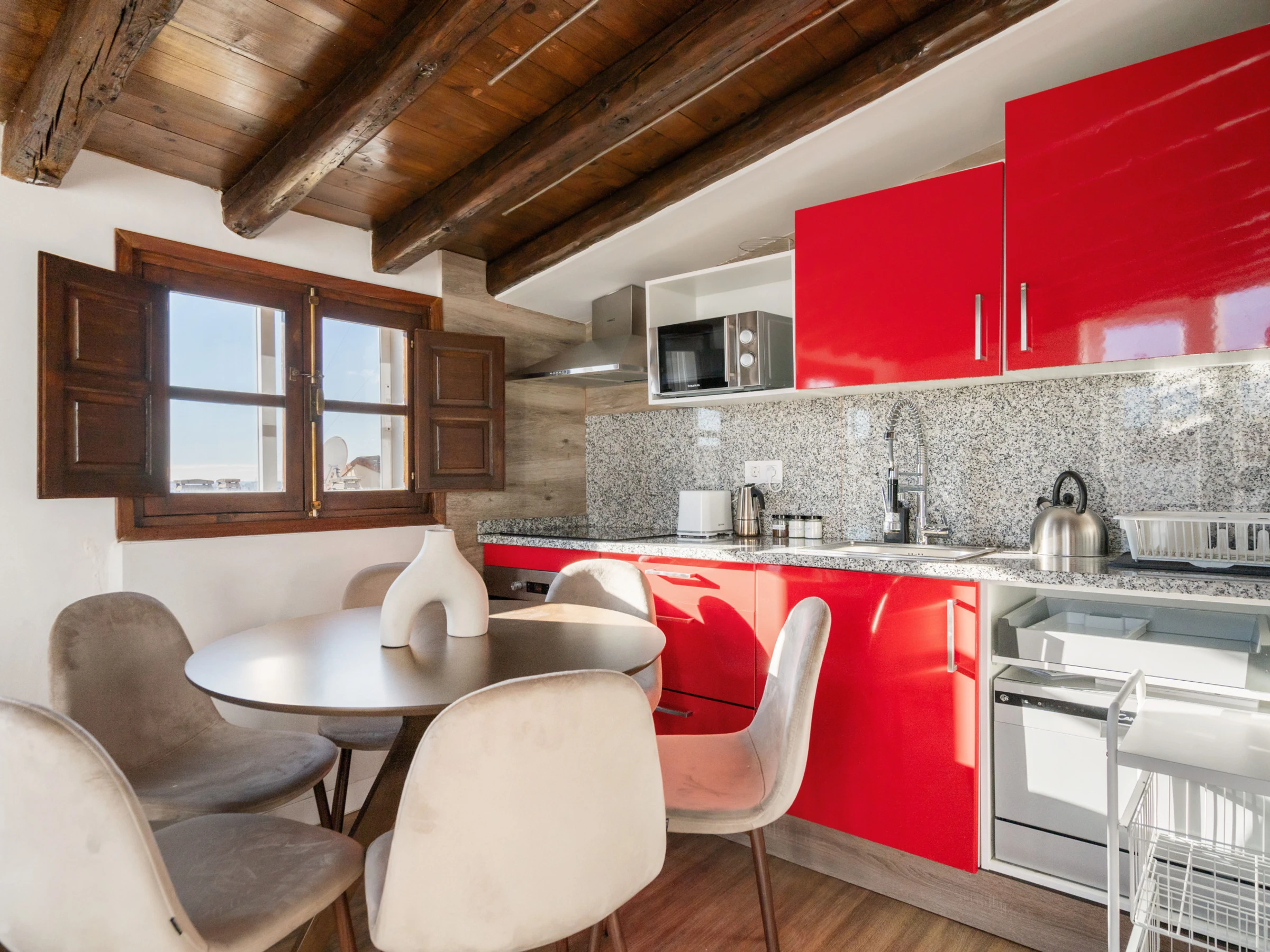 Dieses offene küche, mit induktions-kochfeld, ist ausgestattet in kühlschrank, mikrowelle, backofen, gefrierschrank, spülmaschine, geschirr/besteck, kochutensilien, kaffeemaschine, friteuse, toaster und wasserkocher.