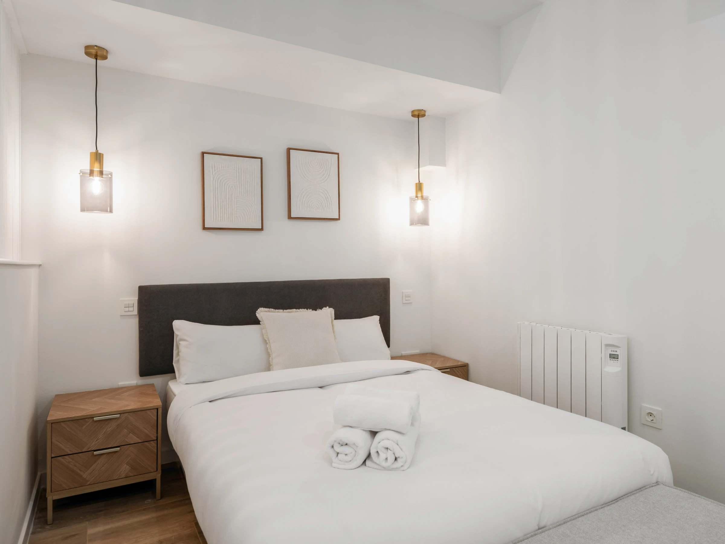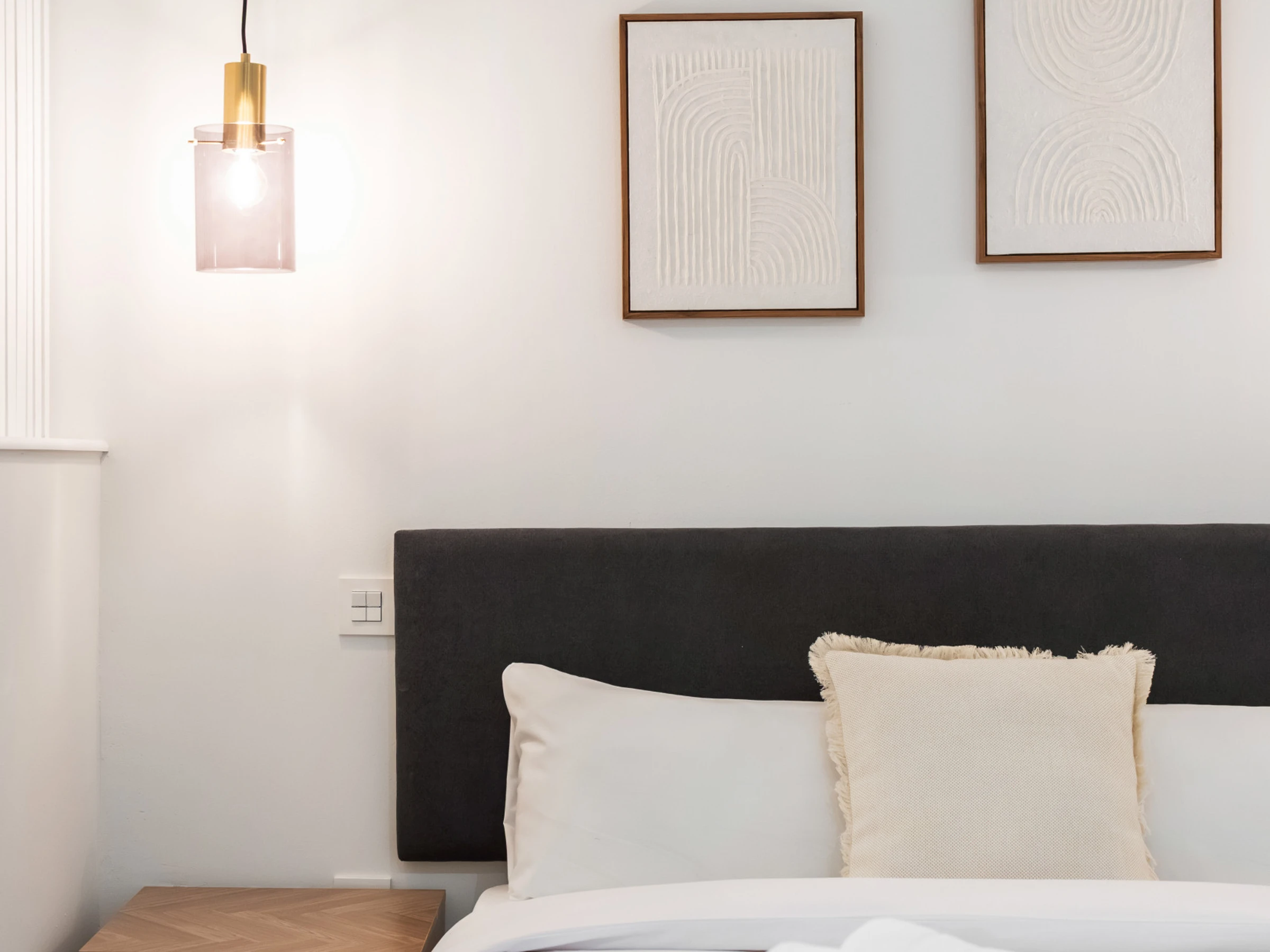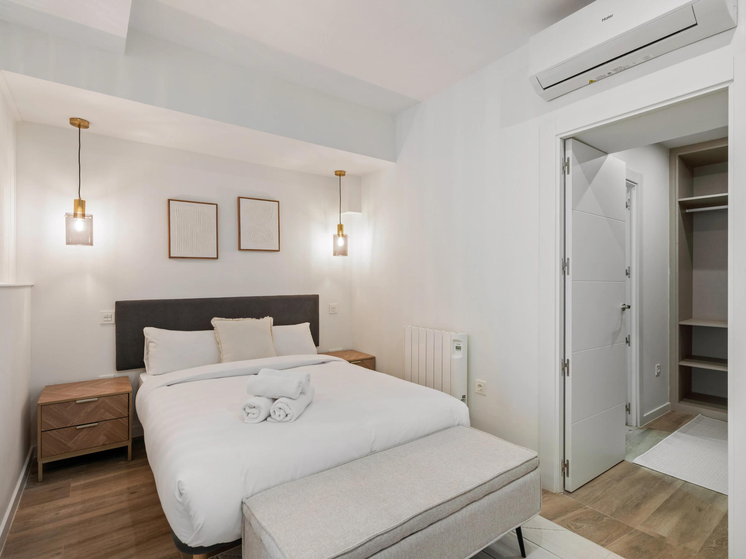 Die Wohnung verfügt über ein geräumiges und gemütliches Schlafzimmer, ausgestattet mit einem bequemen Doppelbett, eingebauten Schränken und eleganter Dekoration, die Ihnen erlauben wird, nach der Erkundung der Stadt angenehm zu ruhen. Das Schlafzimmer, natürlich beleuchtet durch seine großen Fenster, bietet eine warme und entspannende Atmosphäre.