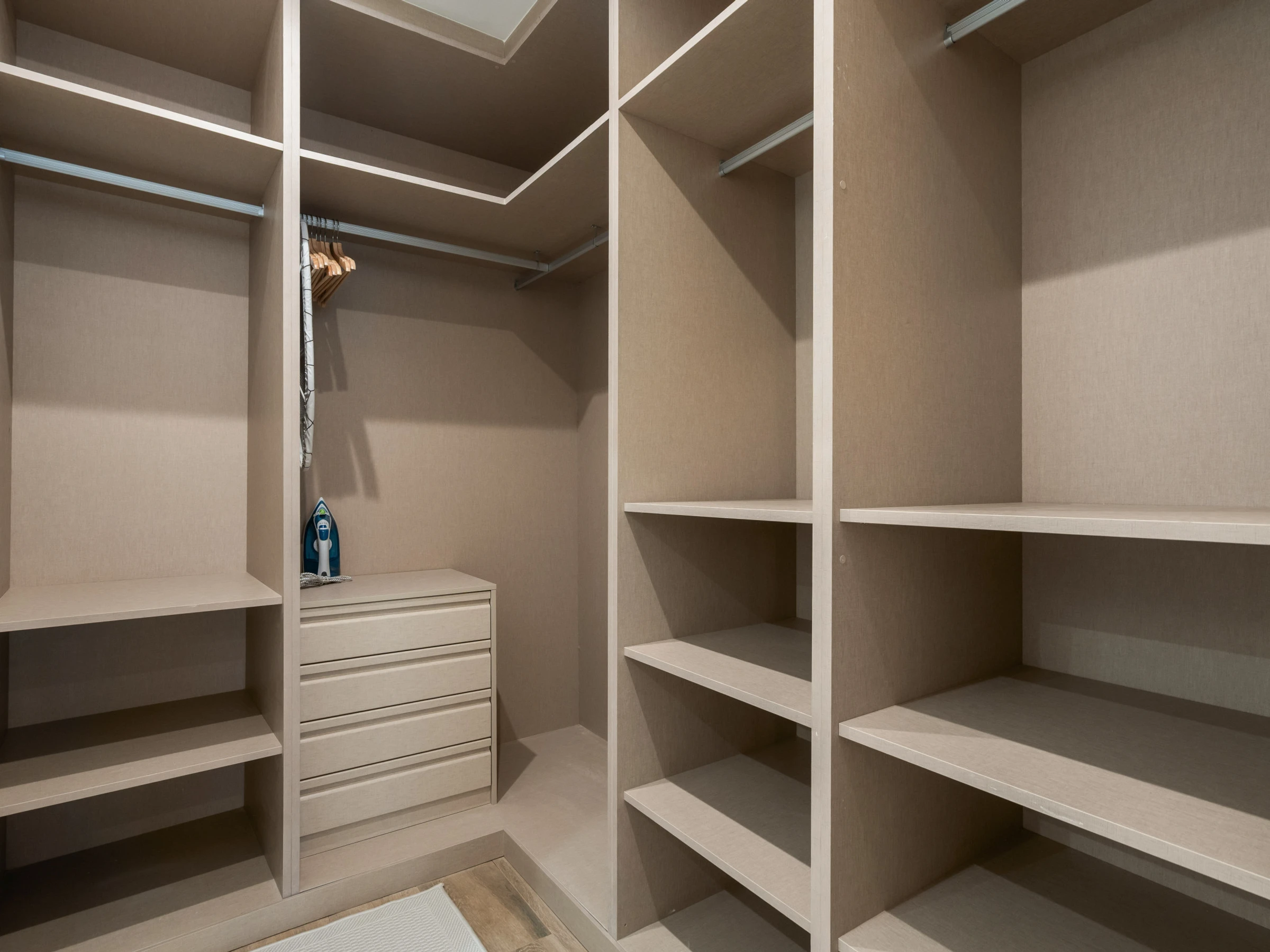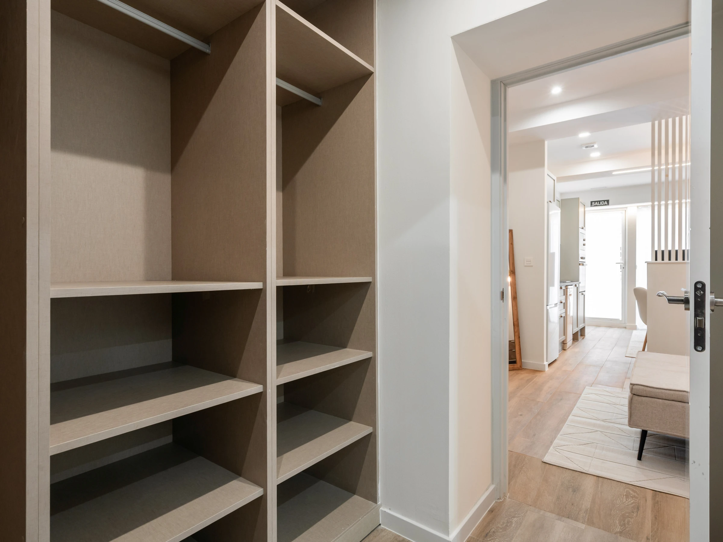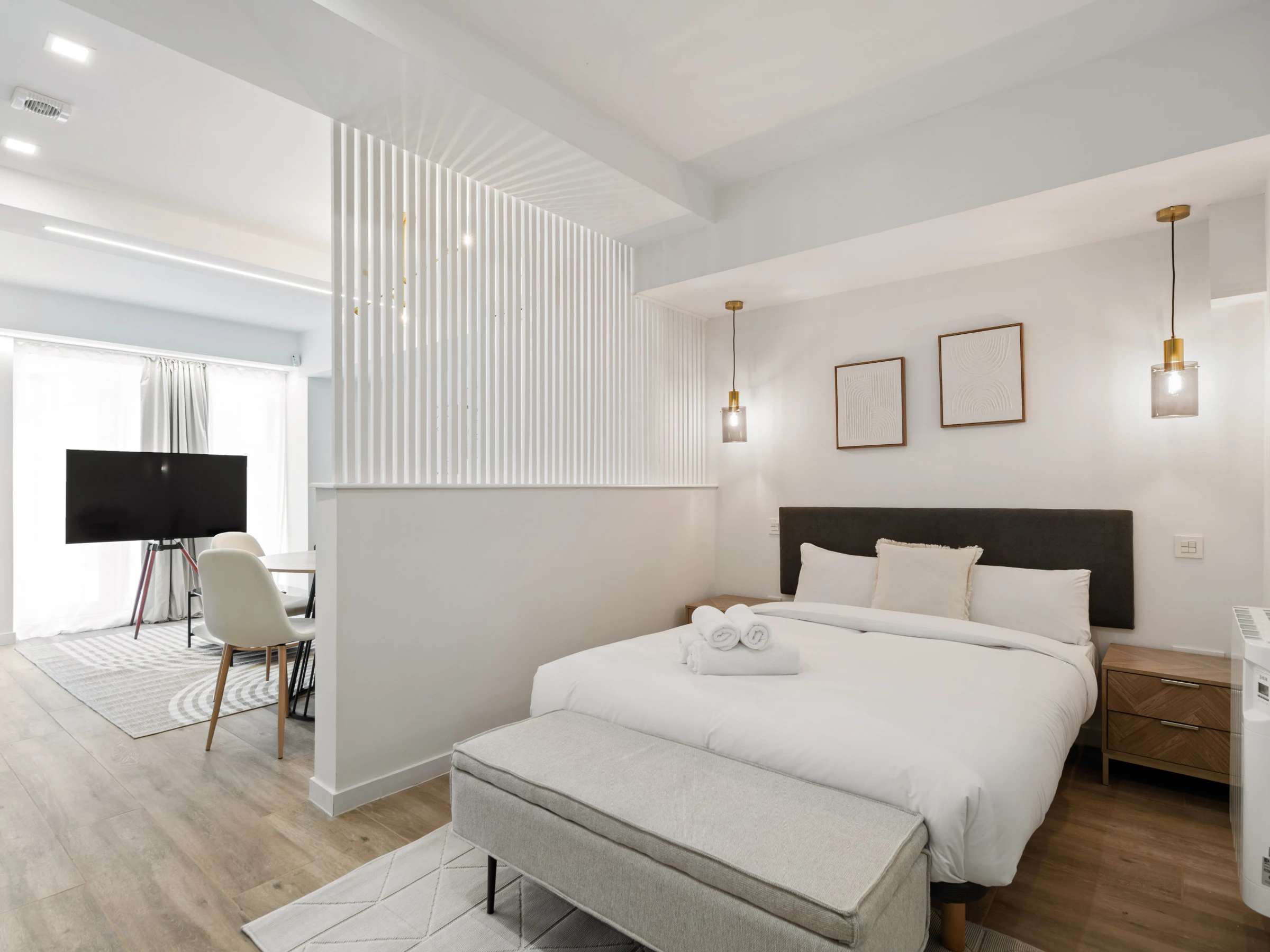 Die Wohnung verfügt über ein geräumiges und gemütliches Schlafzimmer, ausgestattet mit einem bequemen Doppelbett, eingebauten Schränken und eleganter Dekoration, die Ihnen erlauben wird, nach der Erkundung der Stadt angenehm zu ruhen. Das Schlafzimmer, natürlich beleuchtet durch seine großen Fenster, bietet eine warme und entspannende Atmosphäre.