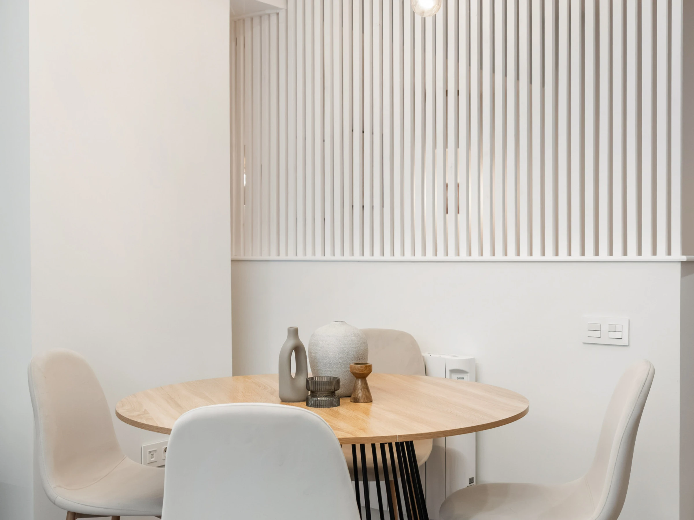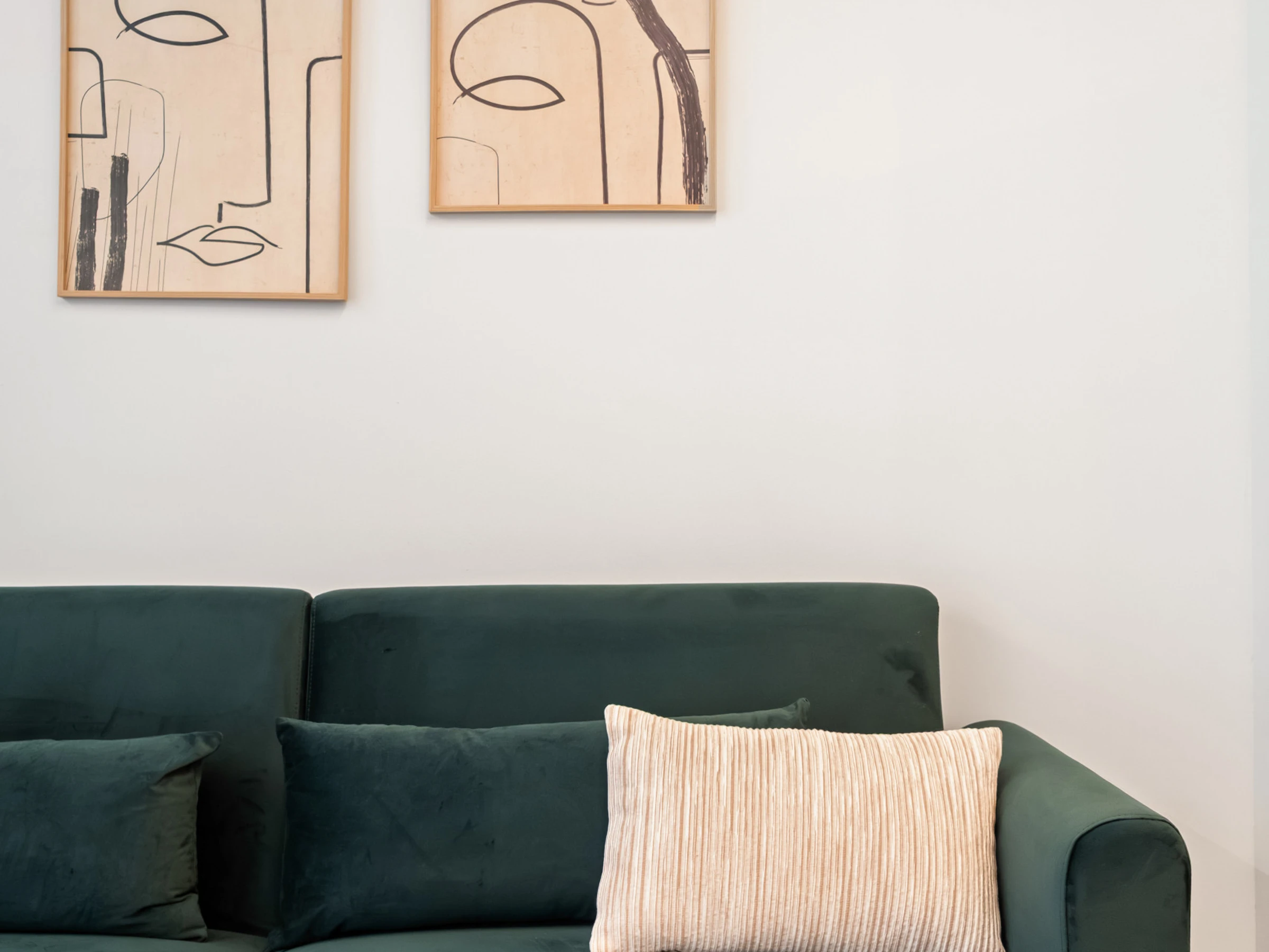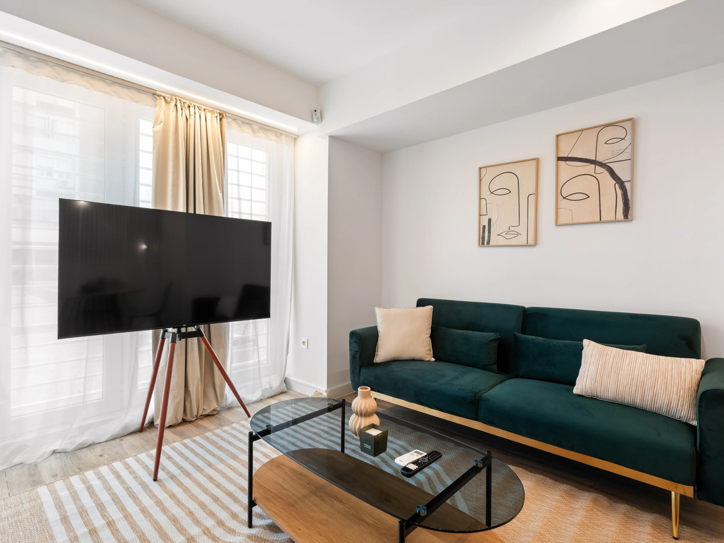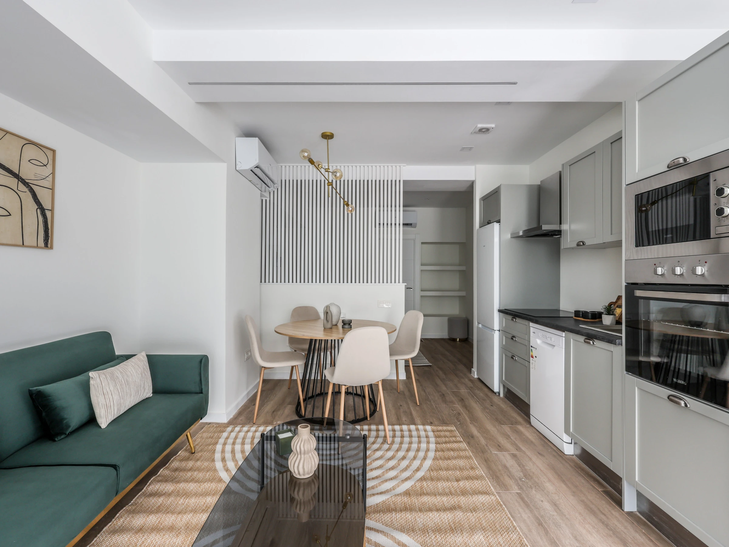 Der Wohnbereich, mit einem offenen und zeitgenössischen Design, ist mit bequemer und stilvoller Möblierung ausgestattet, einschließlich eines Schlafcouchs, das ideal für zusätzliche Gäste ist. Die Dekoration harmoniert moderne Elemente mit traditionellen Details, die an die reiche Geschichte des Viertels erinnern.