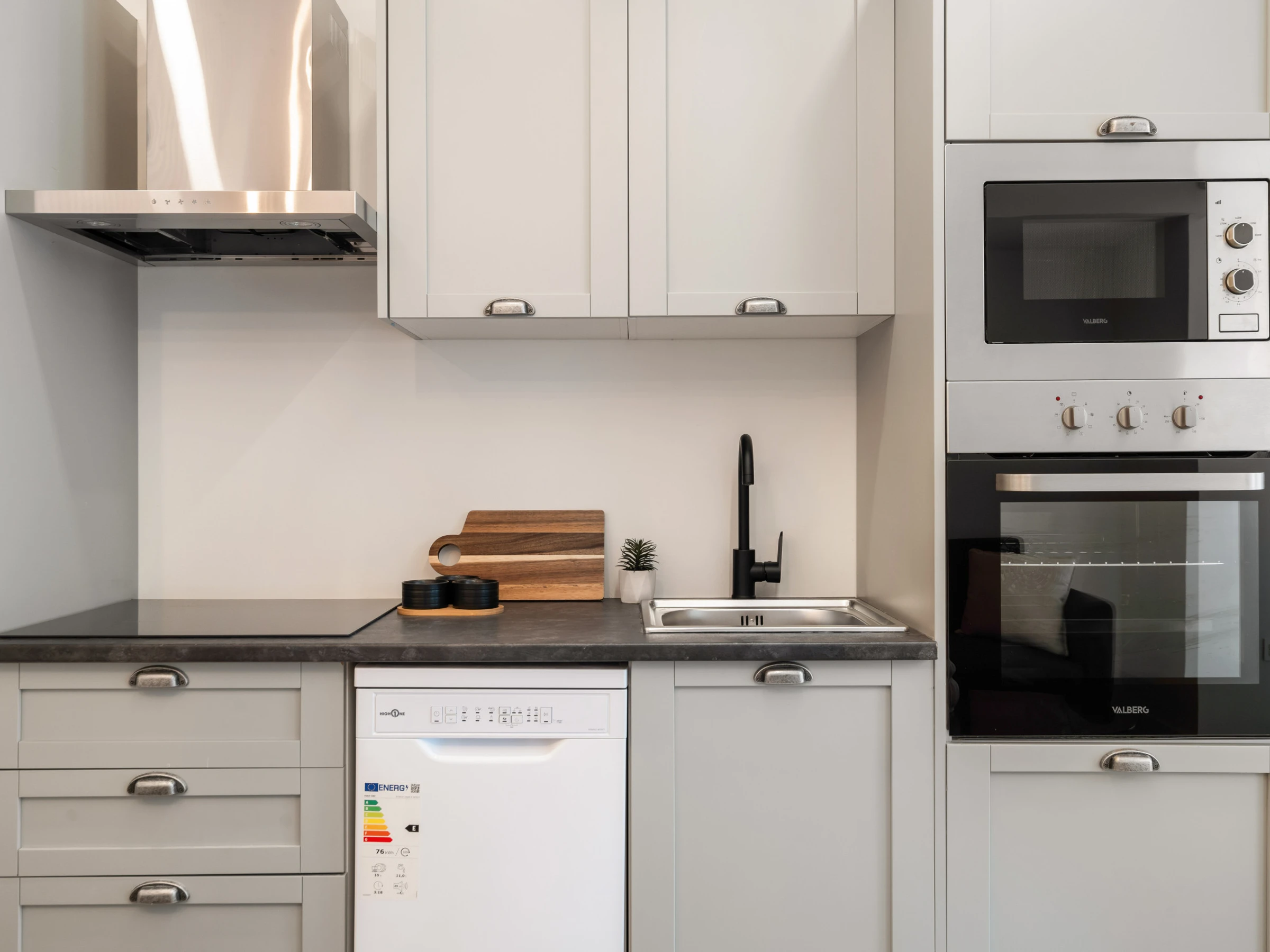 Die vollständig ausgestattete, moderne und funktionale Küche verfügt über alle notwendigen Haushaltsgeräte wie Kühlschrank, Ofen, Mikrowelle, Geschirrspüler und Kaffeemaschine sowie komplettes Kochgeschirr, perfekt um köstliche Hausmannskost zuzubereiten.