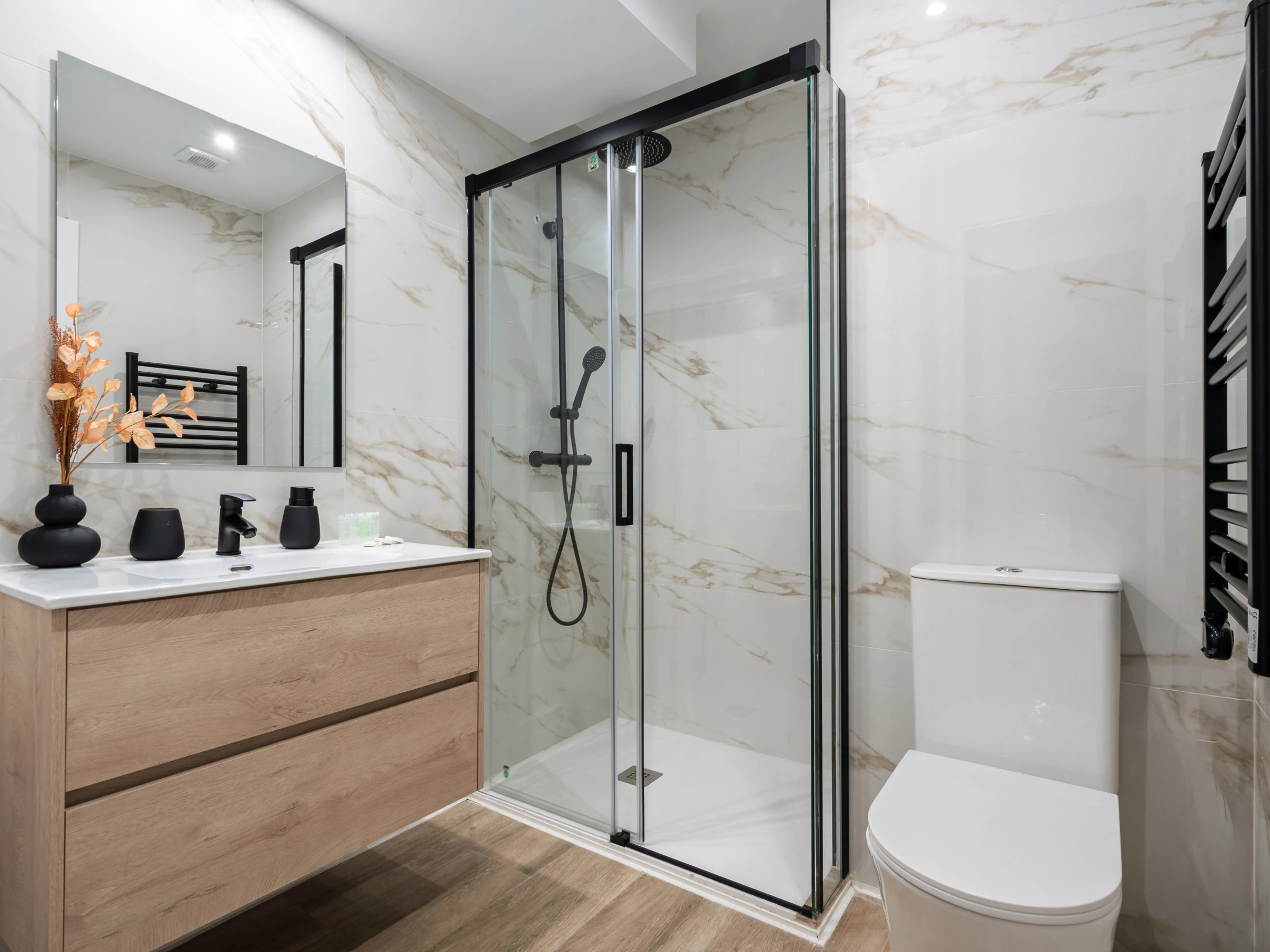 Das Badezimmer, vollständig renoviert mit einem eleganten und minimalistischen Design, bietet eine geräumige Regendusche, Grundprodukte für die persönliche Hygiene und weiche Handtücher und garantiert so ein luxuriöses und komfortables Erlebnis während Ihres gesamten Aufenthalts.