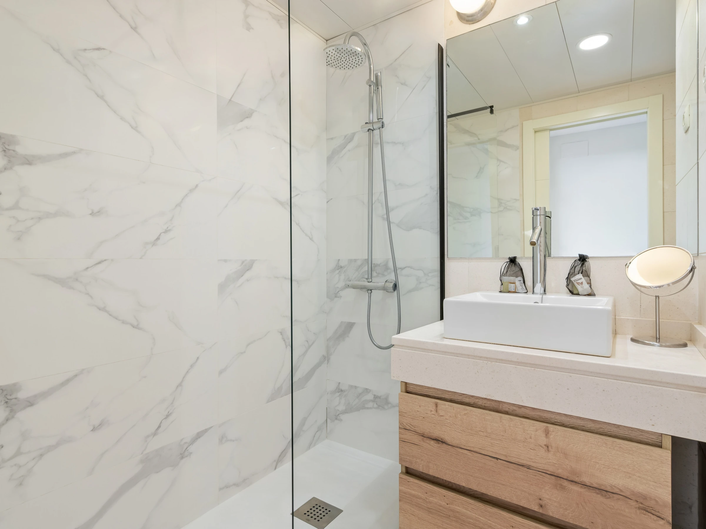 ✔ Modernes Badezimmer mit Dusche und Toilettenartikel.