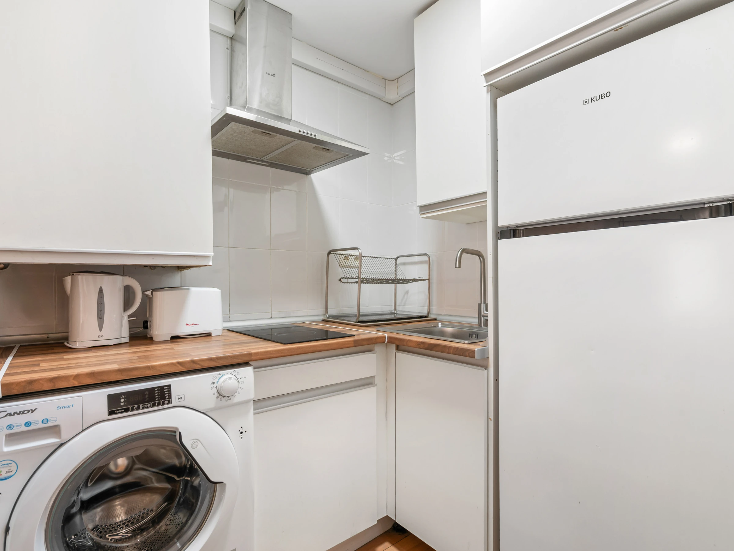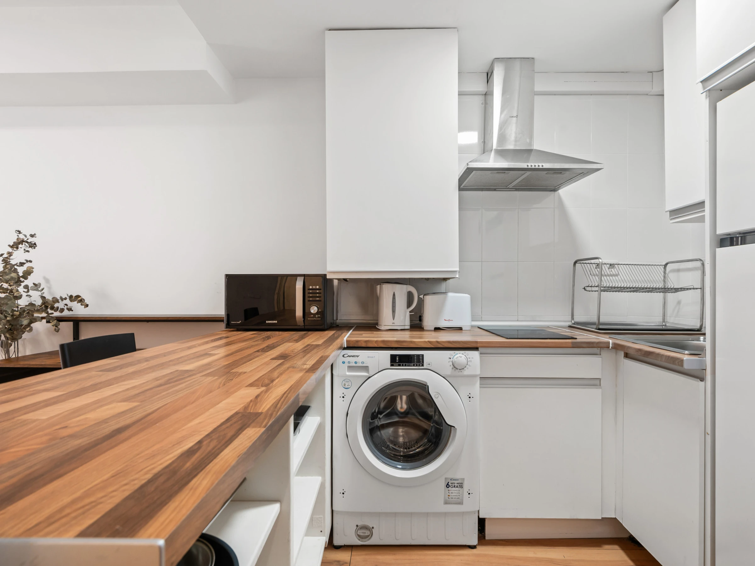 Dieses offene küche, mit induktions-kochfeld, ist ausgestattet in kühlschrank, mikrowelle, gefrierschrank, spülmaschine, geschirr/besteck, kochutensilien und kaffeemaschine.