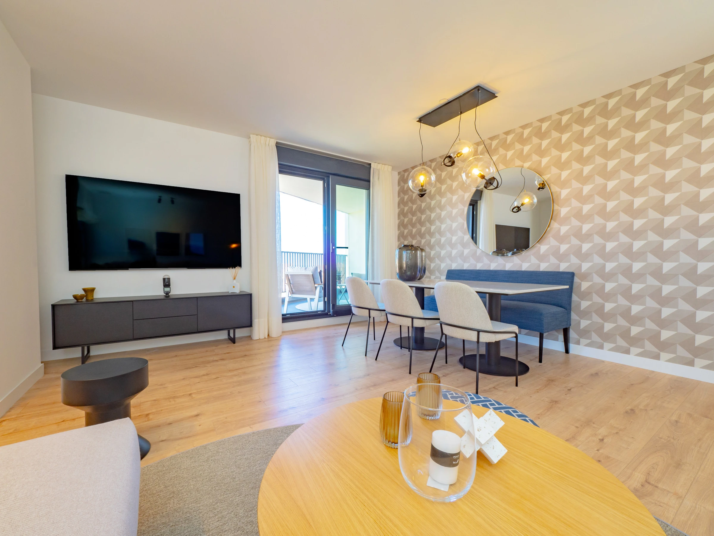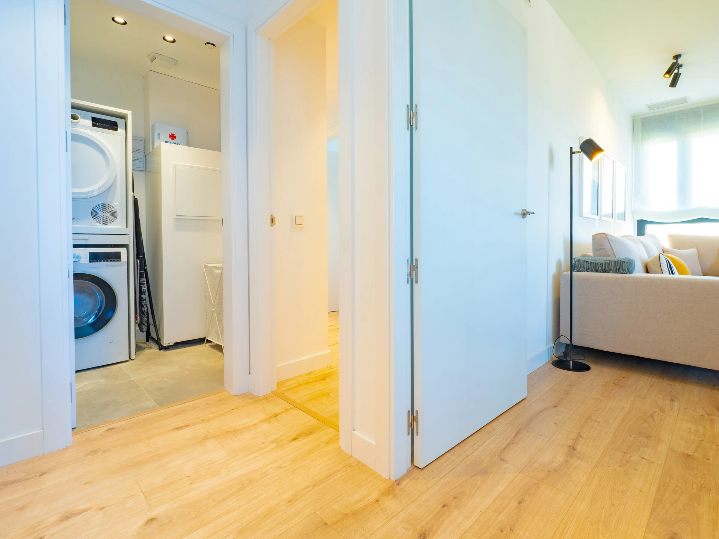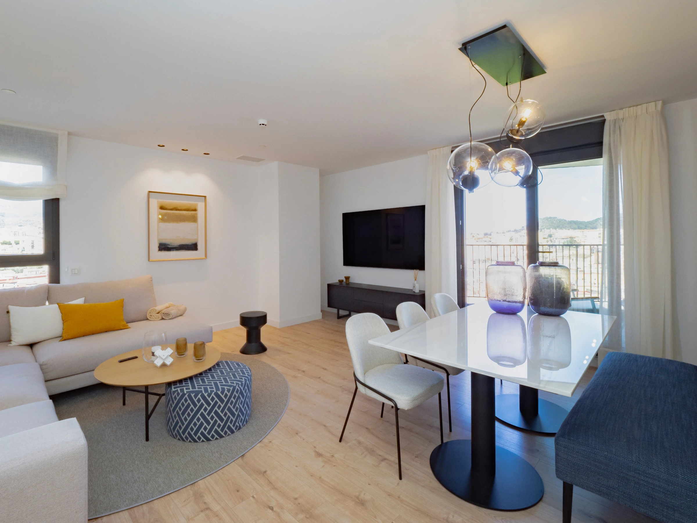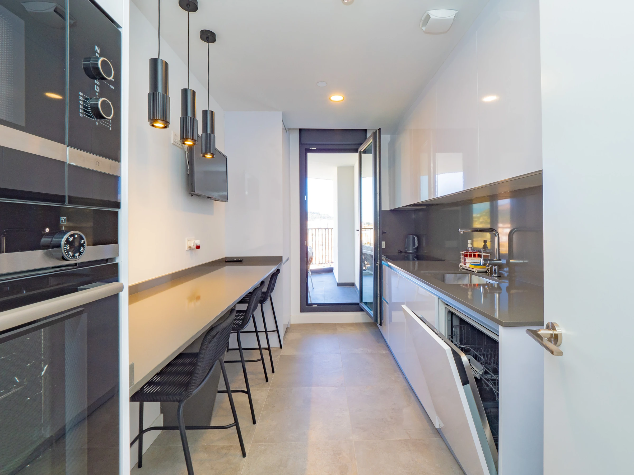 Die Wohnung verfügt über eine separate, vollständig ausgestattete Küche mit modernen Haushaltsgeräten wie Kühlschrank, Mikrowelle, Ofen, Geschirrspüler, Kaffeemaschine und mehr, perfekt zum Zubereiten Ihrer Lieblingsgerichte. Der Wohn-Essbereich ist geräumig und hell, ausgestattet mit Smart-TV für Streaming-Unterhaltung und öffnet sich zu einer 12 m² großen Terrasse, auf der Sie den Sonnenaufgang über der Stadt genießen können. Darüber hinaus verfügt sie über Waschmaschine, Trockner, Bügeleisen, Zentralheizung und Klimaanlage im gesamten Raum für Ihren Komfort während jeder Jahreszeit.