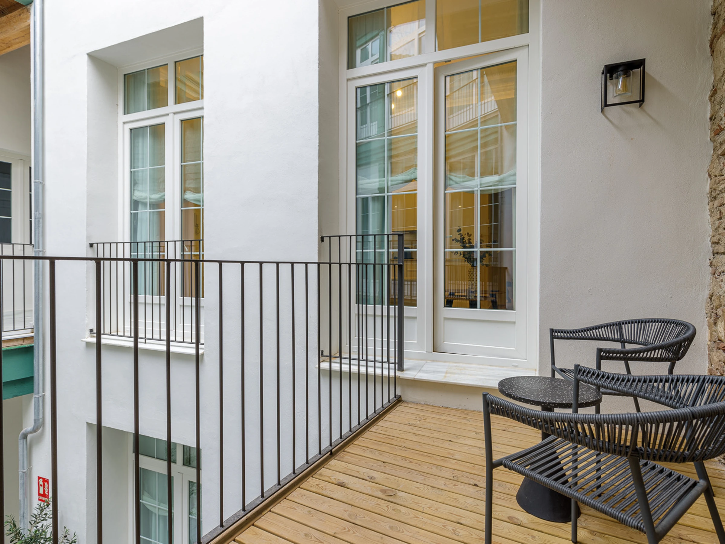 Hohe Fenster und Balkone bieten einen faszinierenden Blick auf den andalusischen Innenhof und lassen die Gäste in eine warme Atmosphäre der Ruhe und Eleganz eintauchen. Ein Werk, das seinen Charme in jedem Element bewahrt: restaurierte Marmor- und Hydraulikböden, sanierte Säulen, gerettete Türen, wiederhergestellter Innenhof oder der einfache restaurierte und wiedergeborene Brunnen. Das Charisma jedes architektonischen Elements entführt unsere Gäste in eine Zeit der Frische und des Flairs.
