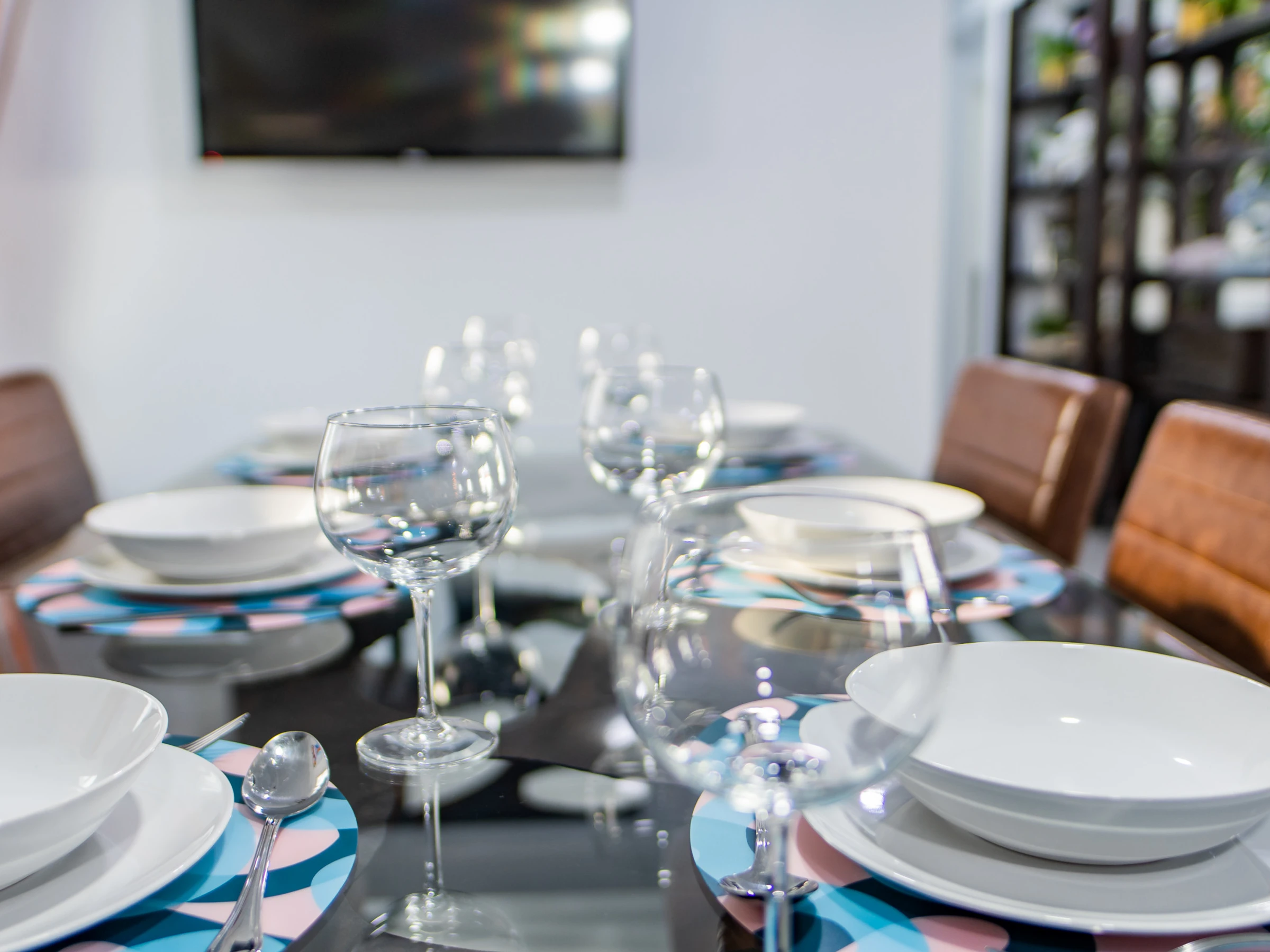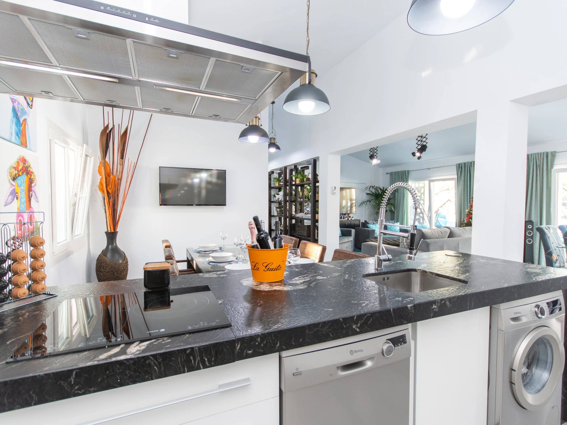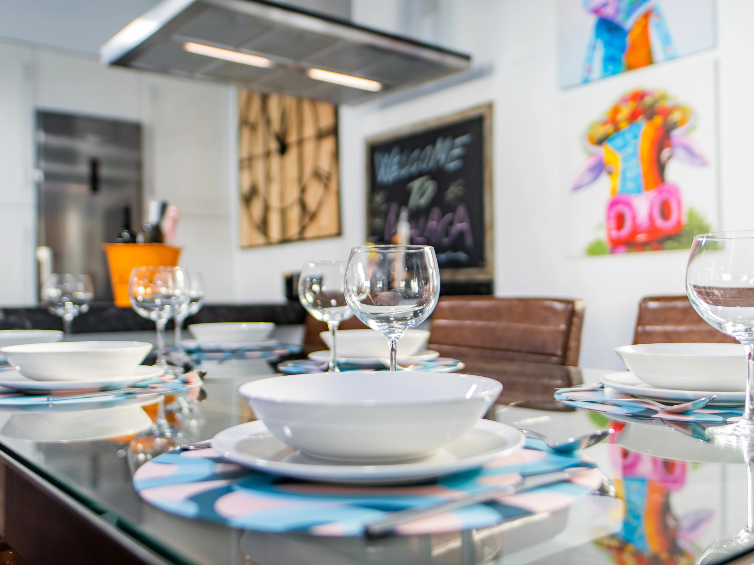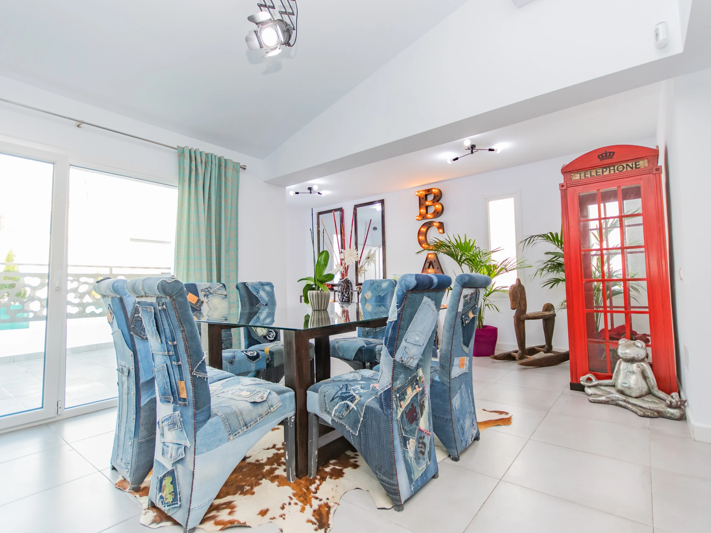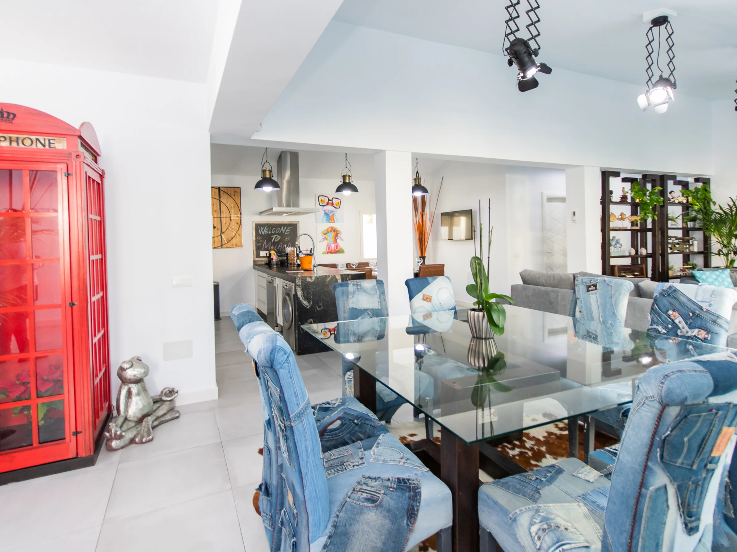 Im Inneren sticht der Eingang durch seine originelle und gemütliche Dekoration hervor, die einen besonderen Aufenthalt ankündigt. Der Salon kombiniert Esszimmer- und amerikanische Küchenzone mit moderner Einrichtung und einem eleganten Glastisch mit Stühlen, die mit Jeansgewebe bezogen sind, und schafft eine einzigartige Atmosphäre für Ihre Abendessen. Zusätzlich verfügt er über einen zweiten praktischen Esstisch, um Fernsehen zu können, während Sie kochen. 📺🍽️