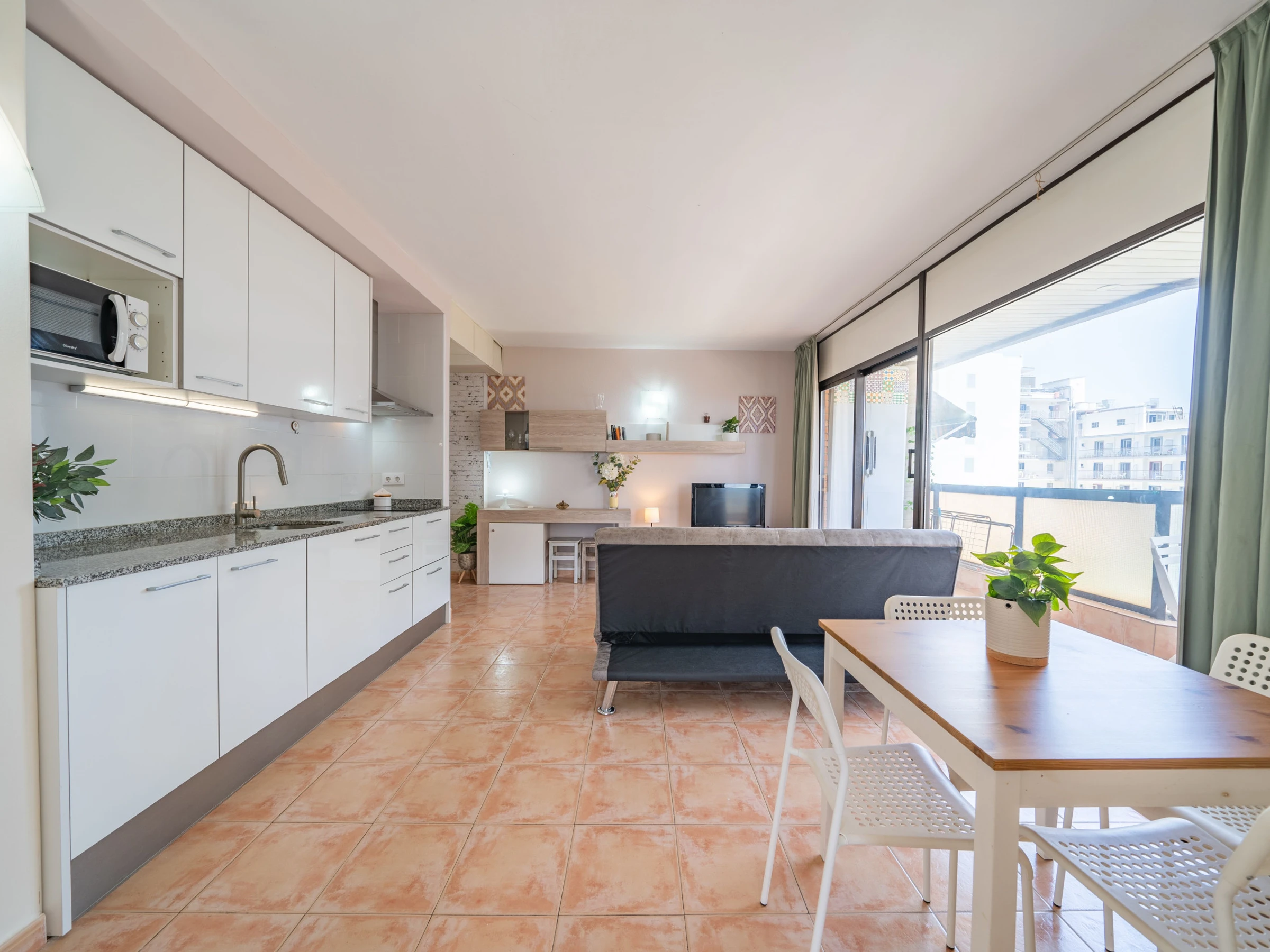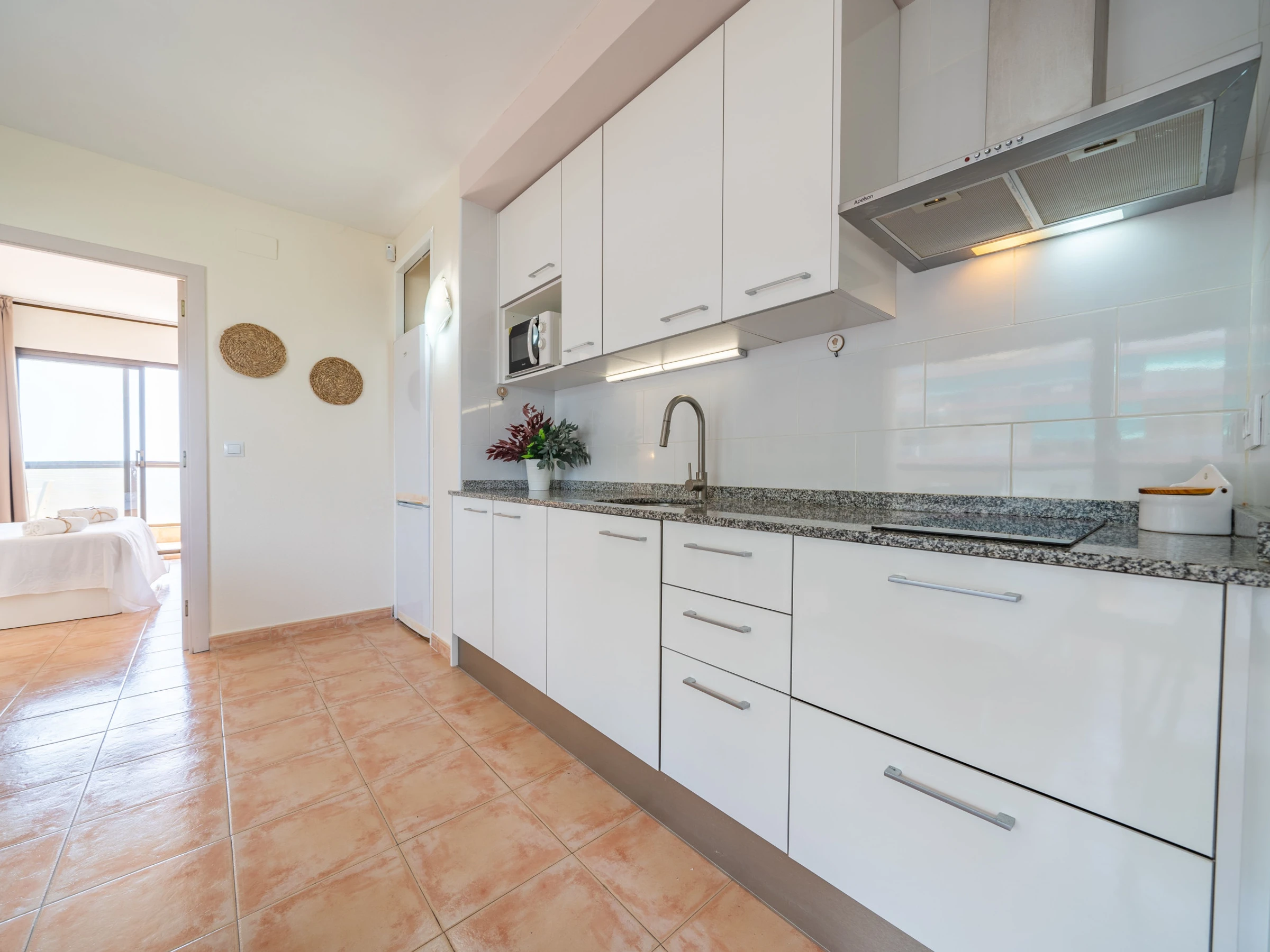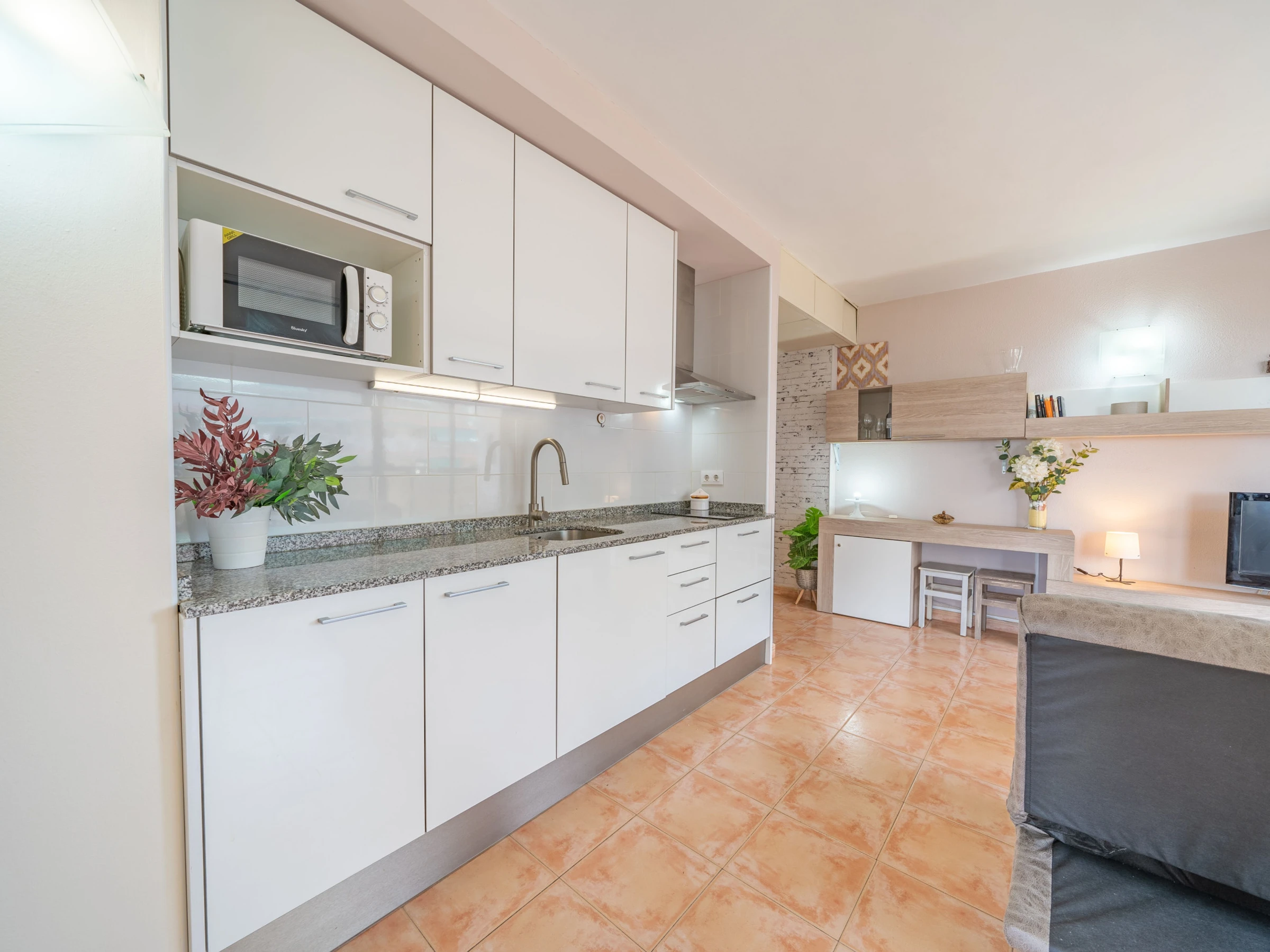 Dieses offene küche, elektrisches kochfeld, ist ausgestattet in kühlschrank, mikrowelle, gefrierschrank, geschirr/besteck, kochutensilien, kaffeemaschine, toaster und saftpresse.