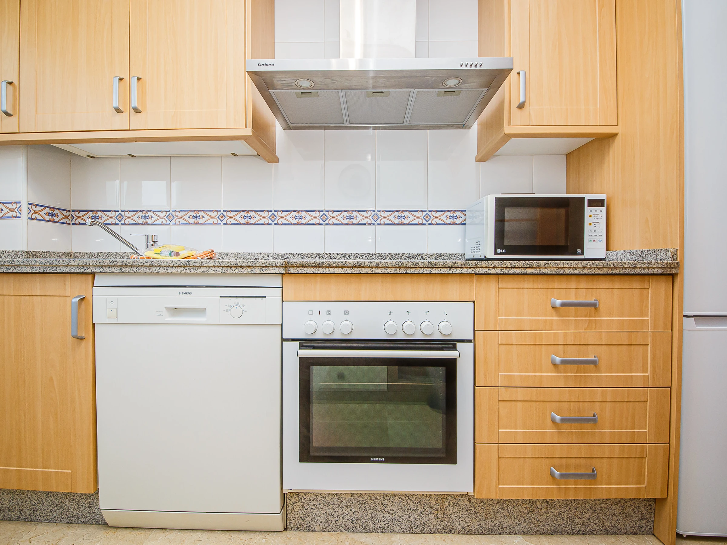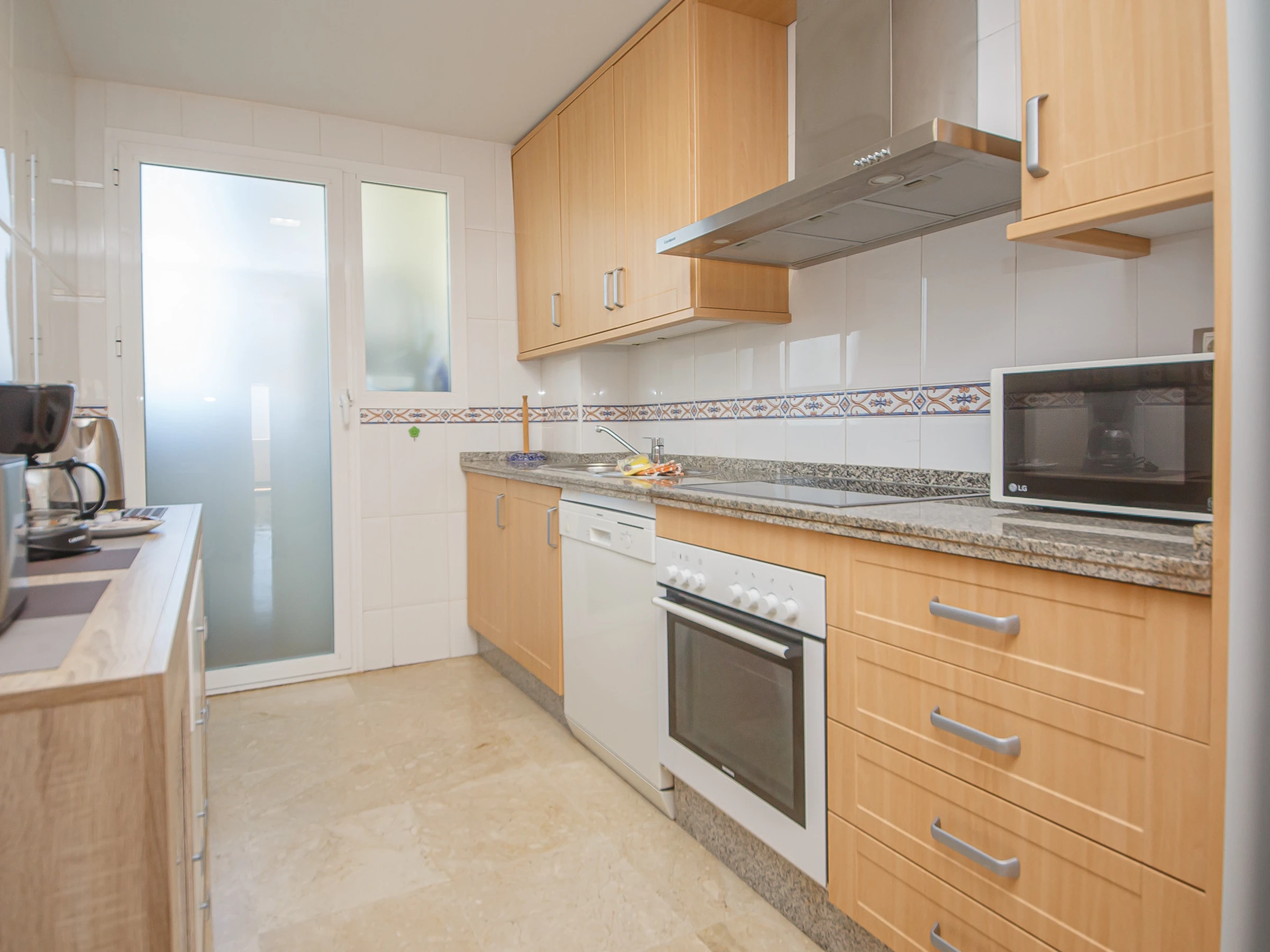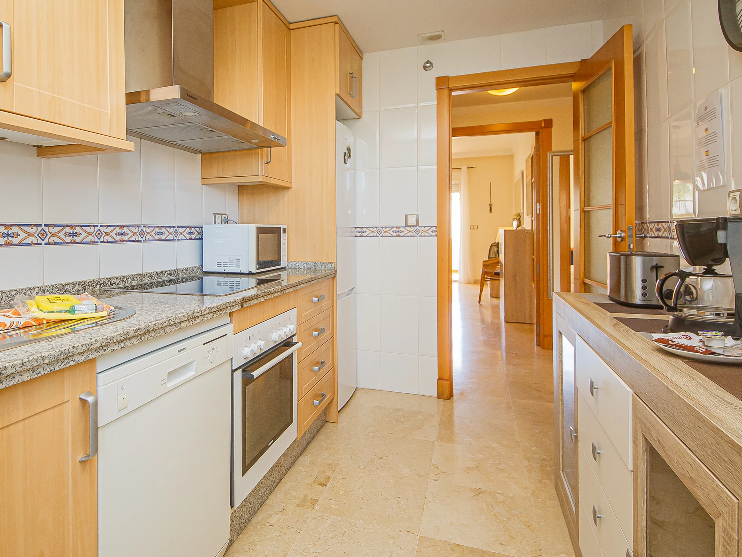 Dieses separate küche, mit ceranfeld, ist ausgestattet in kühlschrank, mikrowelle, backofen, gefrierschrank, spülmaschine, geschirr/besteck, kochutensilien, kaffeemaschine, toaster und wasserkocher.