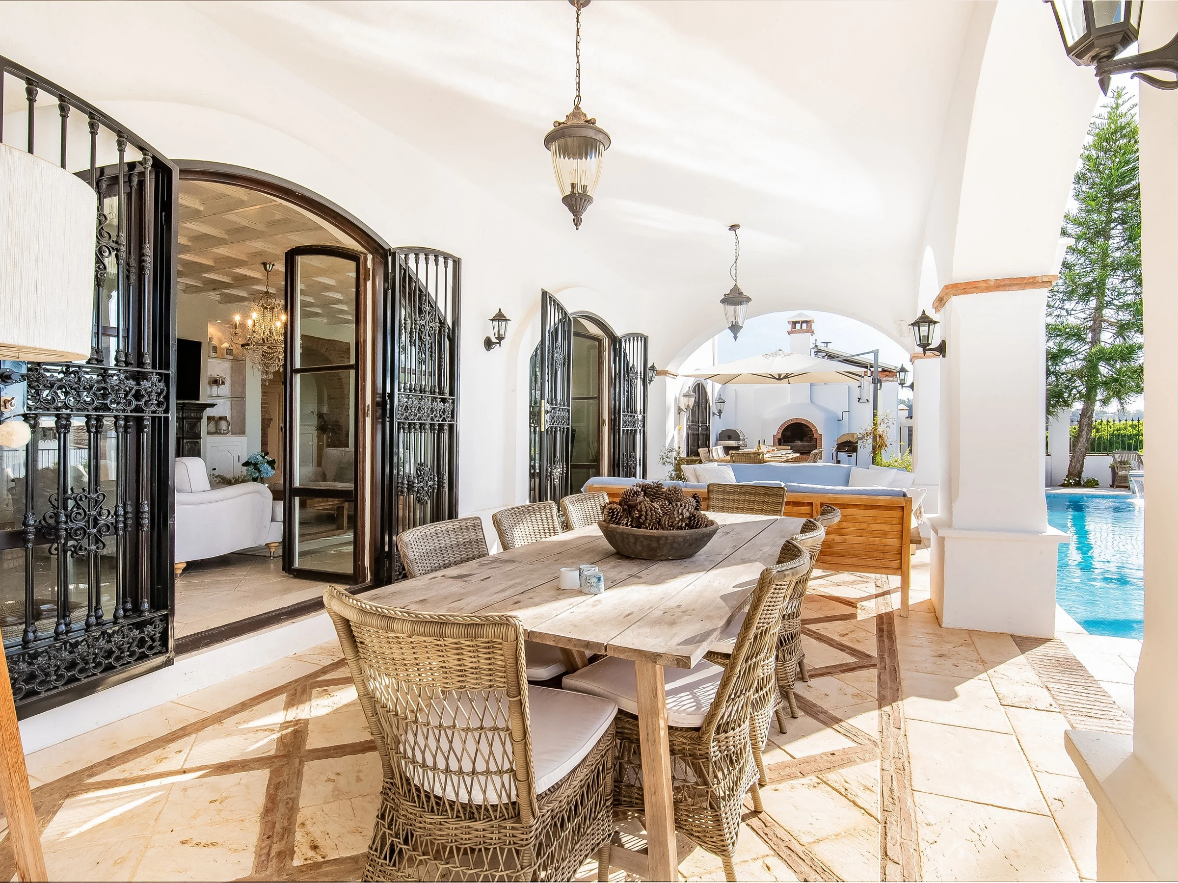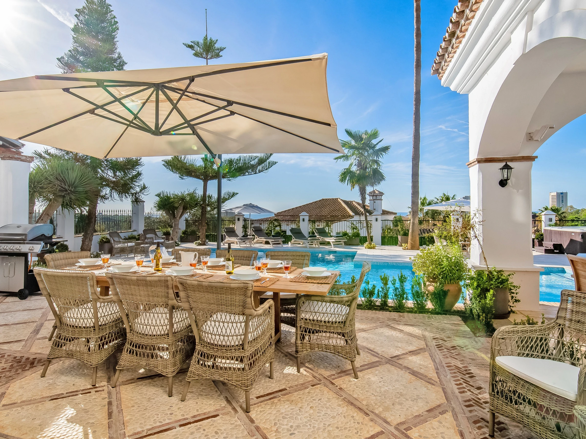 Eine wunderbare andalusische Villa mit fantastischen Außenanlagen wie einem beheizten Privatpool und Whirlpool in kurzer Entfernung zum feinen Strand. Die Villa ist für 12 Personen.