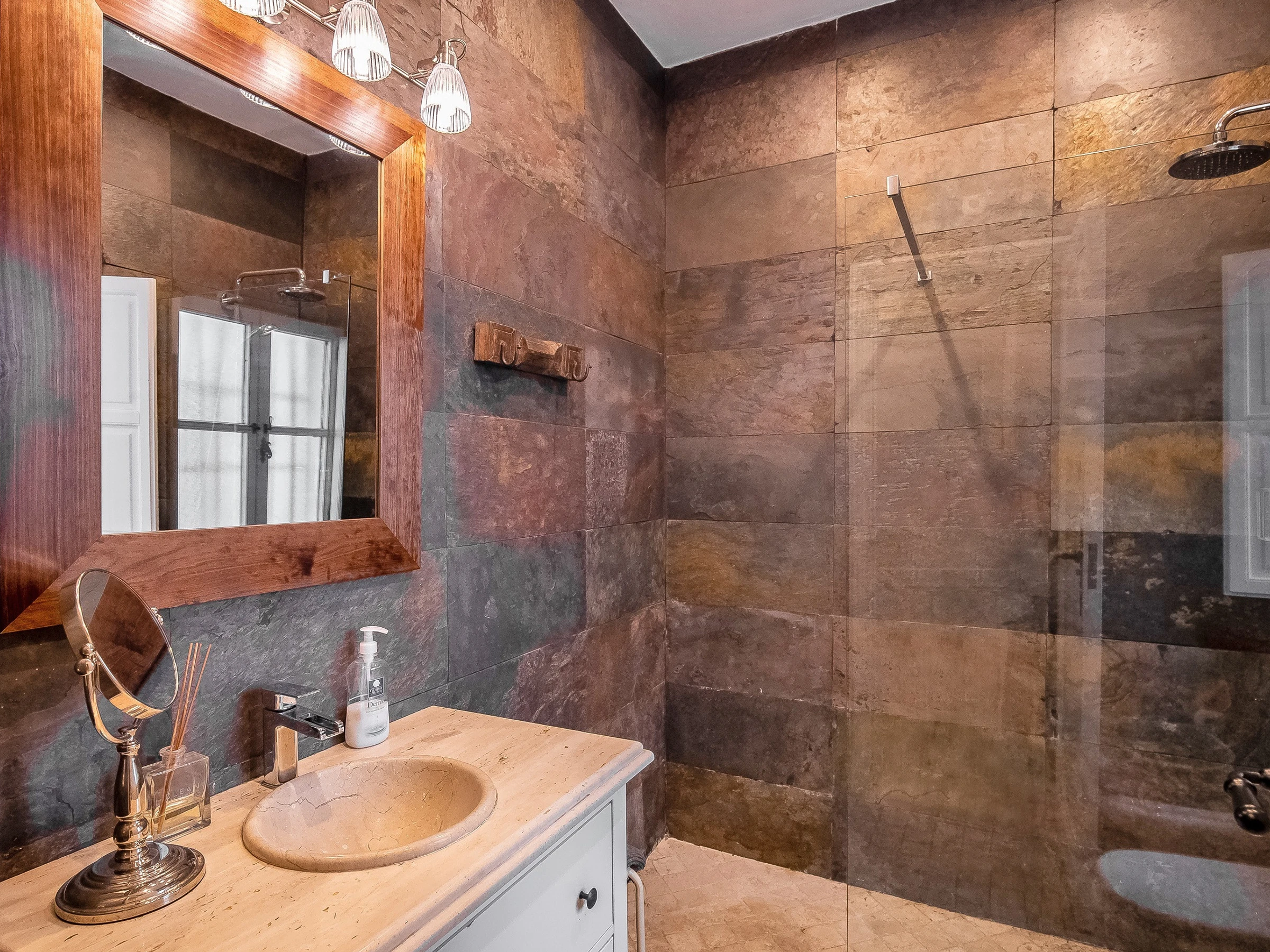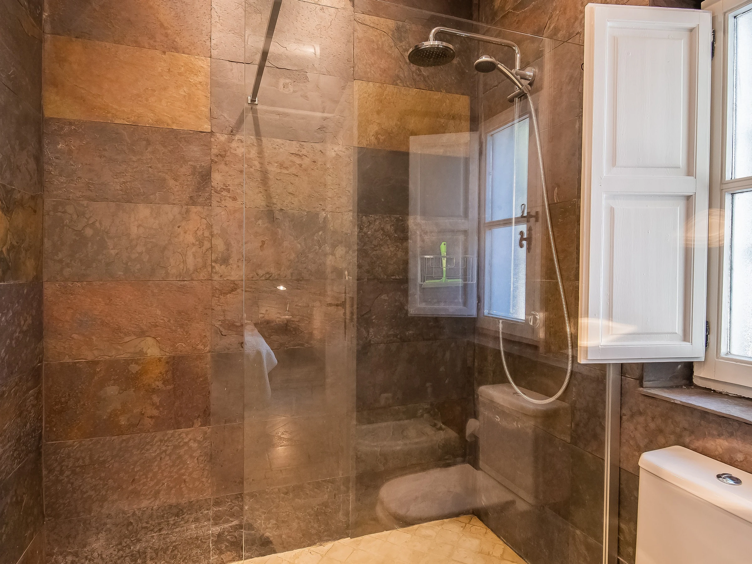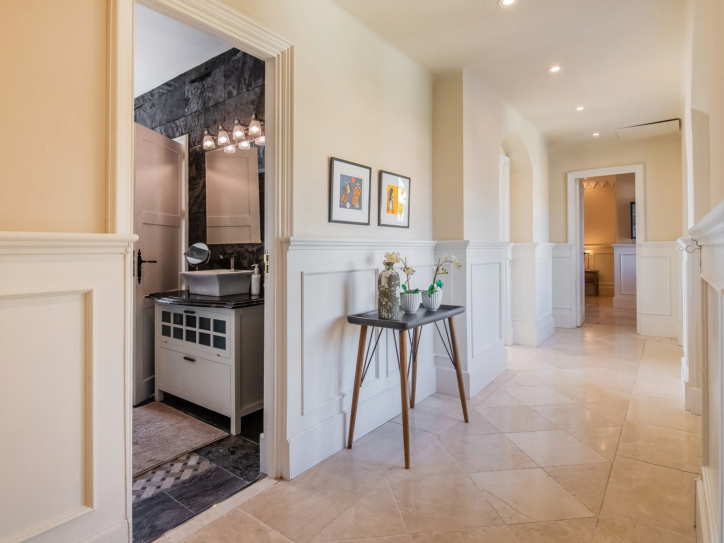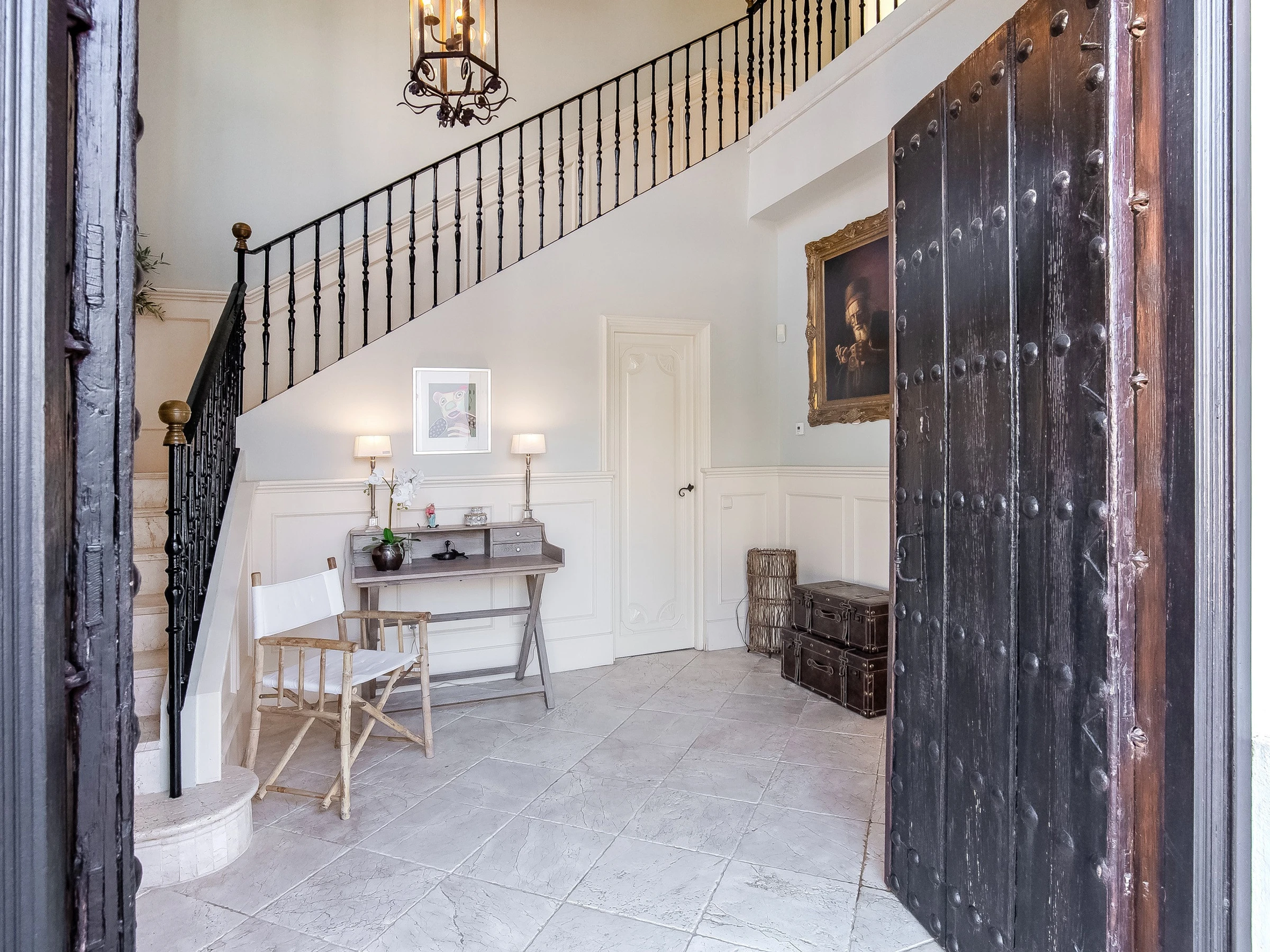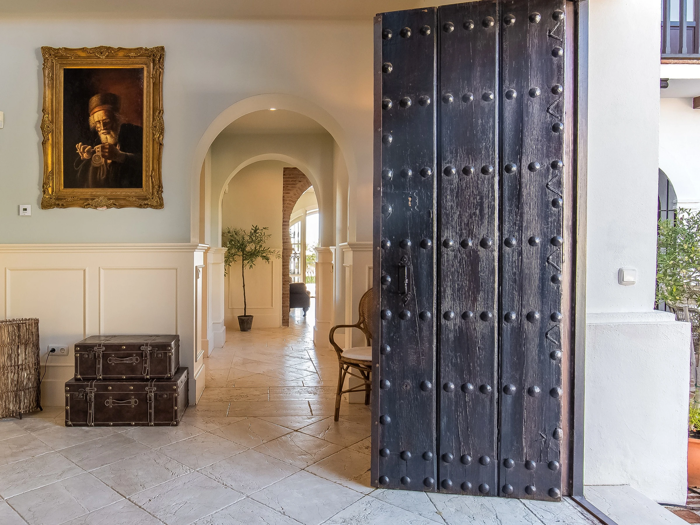 Der beeindruckende Eingang der Villa mit einer Deckenhöhe von 6 Metern über dem Boden hat ein Gäste-WC und führt zum Obergeschoss mit 3 Schlafzimmern. Die beiden anderen Schlafzimmer befinden sich im Erdgeschoss.