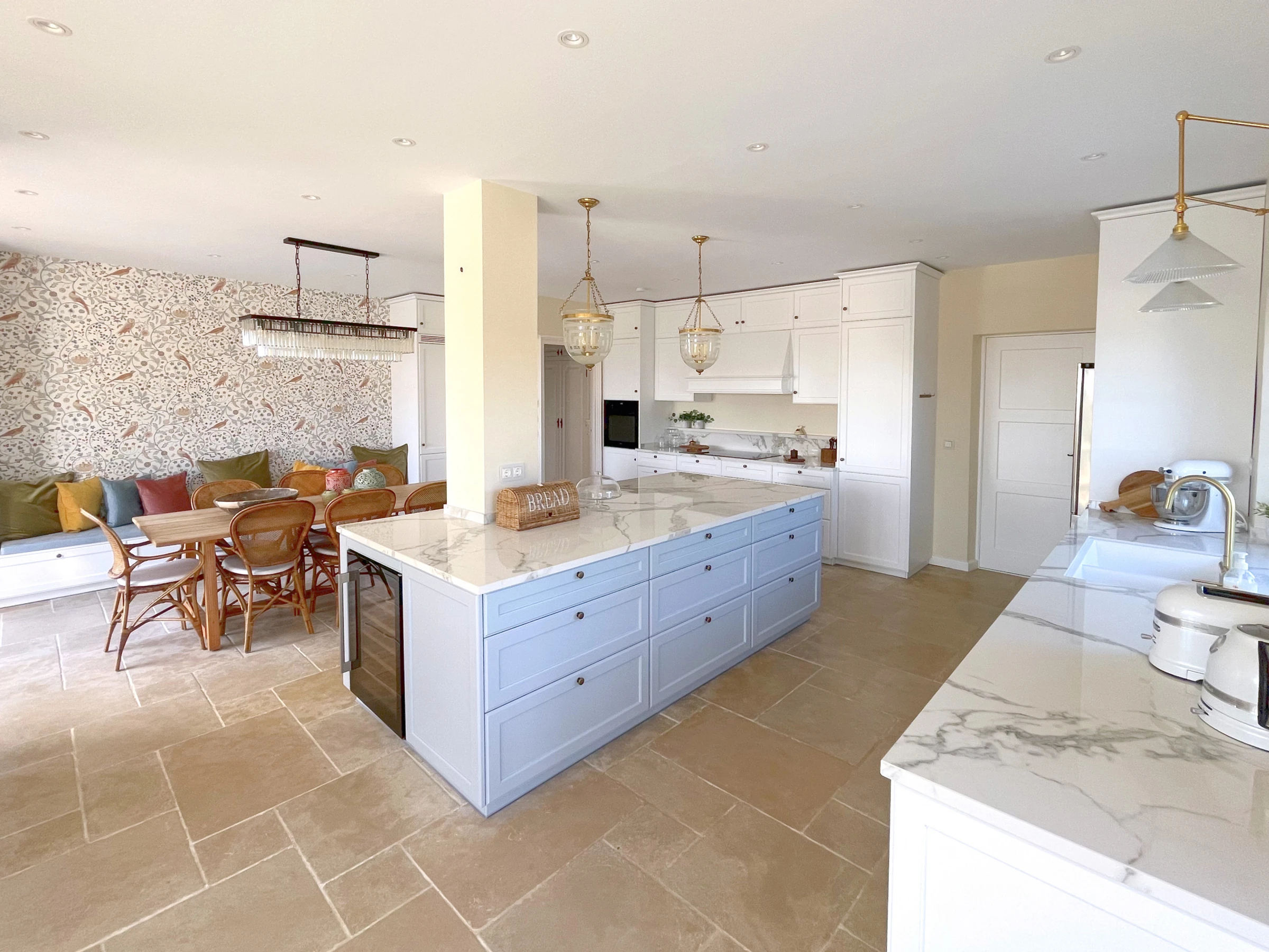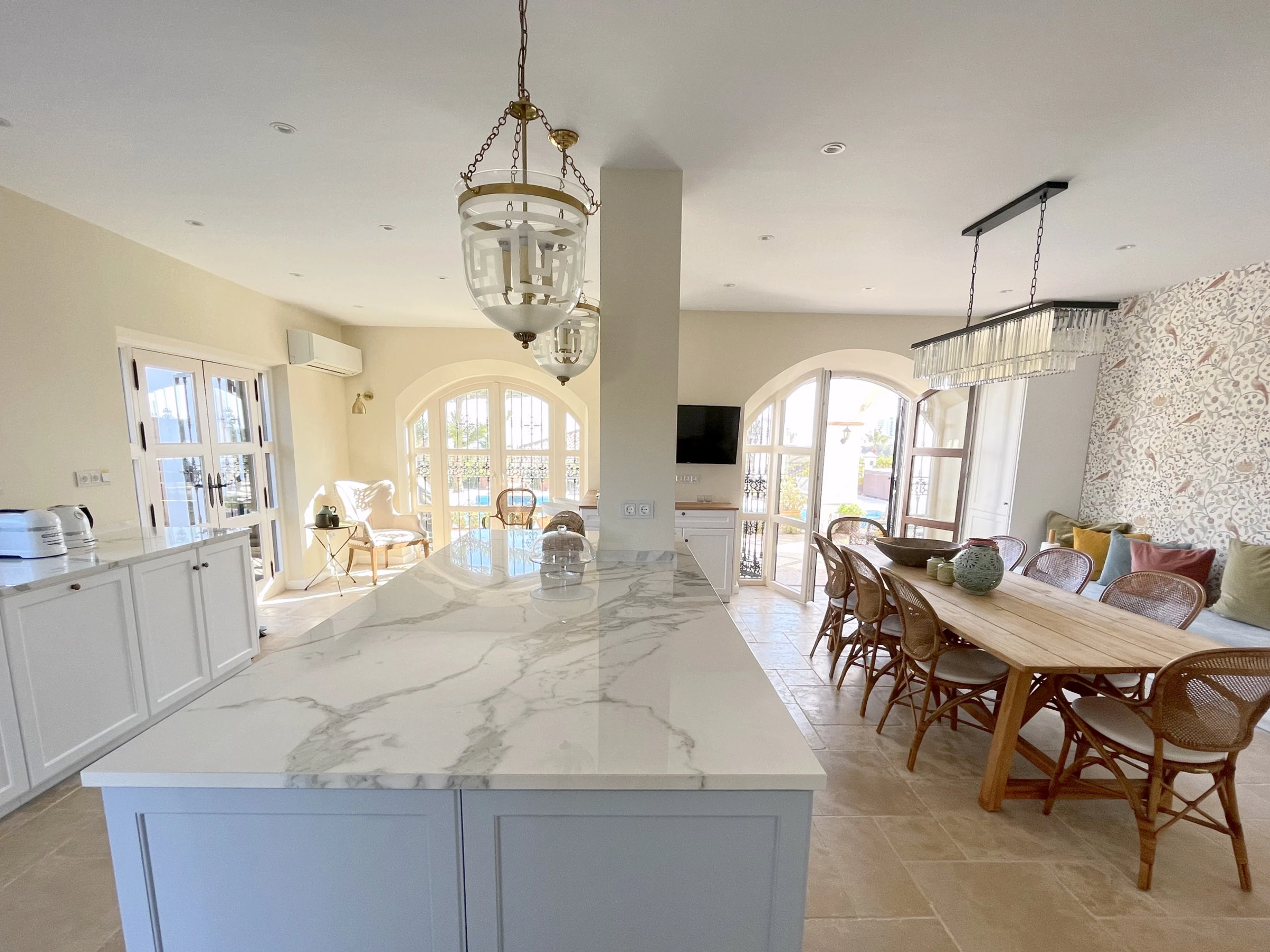Die riesige und mehr als gut ausgestattete Küche mit Esstisch hat eine gemütliche Atmosphäre. Die Kochinsel ermöglicht es Ihnen, sich mit dem Koch beim Abendessen zu unterhalten.