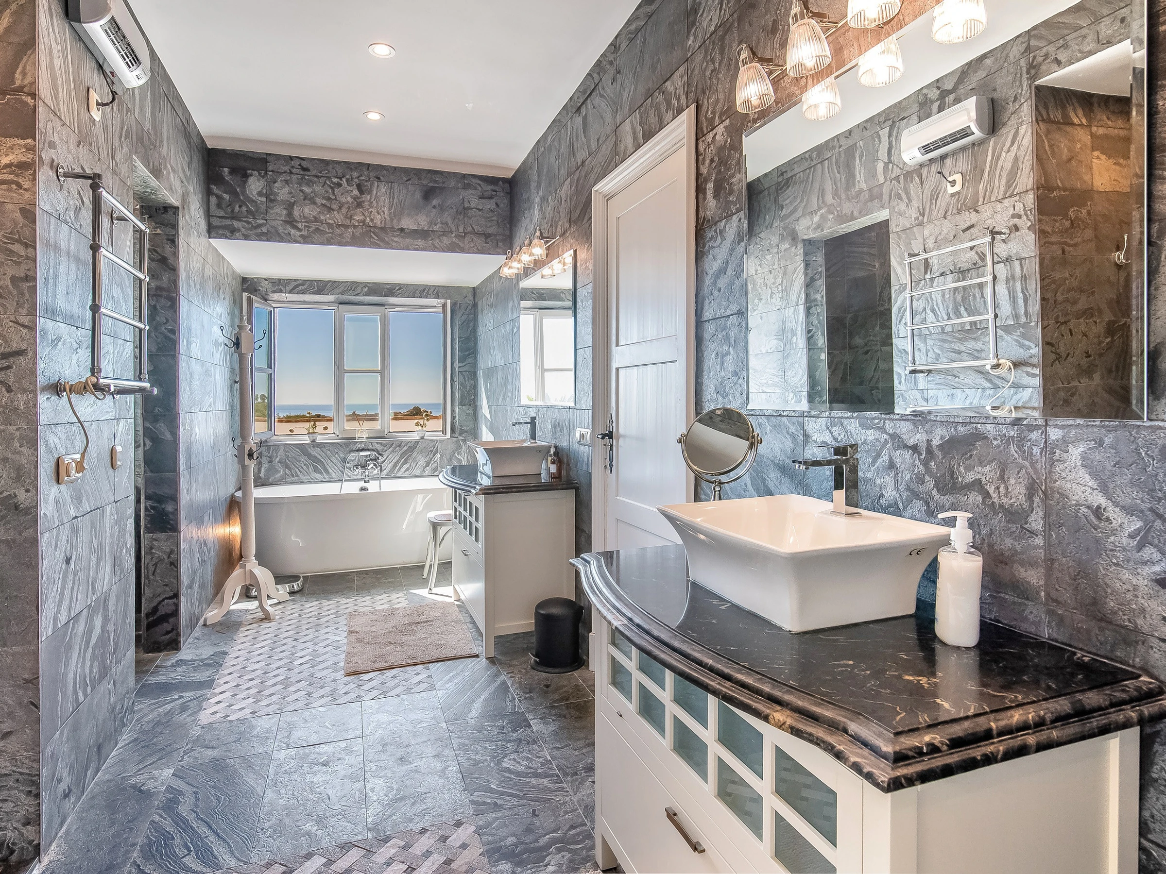 Ein Hauptschlafzimmer mit Doppelbett und en-suite Badezimmer mit 2 unabhängigen Waschbecken, einer Badewanne, einer Dusche und einer Toilette.