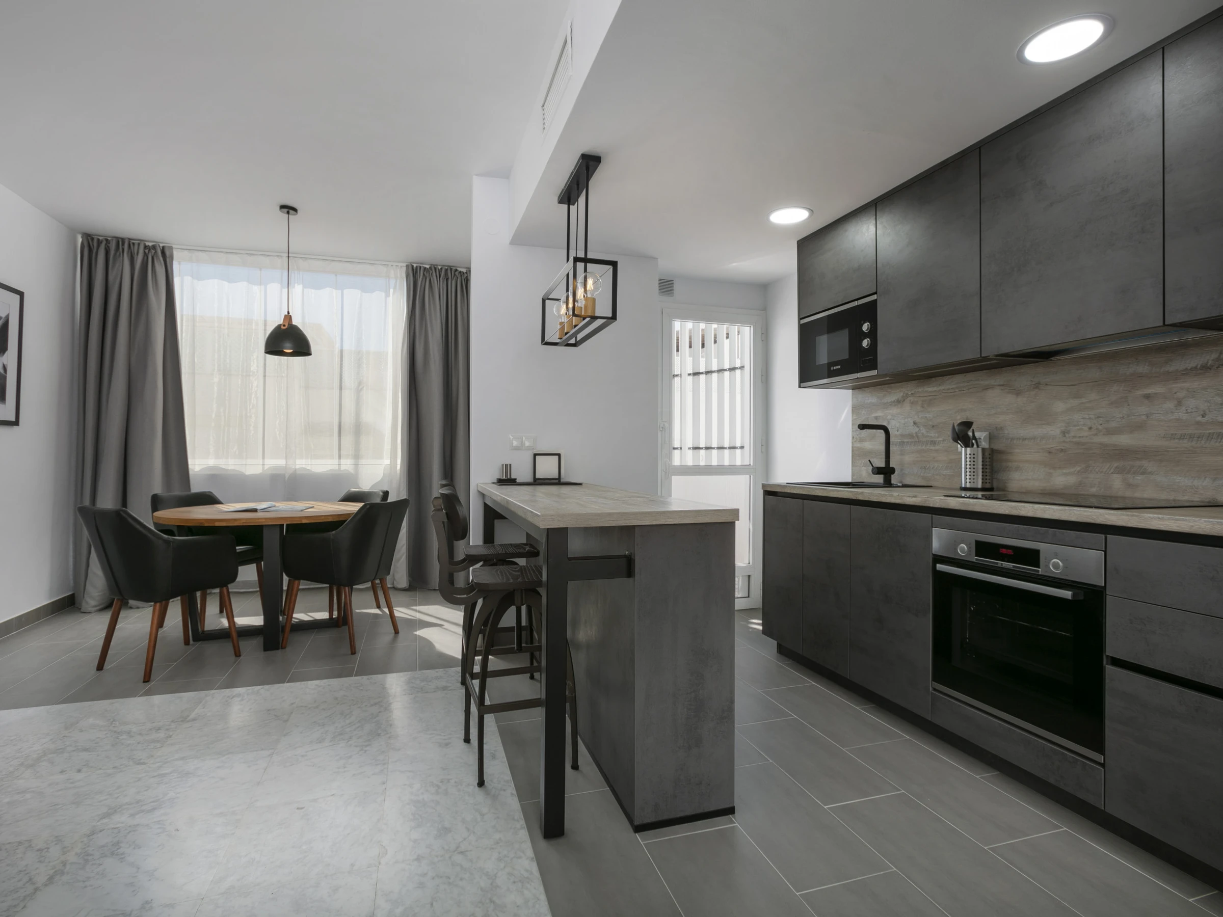 Die Wohnung umfasst einen offenen Wohnbereich, Küche und Essbereich, mit neuen Möbeln und Geräten im gesamten Raum. Der gesamte Bereich ist hell und offen, perfekt zum Sozialisieren und Entspannen mit der Familie auf den gemütlichen Sofas und Sesseln oder im Essbereich mit Blick aufs Meer. Der Flur führt zum Hauptschlafzimmer mit Kingsize-Bett und geräumigem Badezimmer mit Walk-in-Dusche.