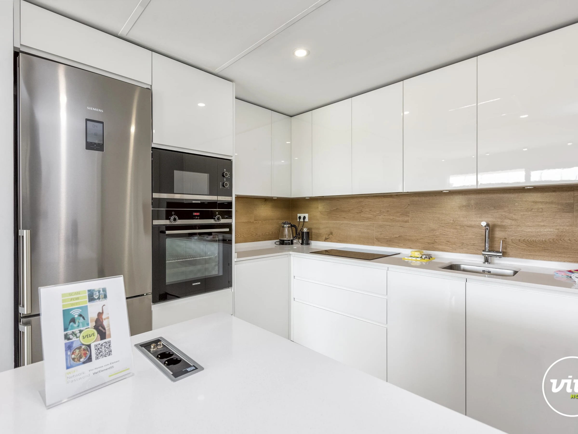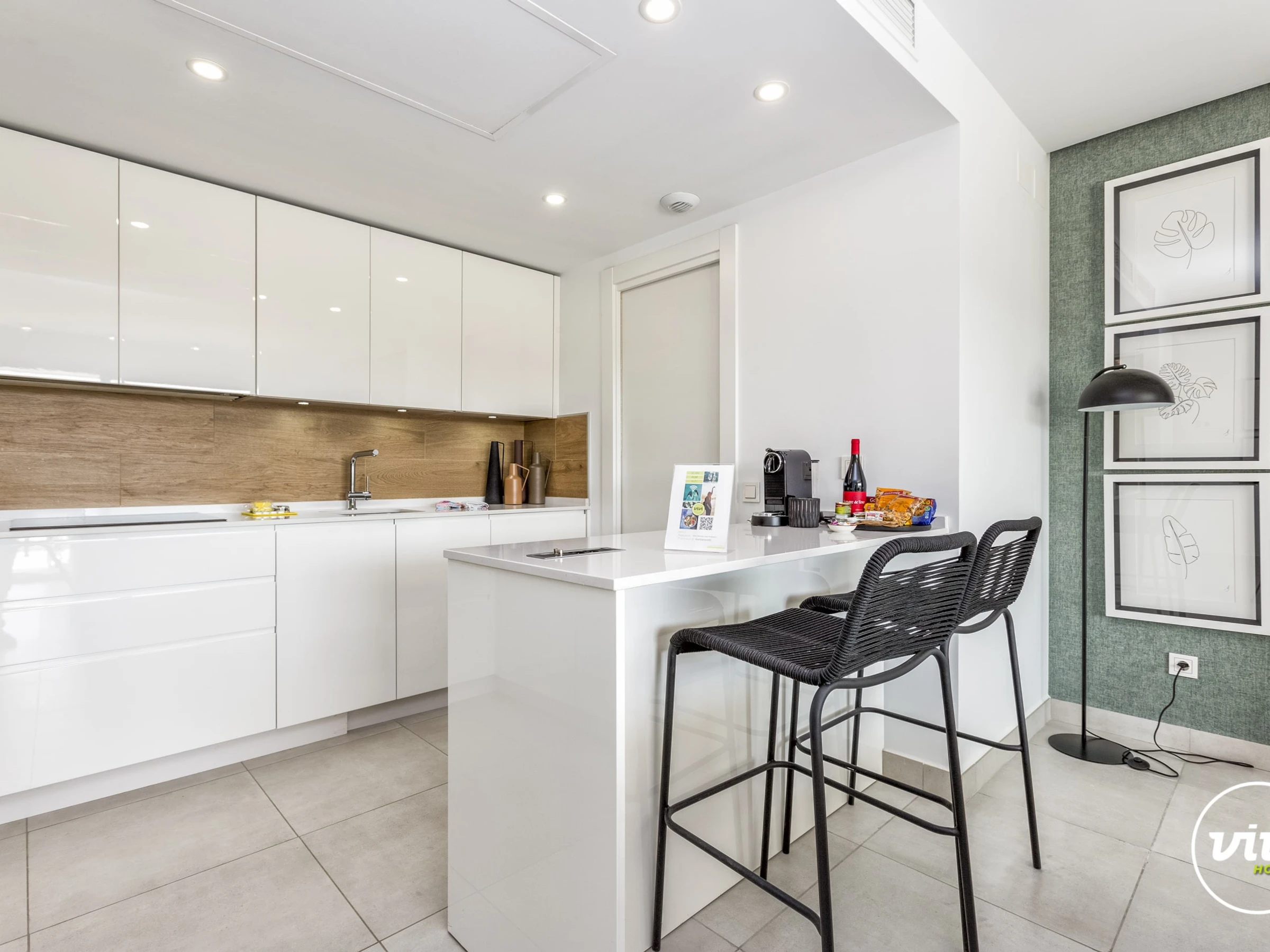 Dieses offene küche, mit induktions-kochfeld, ist ausgestattet in kühlschrank, mikrowelle, backofen, gefrierschrank, spülmaschine, geschirr/besteck, kochutensilien, kaffeemaschine, toaster, wasserkocher, saftpresse, küchengeschirr, herdplatte, teller und schüsseln.