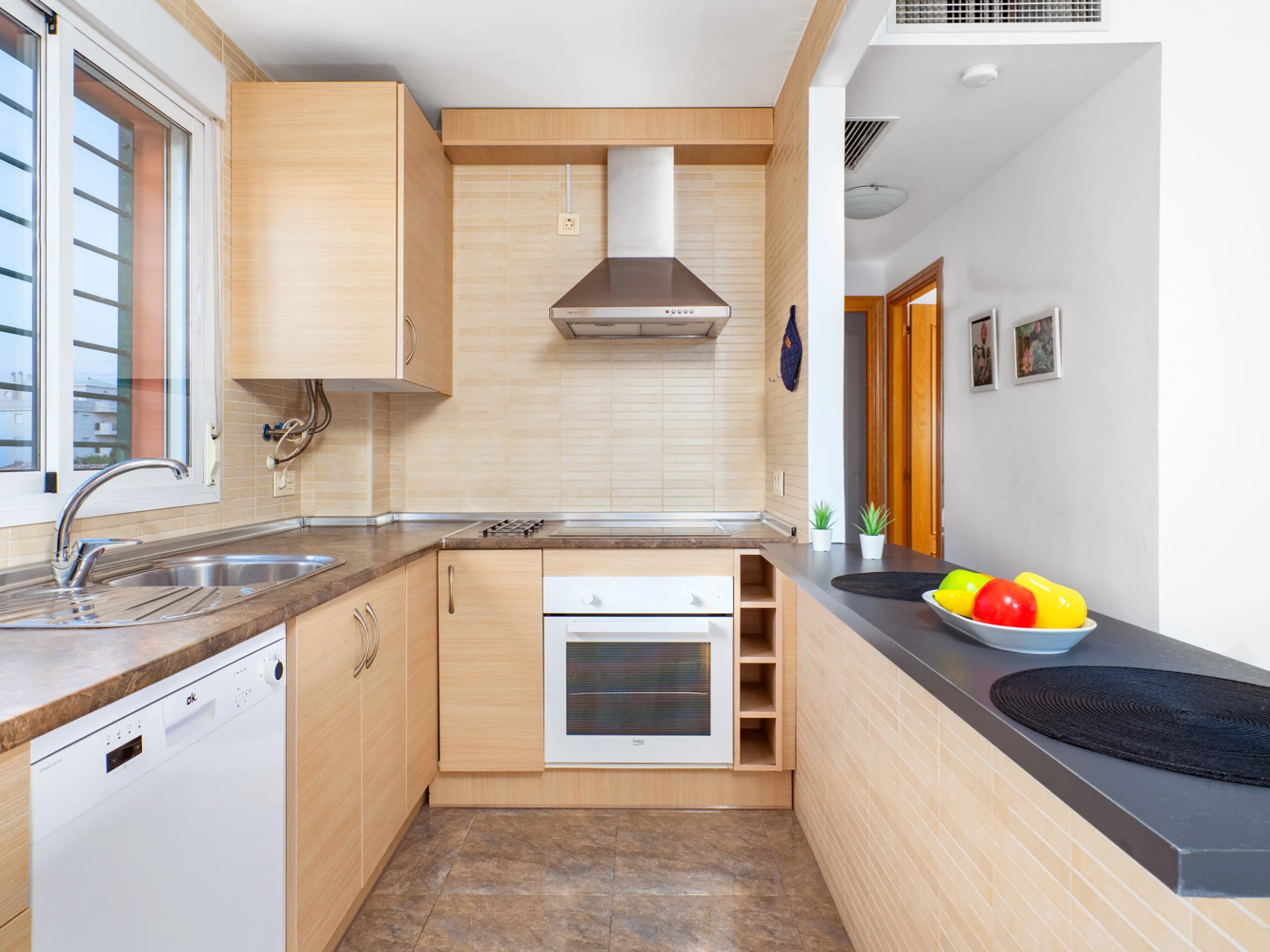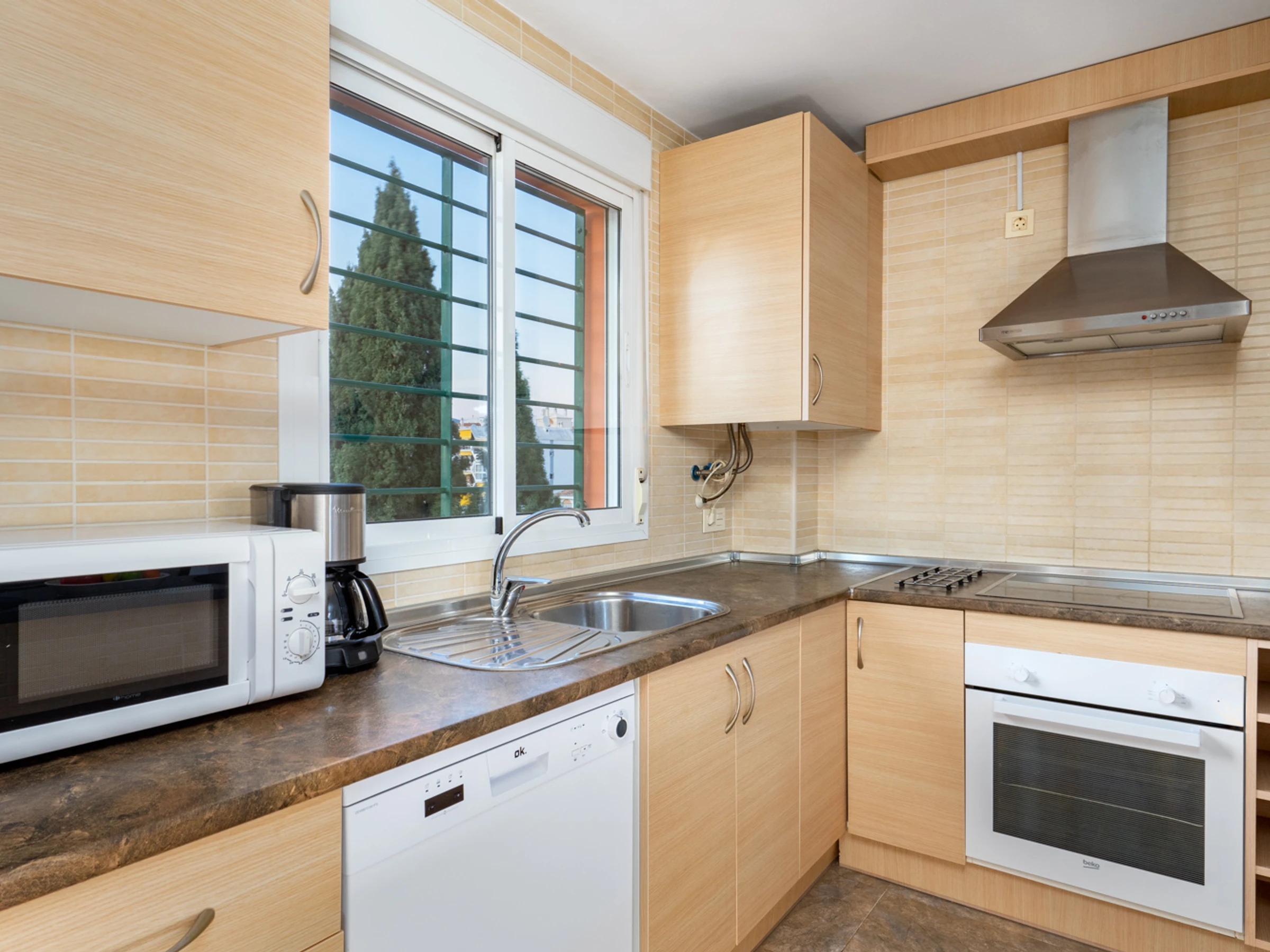 Dieses küche, ist ausgestattet in kühlschrank, mikrowelle, backofen, gefrierschrank, spülmaschine, kochutensilien, kaffeemaschine, toaster und wasserkocher.