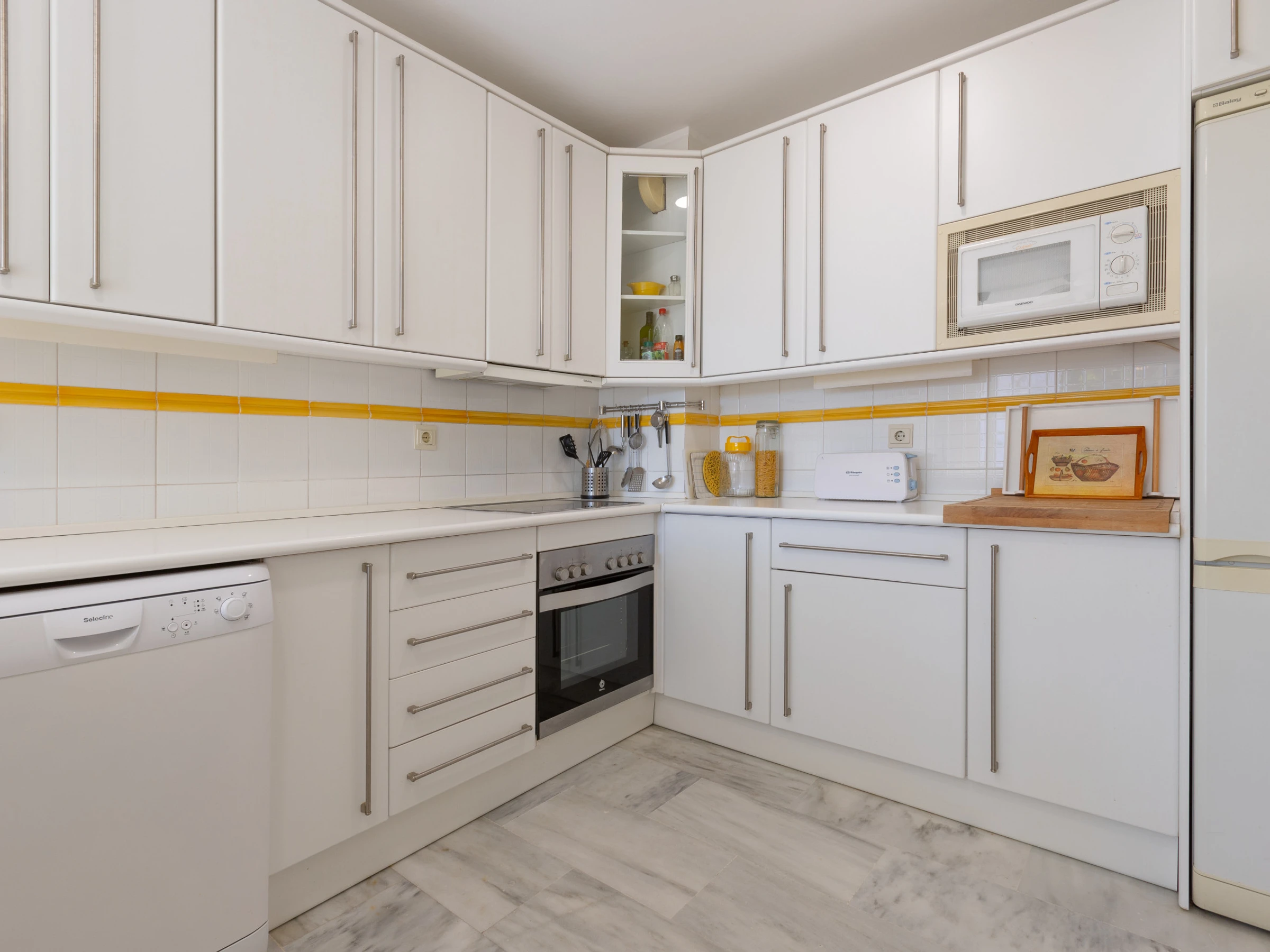 Dieses küche, ist ausgestattet in mikrowelle, gefrierschrank, spülmaschine, kaffeemaschine und toaster.