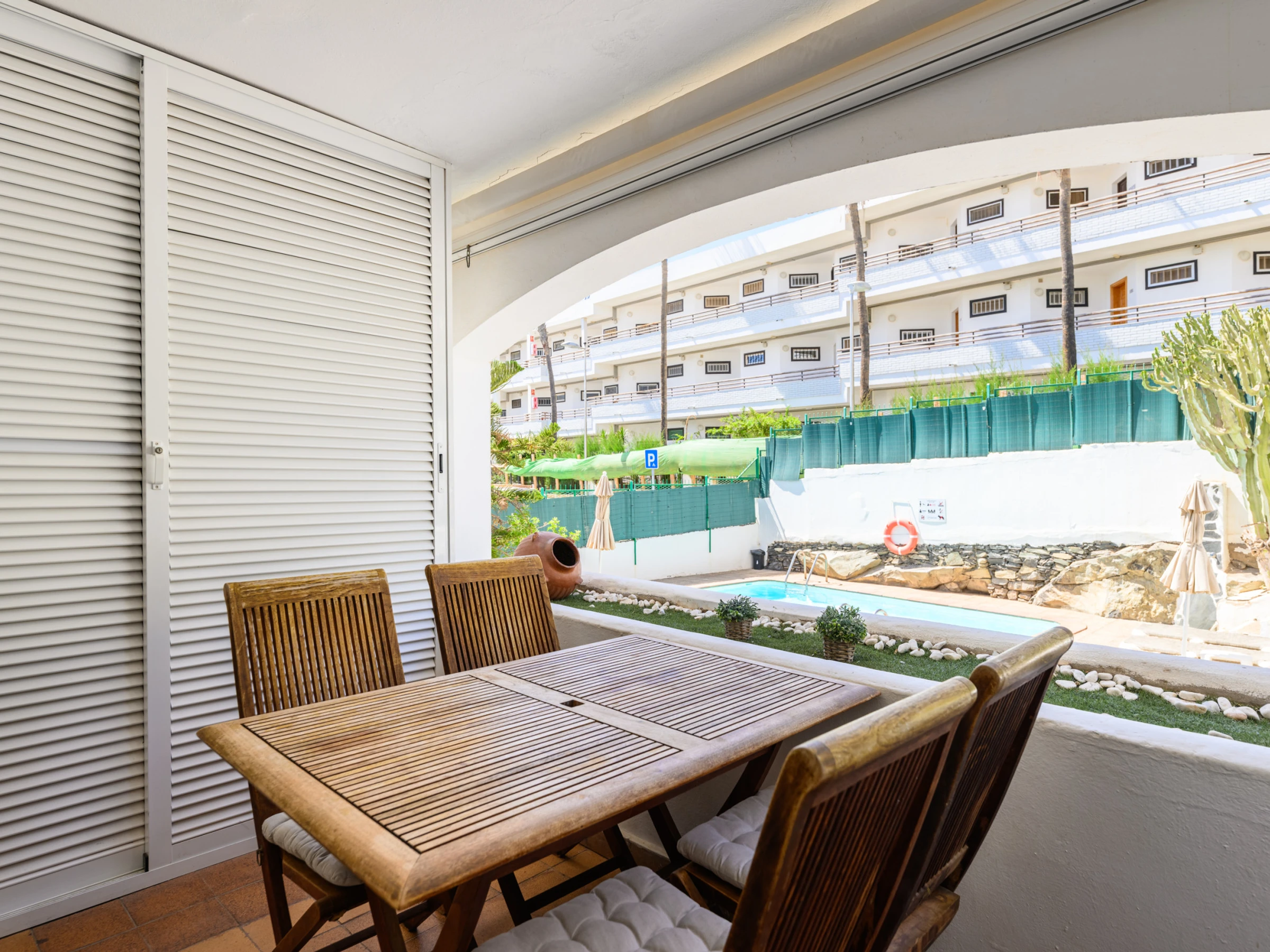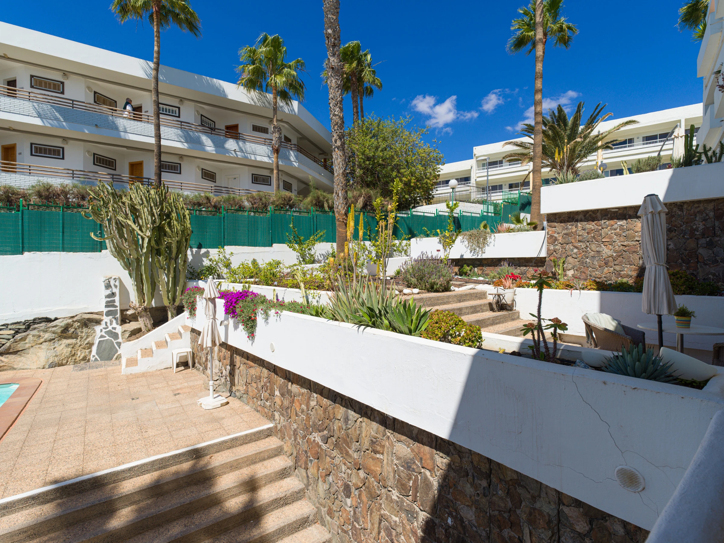 Herrliche Ferienwohnung in San Agustín, Süden von Gran Canaria, verwaltet von CanariasGetaway, mit 8m2 großer Terrasse mit Blick auf den Garten, den Pool und das Solarium, das mit Sonnenliegen ausgestattet ist, um die Ruhe beim Sonnenbaden zu genießen.