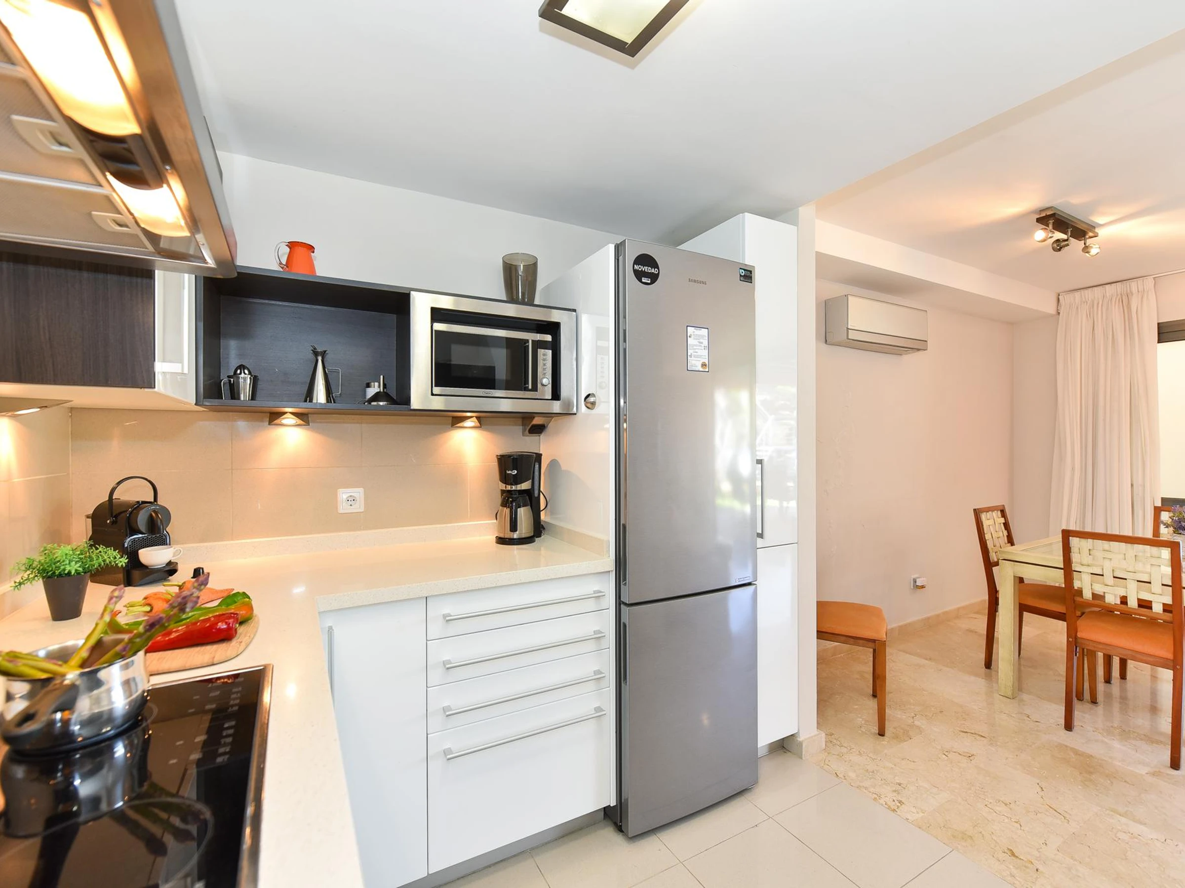 Dieses küche, ist ausgestattet in kühlschrank, mikrowelle, gefrierschrank, spülmaschine, kochutensilien, kaffeemaschine und toaster.