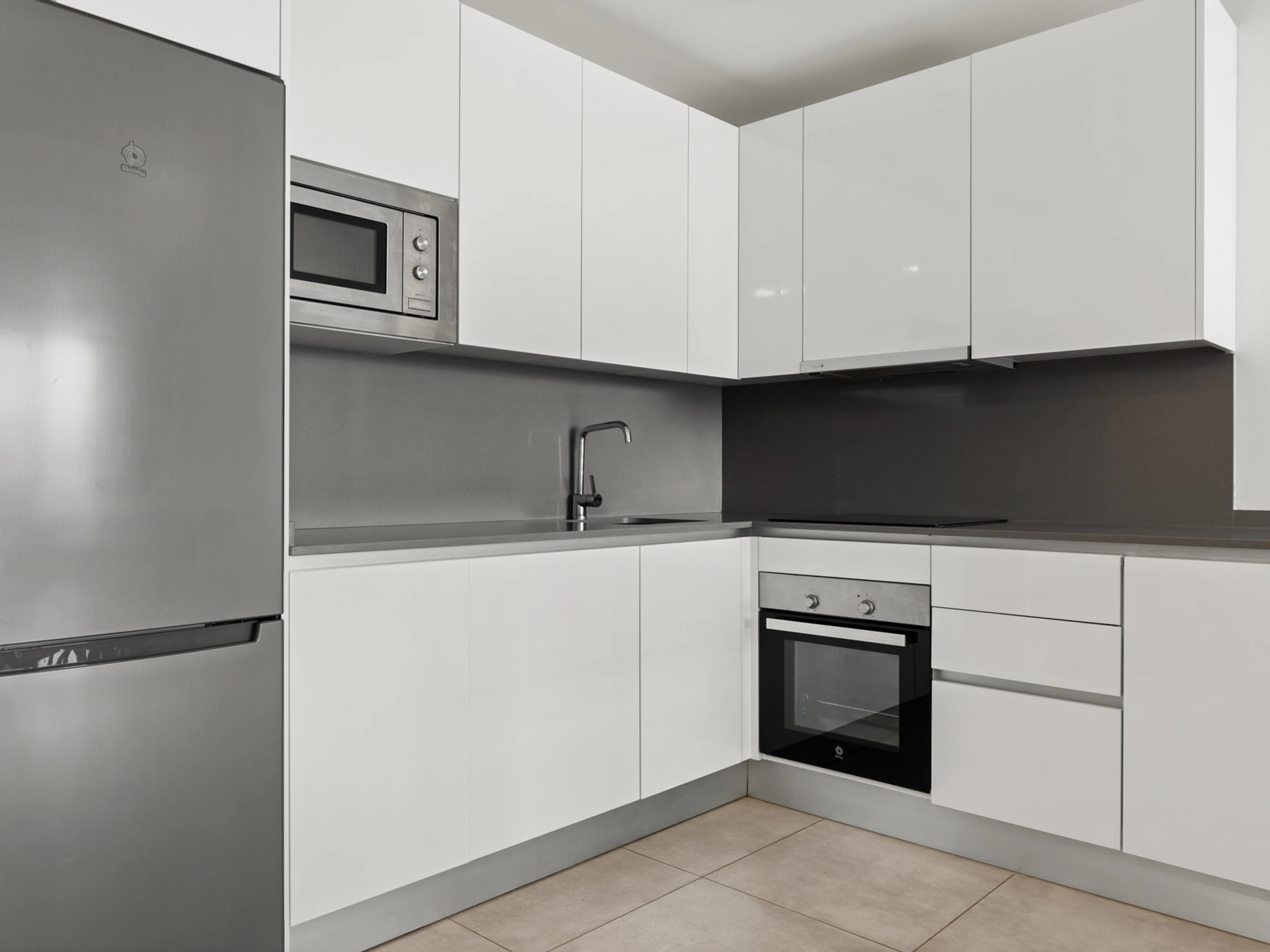 Dieses küche, ist ausgestattet in kühlschrank, mikrowelle, backofen, gefrierschrank, spülmaschine, kochutensilien, kaffeemaschine, toaster und wasserkocher.
