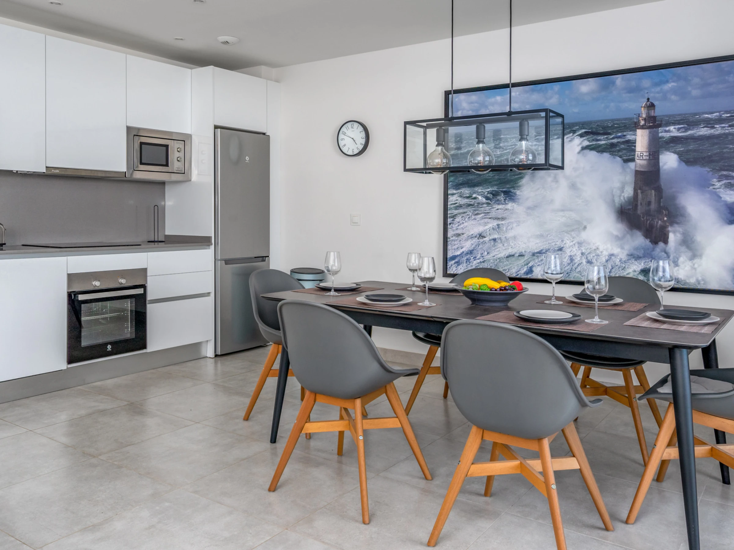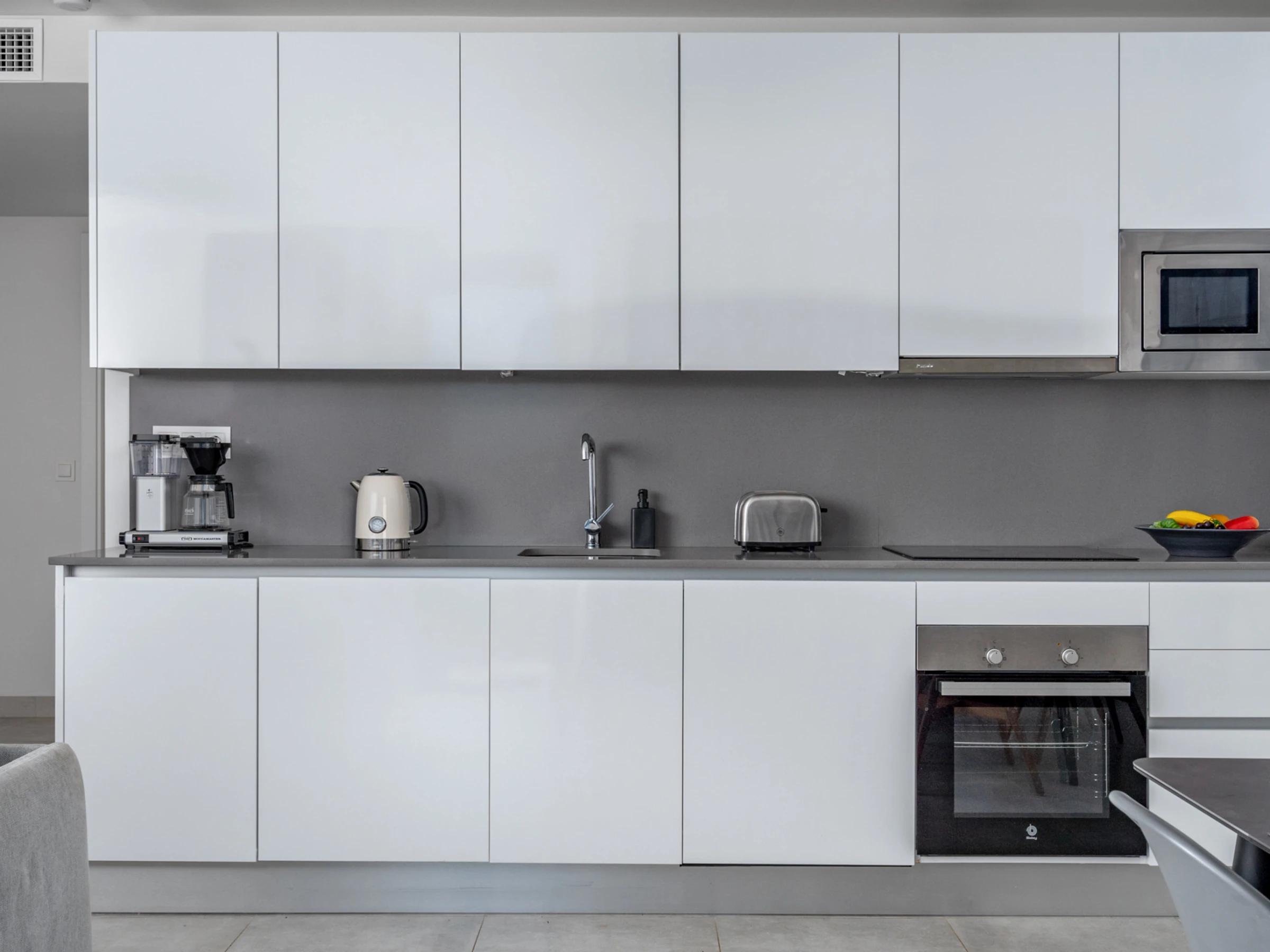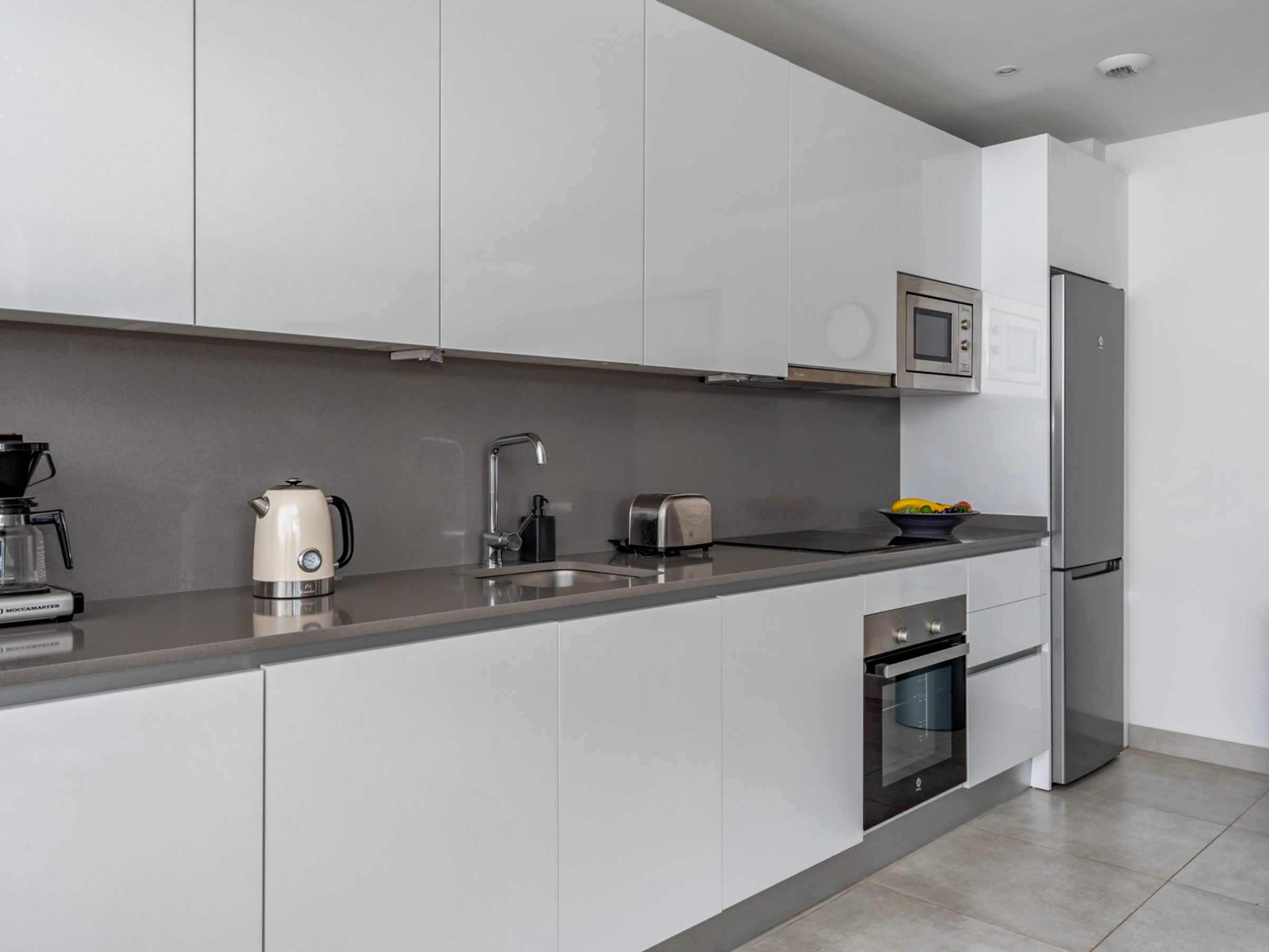 Dieses küche, ist ausgestattet in kühlschrank, mikrowelle, backofen, gefrierschrank, spülmaschine, kochutensilien, kaffeemaschine, toaster und wasserkocher.