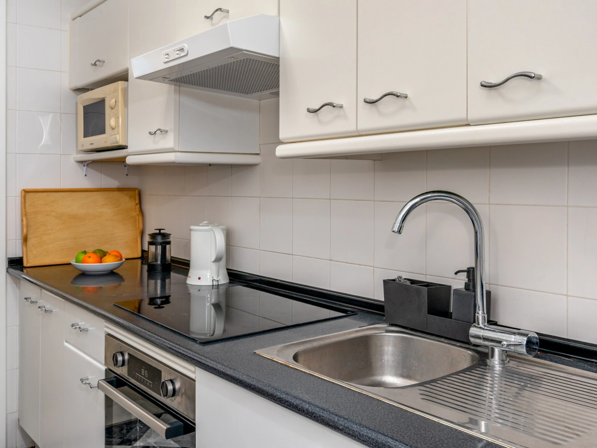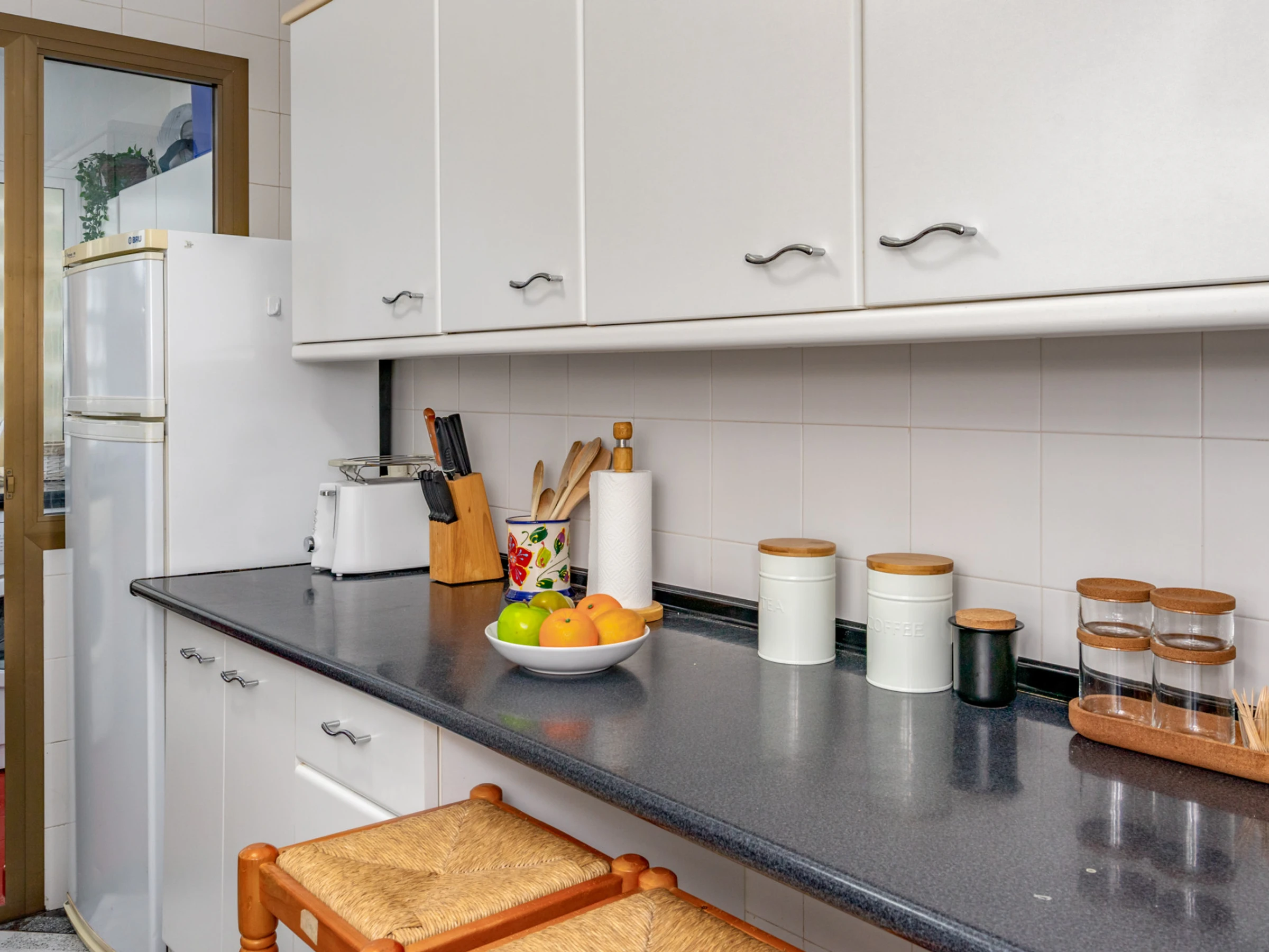 Dieses küche, ist ausgestattet in kühlschrank, mikrowelle, backofen, gefrierschrank, spülmaschine, kochutensilien, toaster und wasserkocher.