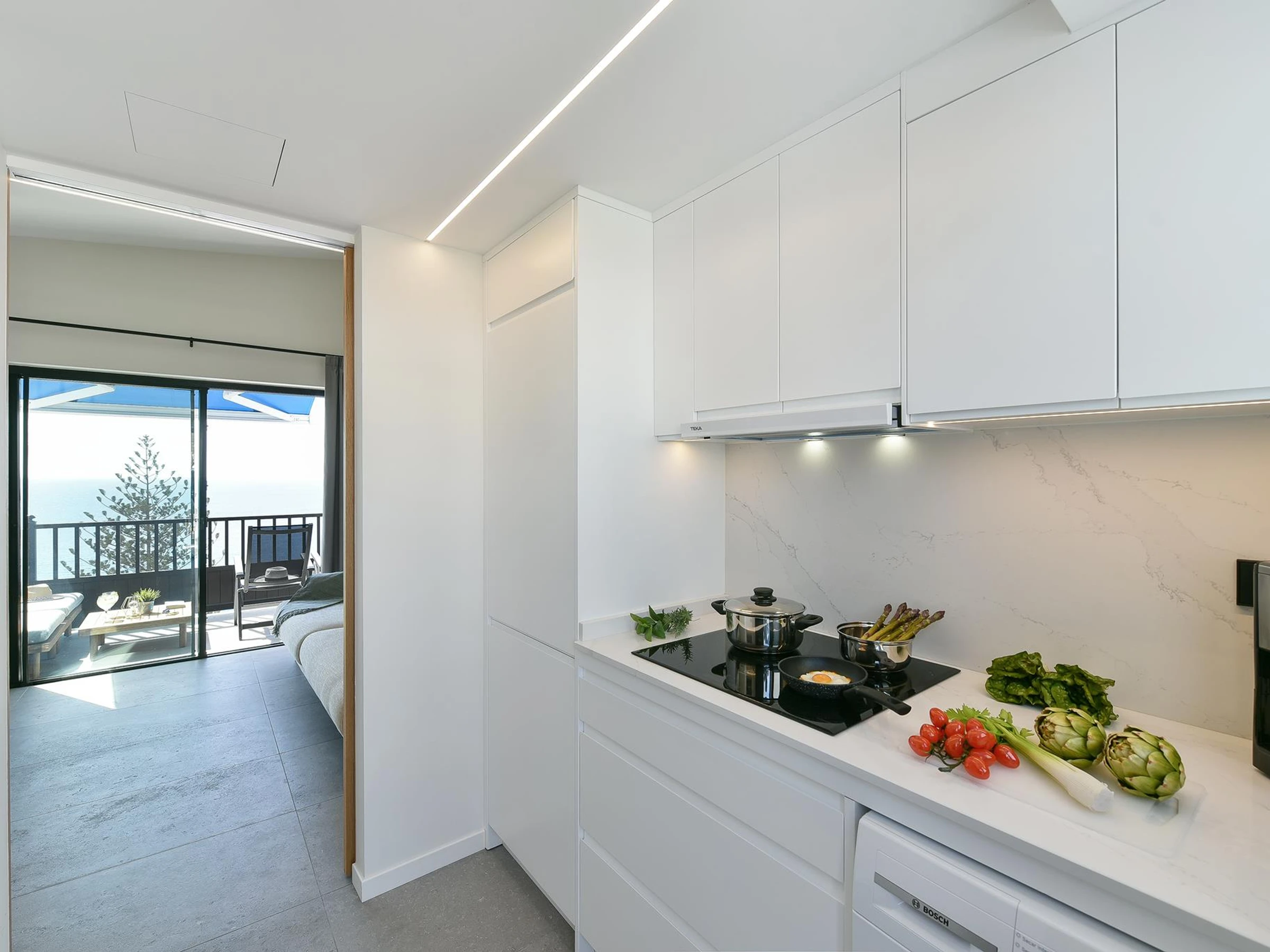 Dieses küche, ist ausgestattet in kühlschrank, spülmaschine, kochutensilien, kaffeemaschine, toaster und wasserkocher.