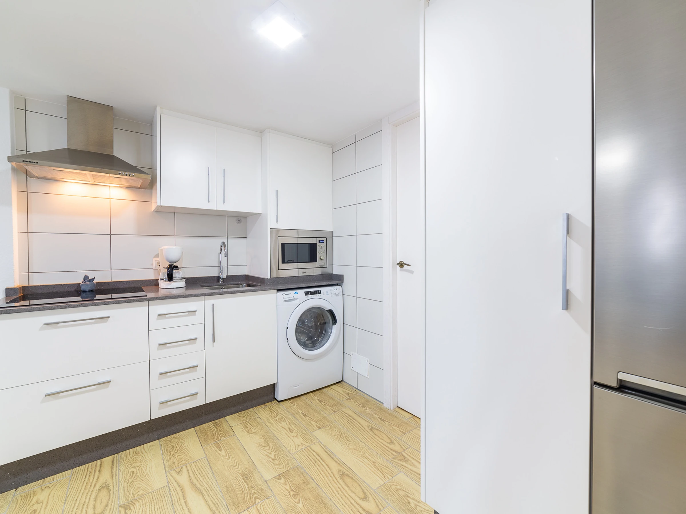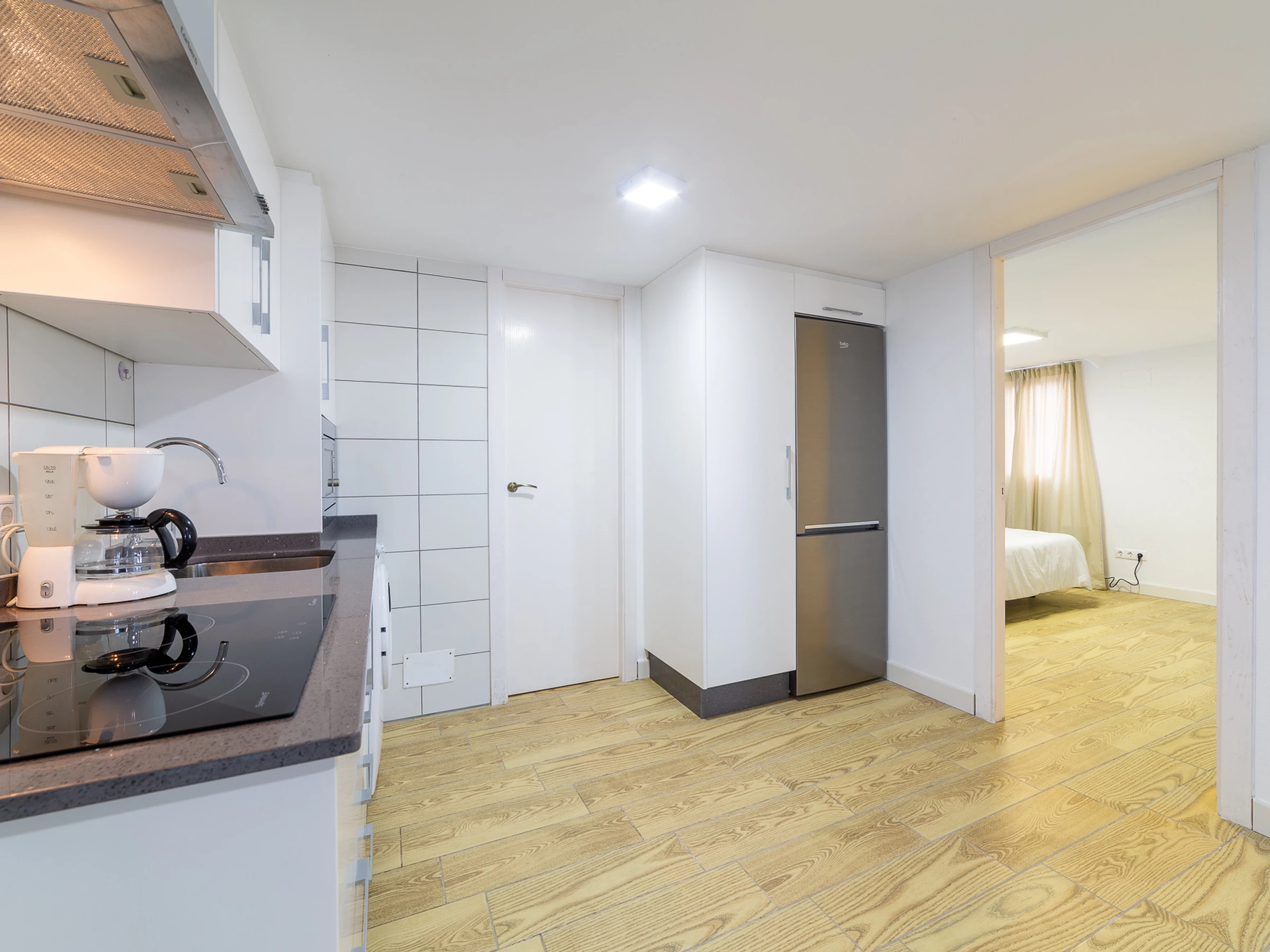 Dieses offene küche, mit ceranfeld, ist ausgestattet in kühlschrank, mikrowelle, gefrierschrank, geschirr/besteck, kochutensilien, kaffeemaschine, toaster, wasserkocher und saftpresse.