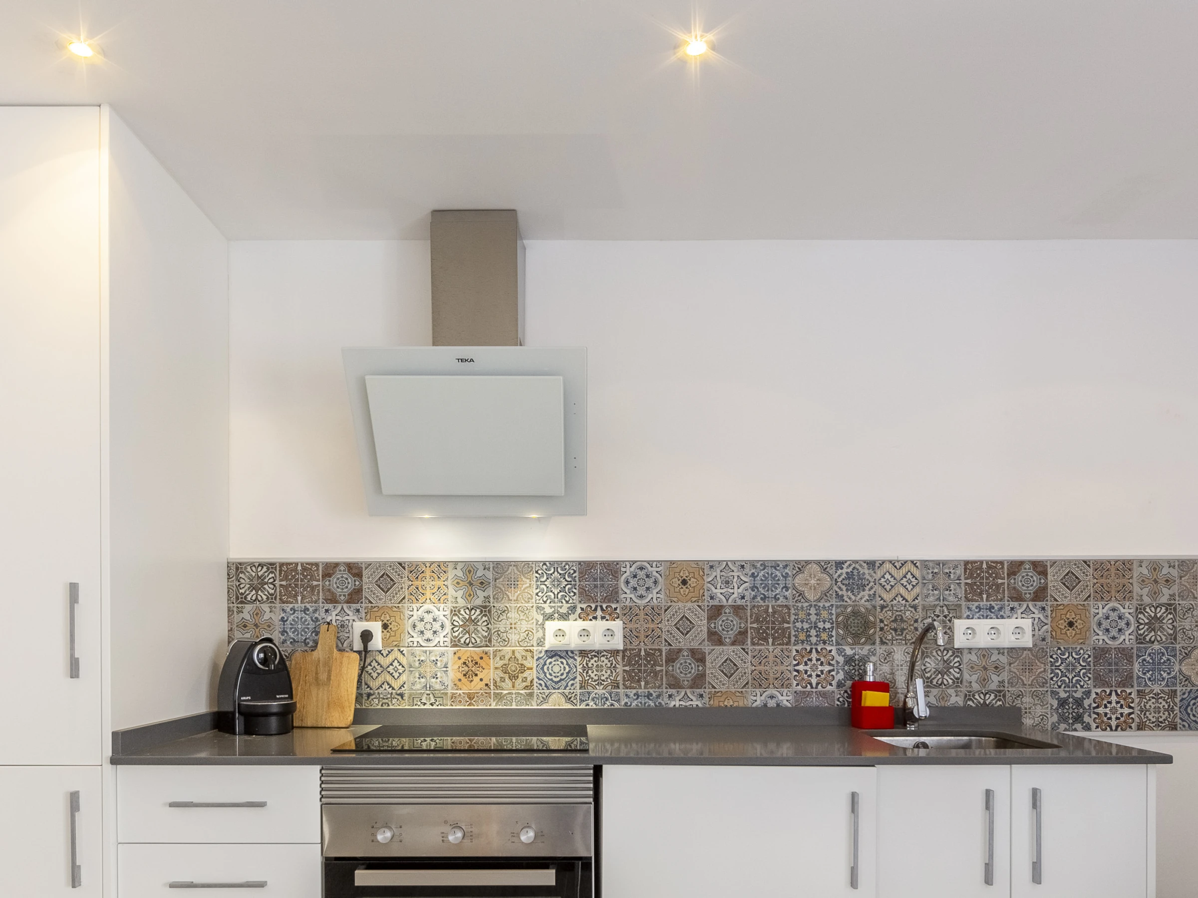 Dieses offene küche, mit ceranfeld, ist ausgestattet in kühlschrank, mikrowelle, backofen, gefrierschrank, geschirr/besteck, kochutensilien, kaffeemaschine, toaster und wasserkocher.