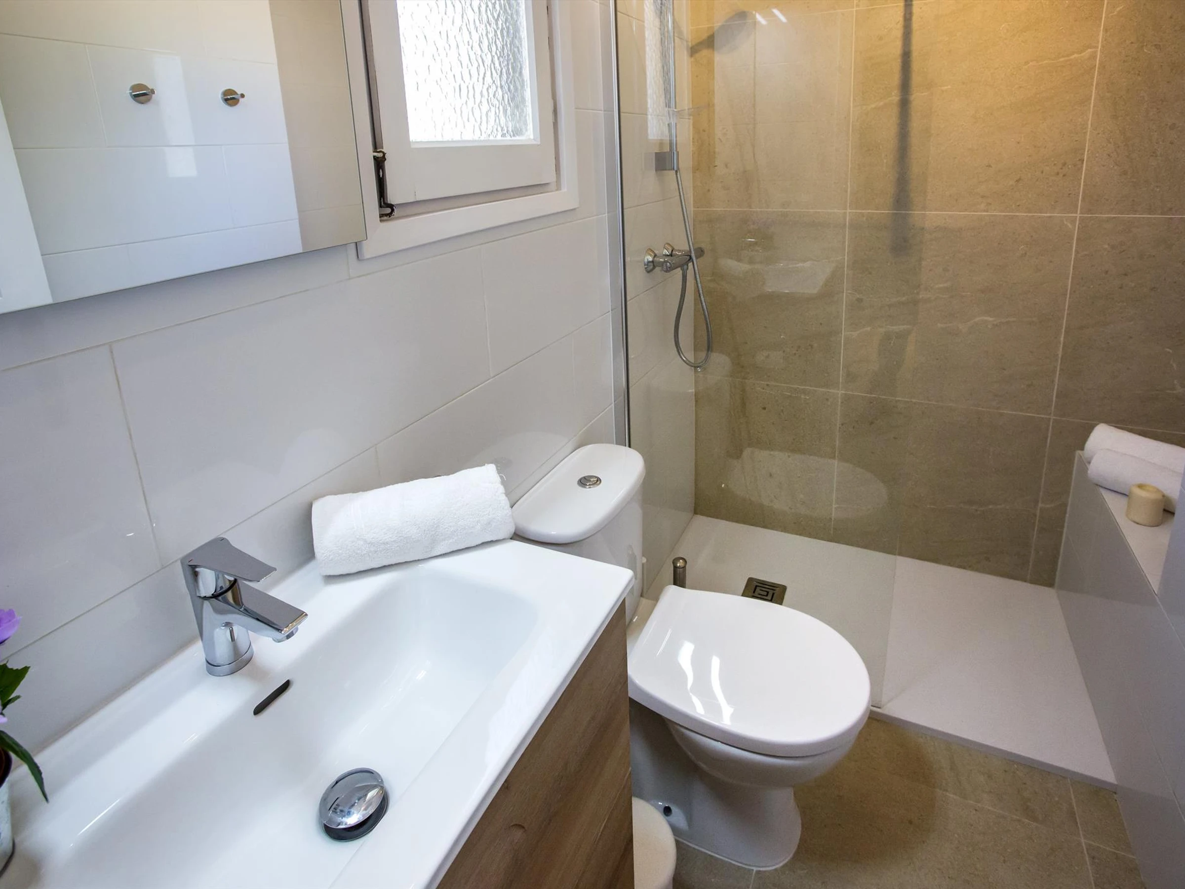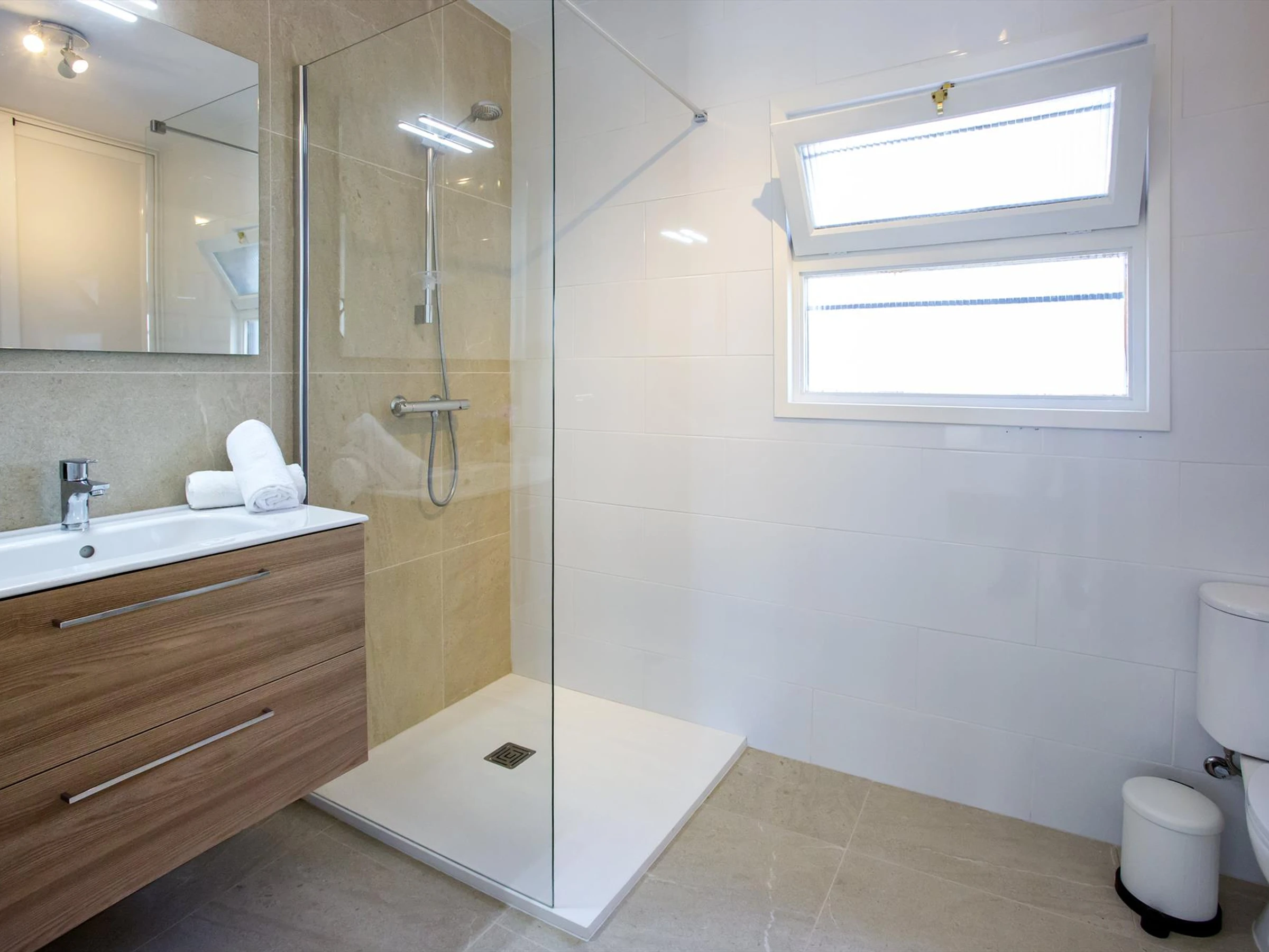 * eigenes Badezimmer mit Einzelwaschbecken, Dusche und Toilette