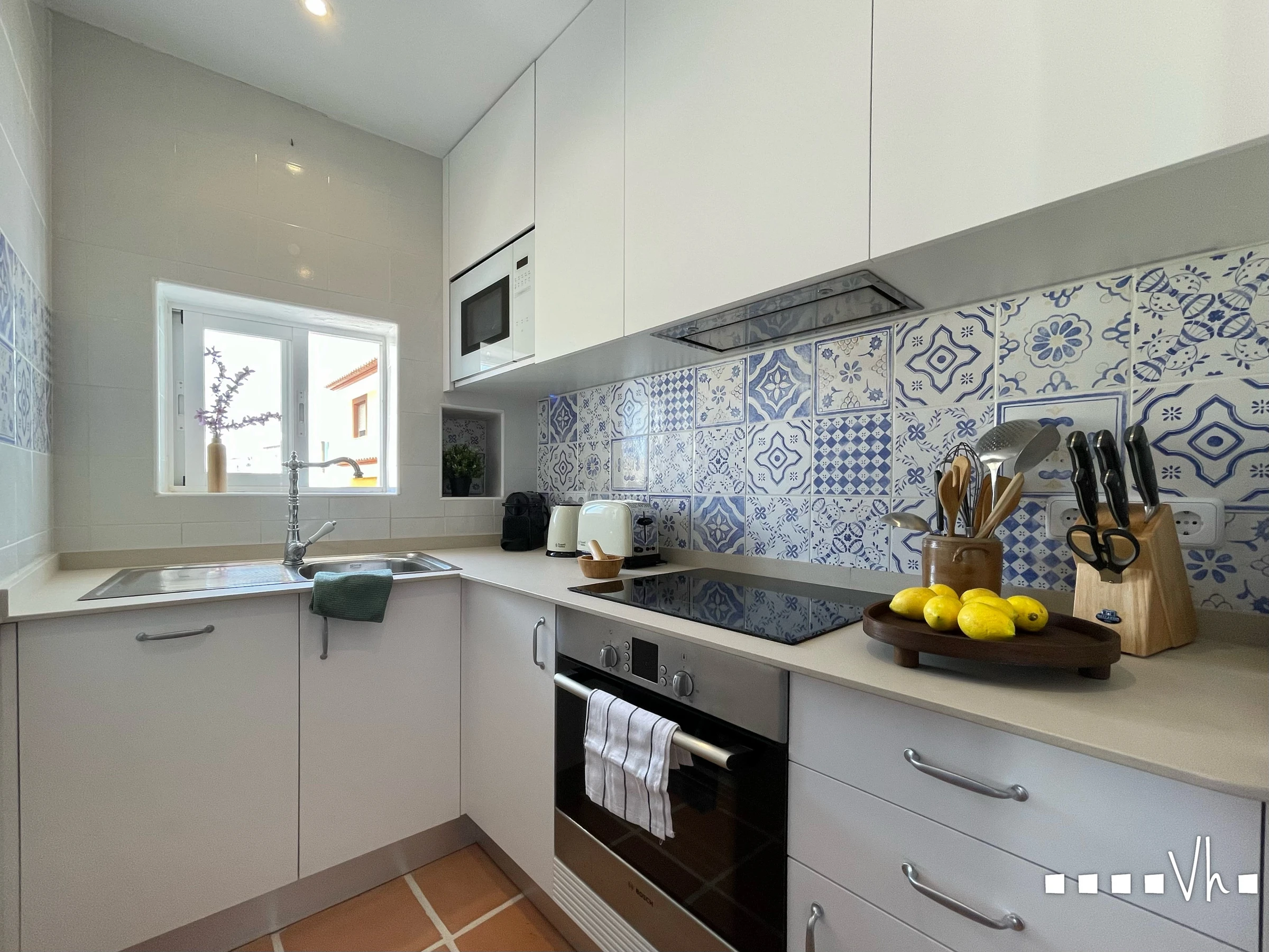 Die Küche, modern und funktional, ist mit allem ausgestattet, was Sie für Ihren Urlaub benötigen. Die Wohnung verfügt über zwei Schlafzimmer, eines mit einem Doppelbett und das andere mit zwei Einzelbetten, sowie ein Badezimmer mit Dusche. Alle Räume sind klimatisiert.
