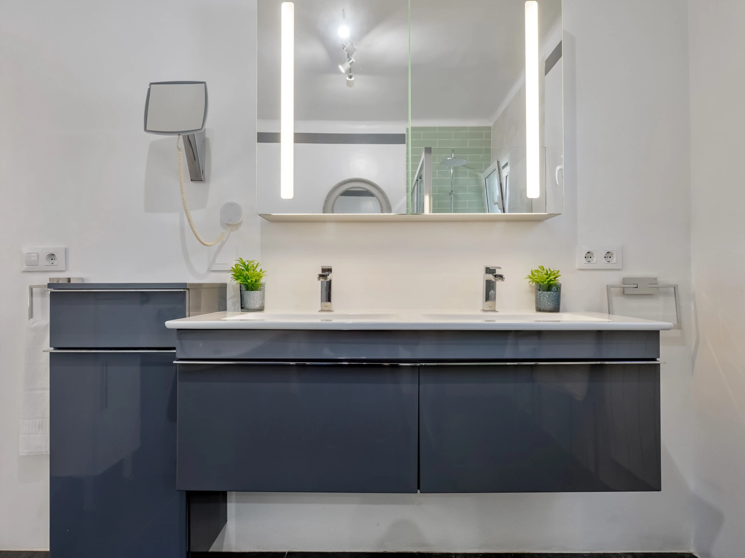 Im Erdgeschoss finden Sie ein Schlafzimmer mit zwei 80cm/[hidden]cm Boxspringbetten und Deckenventilator, ein weiteres Schlafzimmer mit einem 90cm/[hidden]cm Boxspringbett und Deckenventilator, ein drittes Schlafzimmer mit Doppel-Boxspringbett (2 untrennbare 80cm/[hidden]cm Matratzen), Deckenventilator und en-suite Badezimmer mit Regendusche, Wohnzimmer mit Klimaanlage und einem zweiten Fernseher mit Chromecast für mehr Unterhaltungsmöglichkeiten, Esstisch für sechs Personen, eine weitere voll ausgestattete Gasküche mit Backofen, Geschirrspüler, Kühl- und Gefrierschrank und ein Badezimmer mit begehbarer Regendusche.